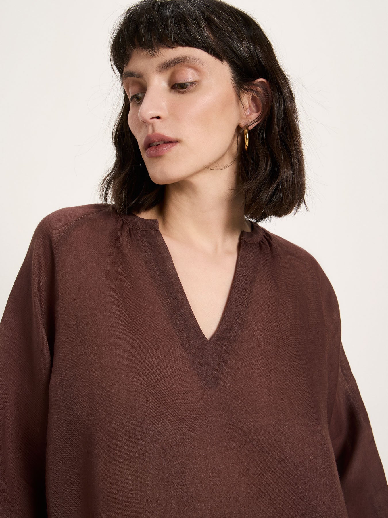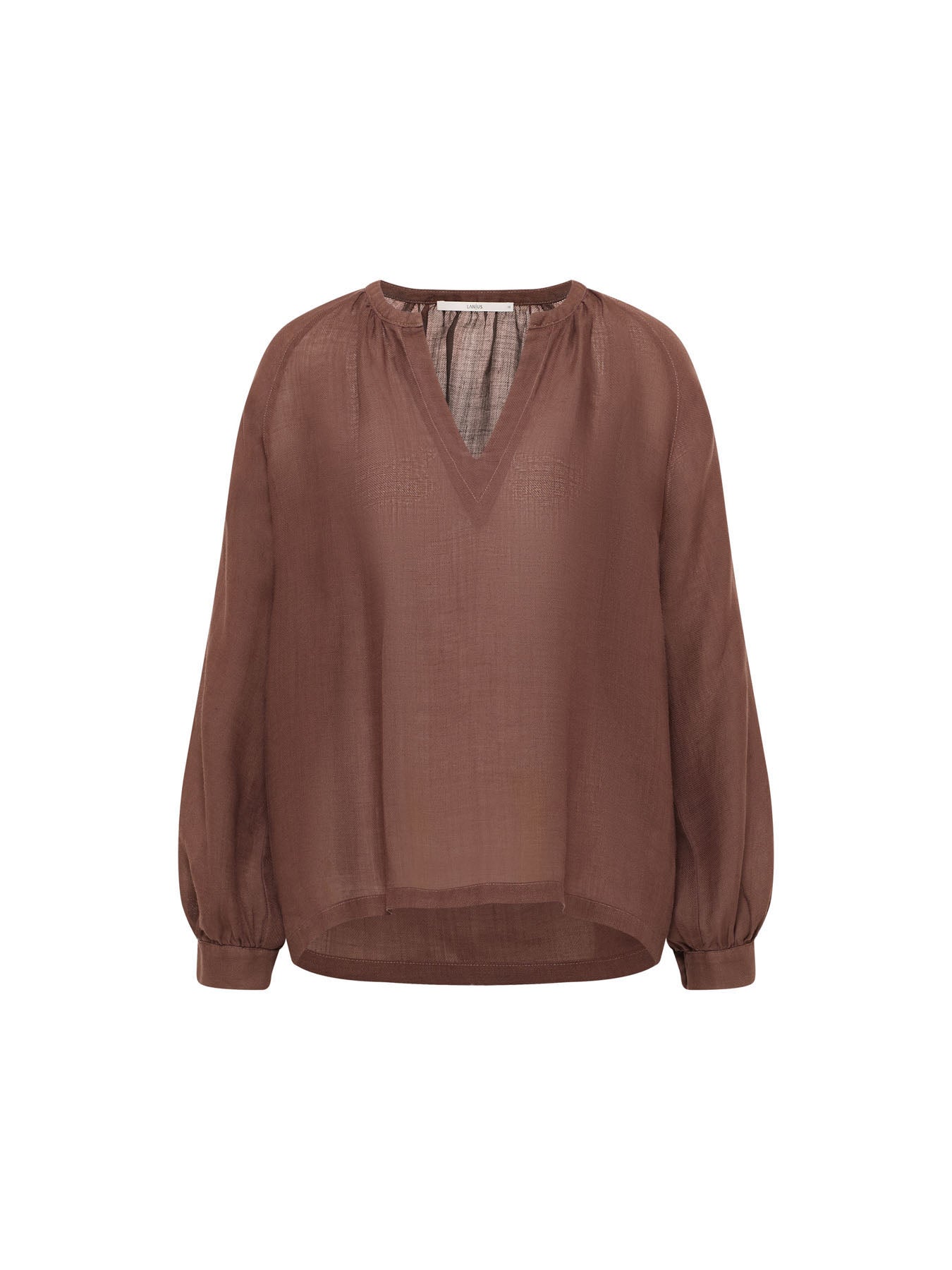Diese Bluse aus leichtem Ramie-Material überzeugt durch ihre weich fließende Qualität und eine entspannte Silhouette. Der dezente V-Ausschnitt und die feinen Raffungen im Schulterbereich verleihen dem Design eine subtile Eleganz. Angenehm leicht auf der Haut und vielseitig kombinierbar!