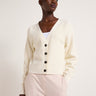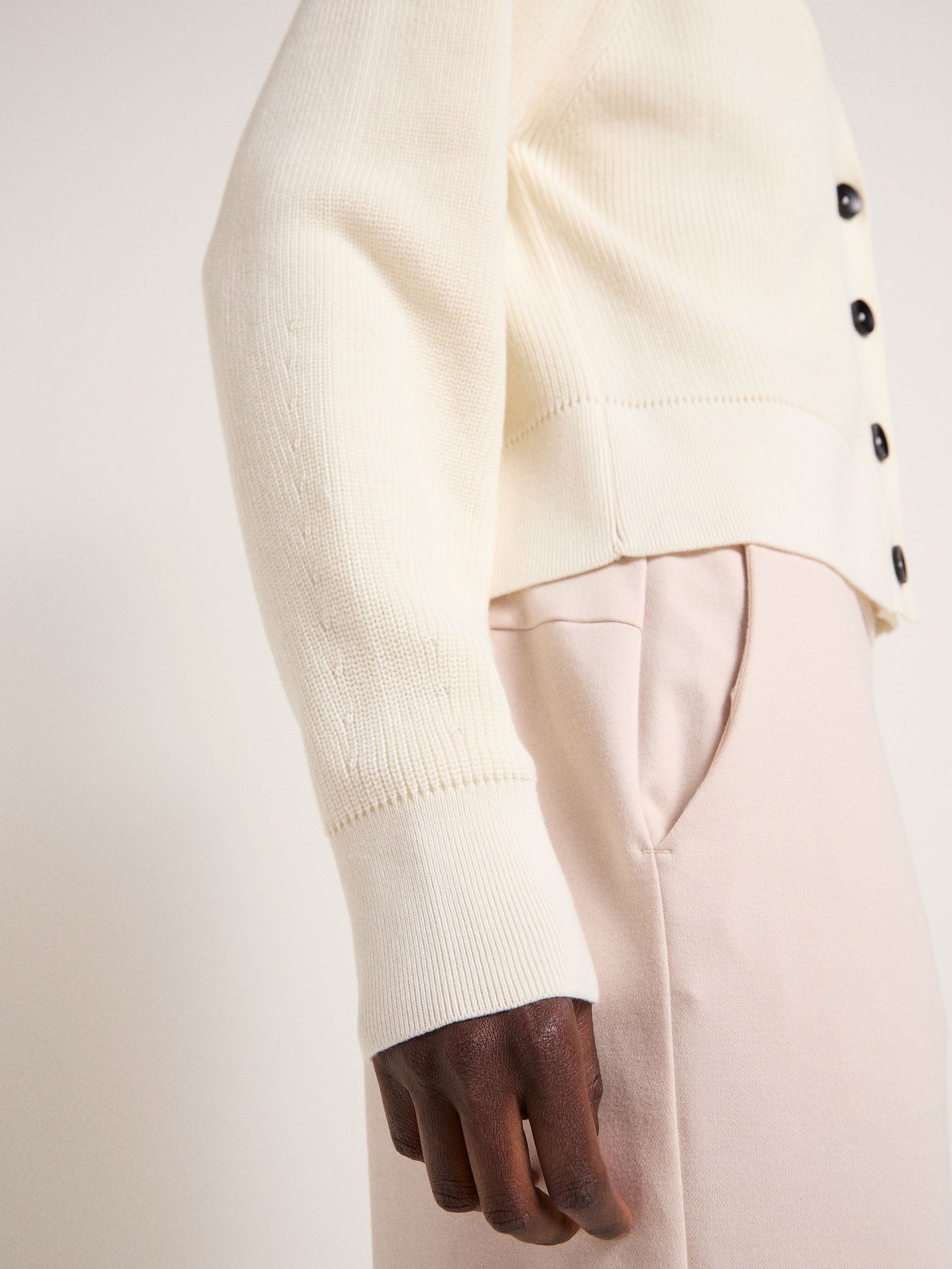 Der kurze Strickcardigan aus hochwertiger Bio-Baumwolle ist perfekt zum Layering im Herbst oder Winter. Die gerade Passform und farblich abgesetzten Knöpfe sind modische Details der Strickjacke. Das grobe Strickmuster wirkt wunderbar weich und feminin. Zu weiter Hose und Kleid entsteht eine moderne Silhouette mit mehreren Lagen. Jetzt in drei modischen Farben entdecken!