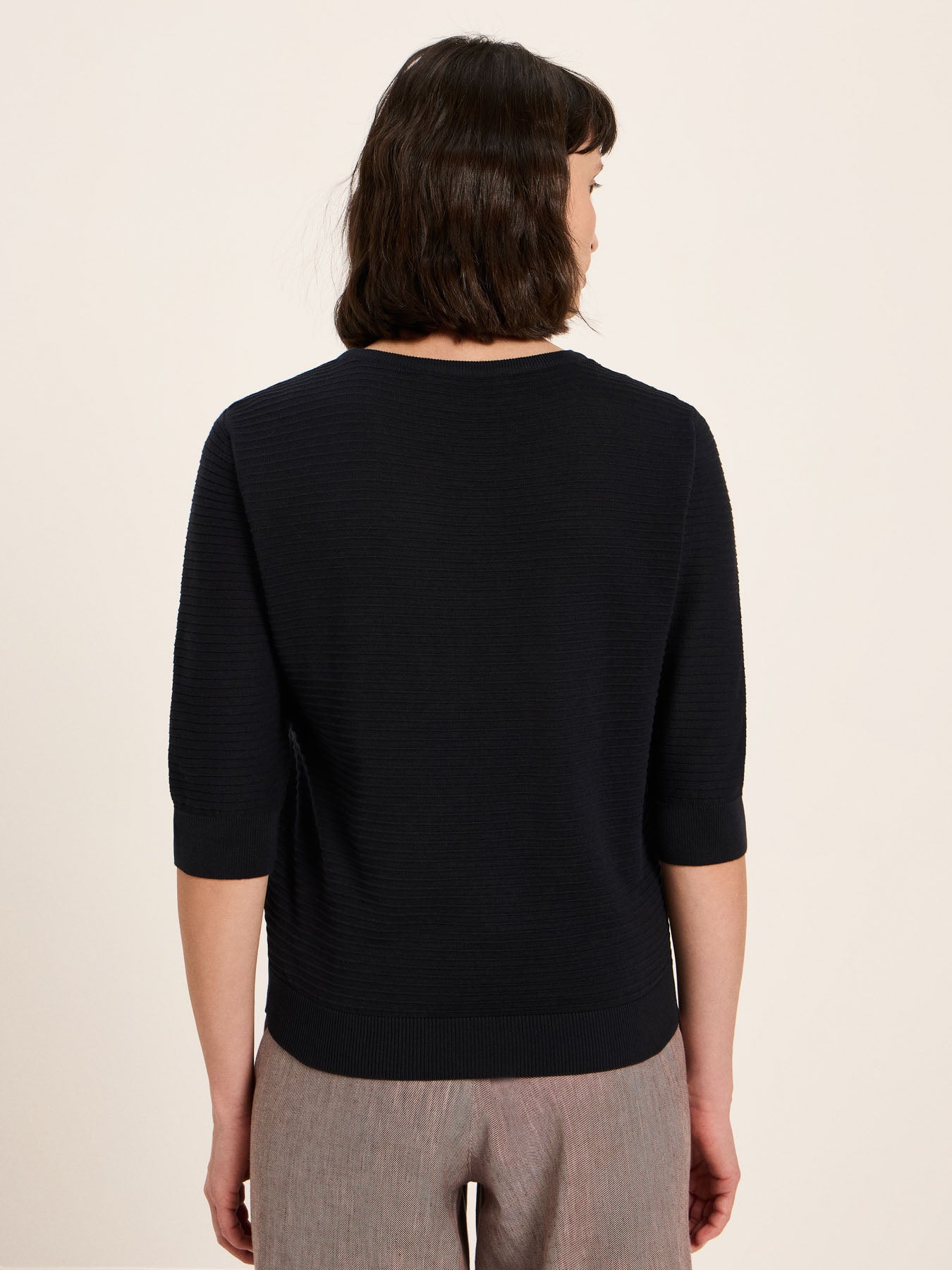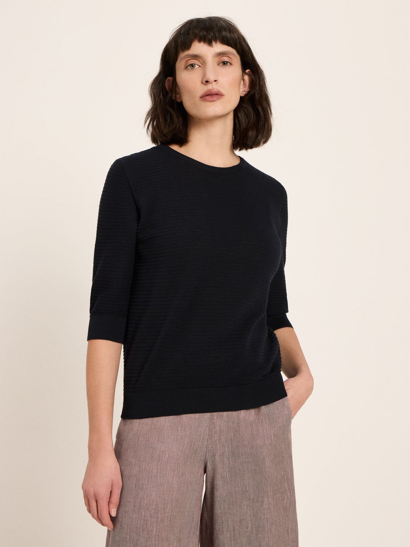 Mit seinem minimalistischen Design ist dieser Halbarmpullover aus hochwertiger Bio-Baumwolle sowohl für entspannte als auch elegantere Outfits die perfekte Wahl. Er besticht durch seine feine Struktur und den angenehm weichen Tragekomfort. Ideal für die Übergangszeit oder als leichter Layer zu jedem Look.