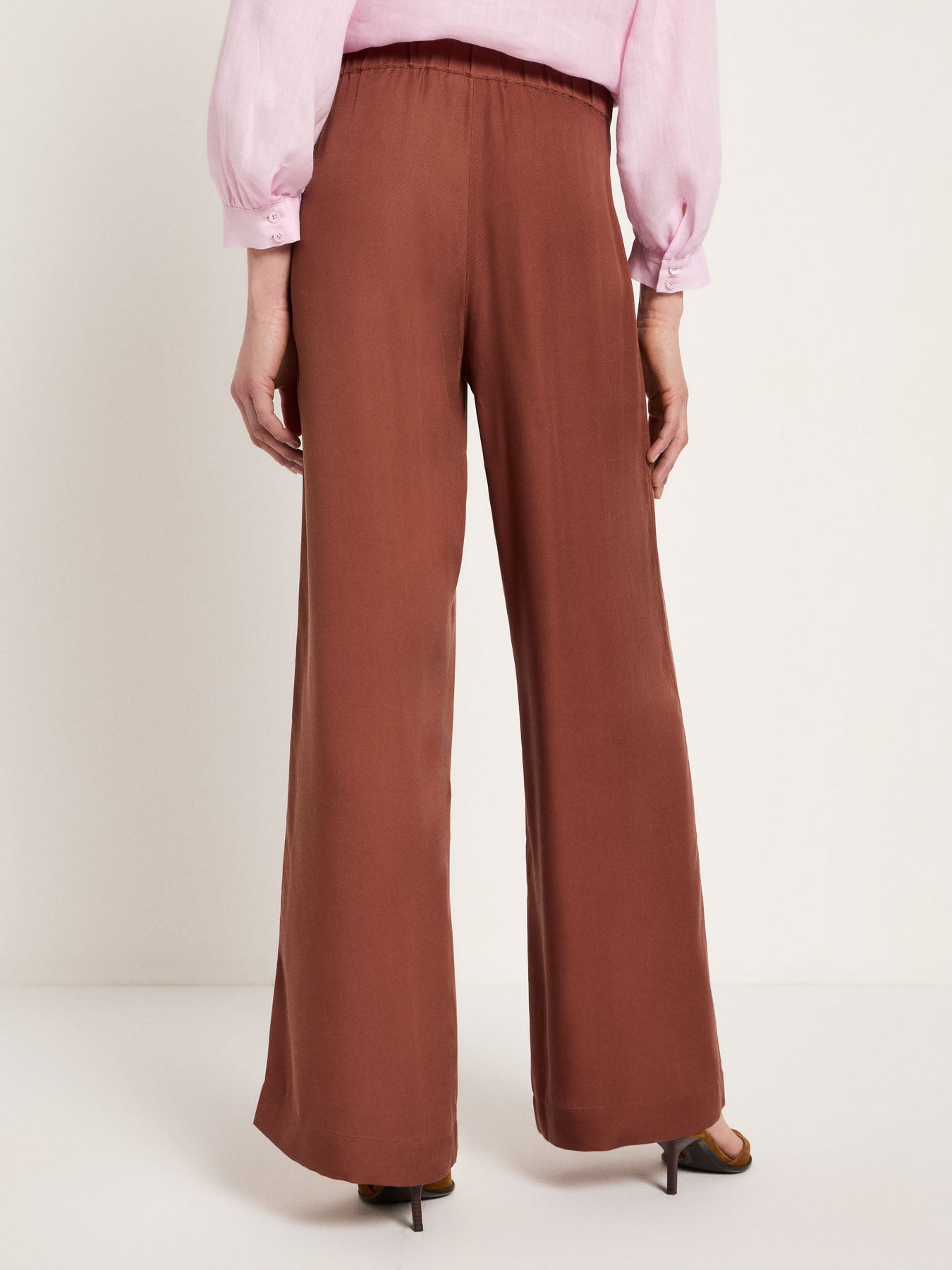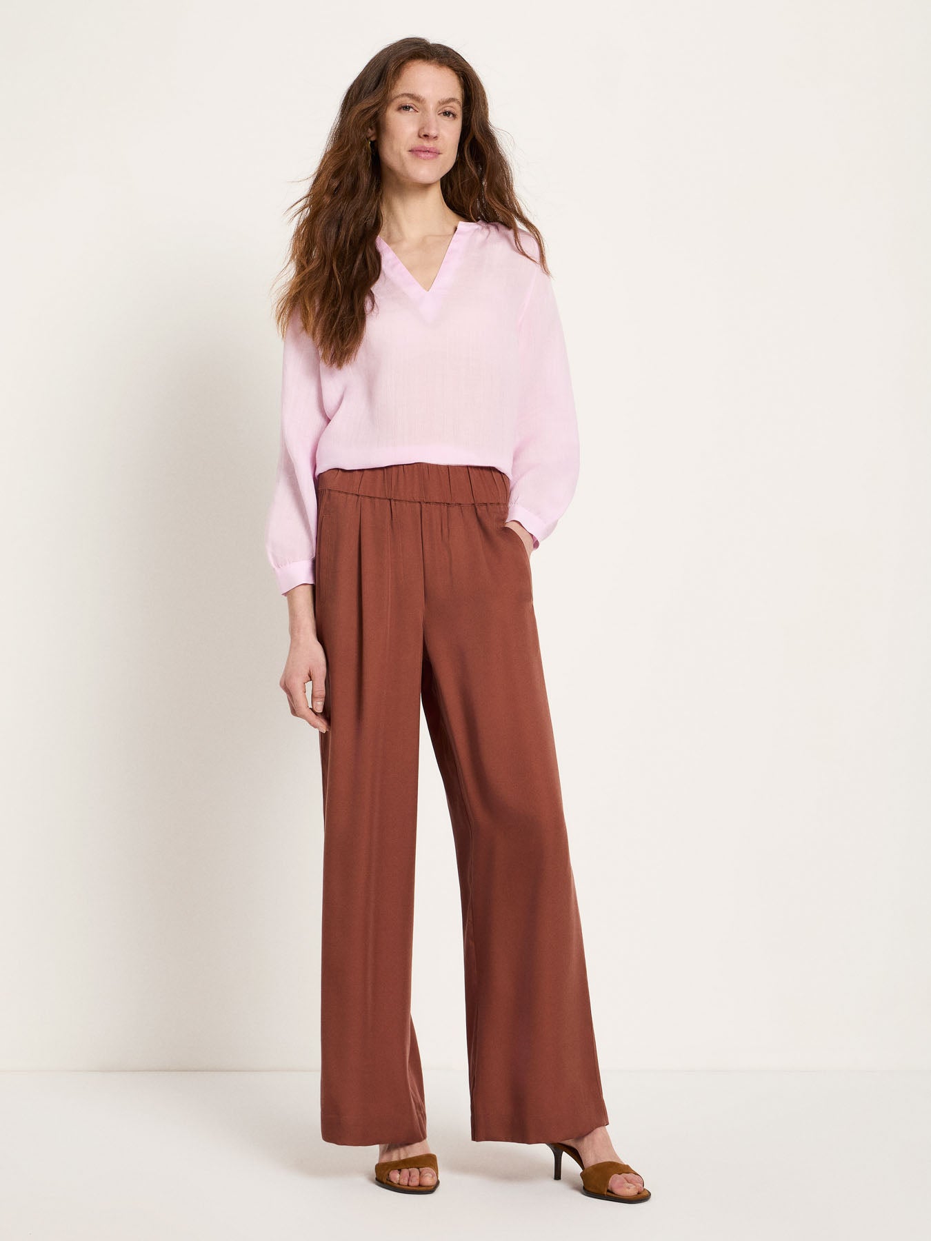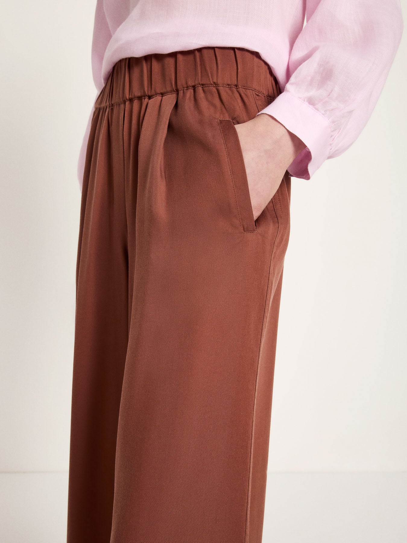 Fließend, weich und unkompliziert elegant: Die Hose mit weitem Bein aus TENCEL™ Lyocell überzeugt durch ihren geschmeidigen Fall, eine angenehm glatte Haptik und femininen Komfort. Der elastische Bund sorgt für eine flexible Passform, während Bundfalten und die lange, gerade Silhouette eine ruhige, stilvolle Linienführung schaffen. Vegan gefertigt – perfekt für bewusste Looks im Alltag oder kombiniert mit der passenden Bluse als unkompliziertes Set.