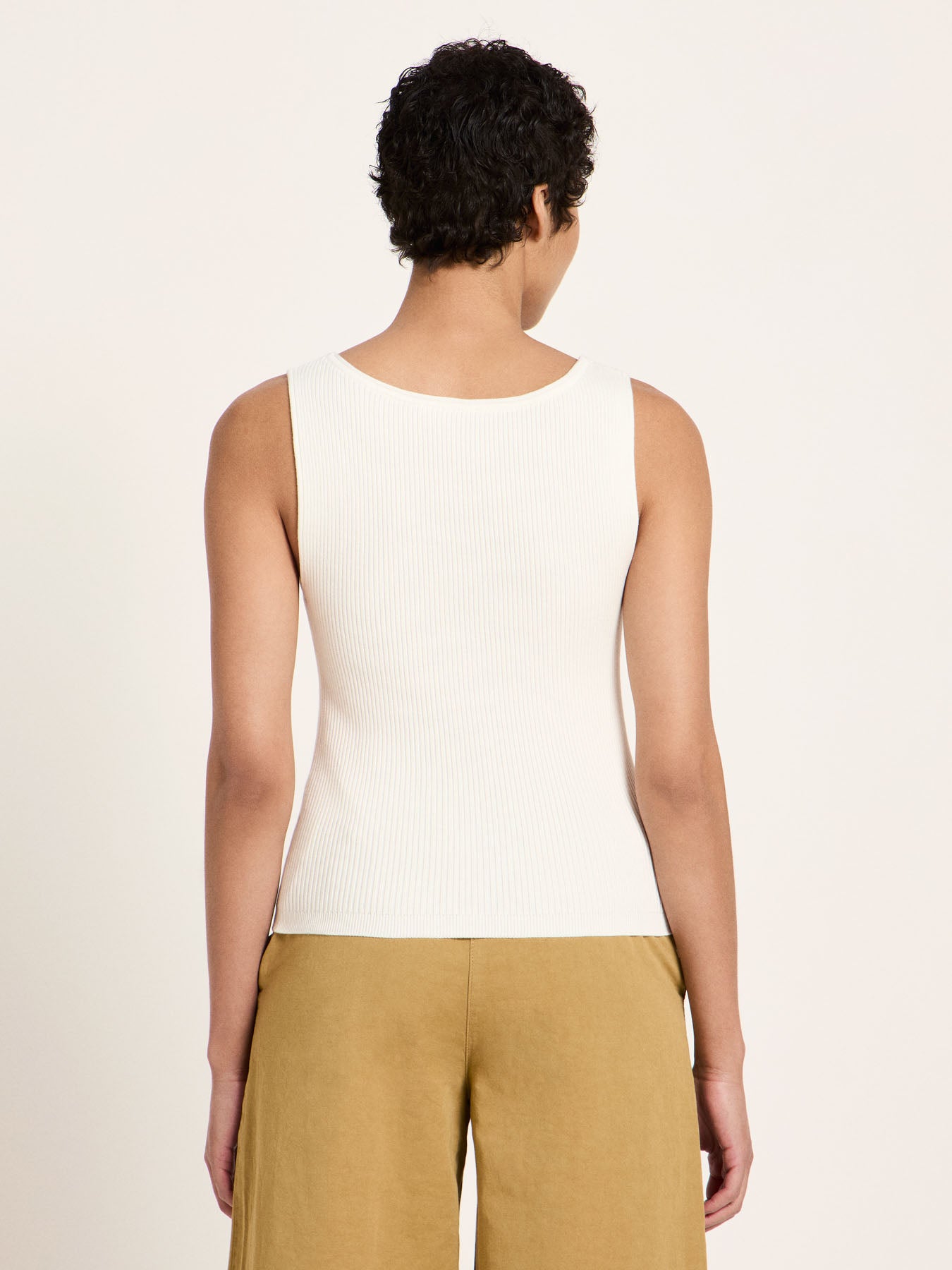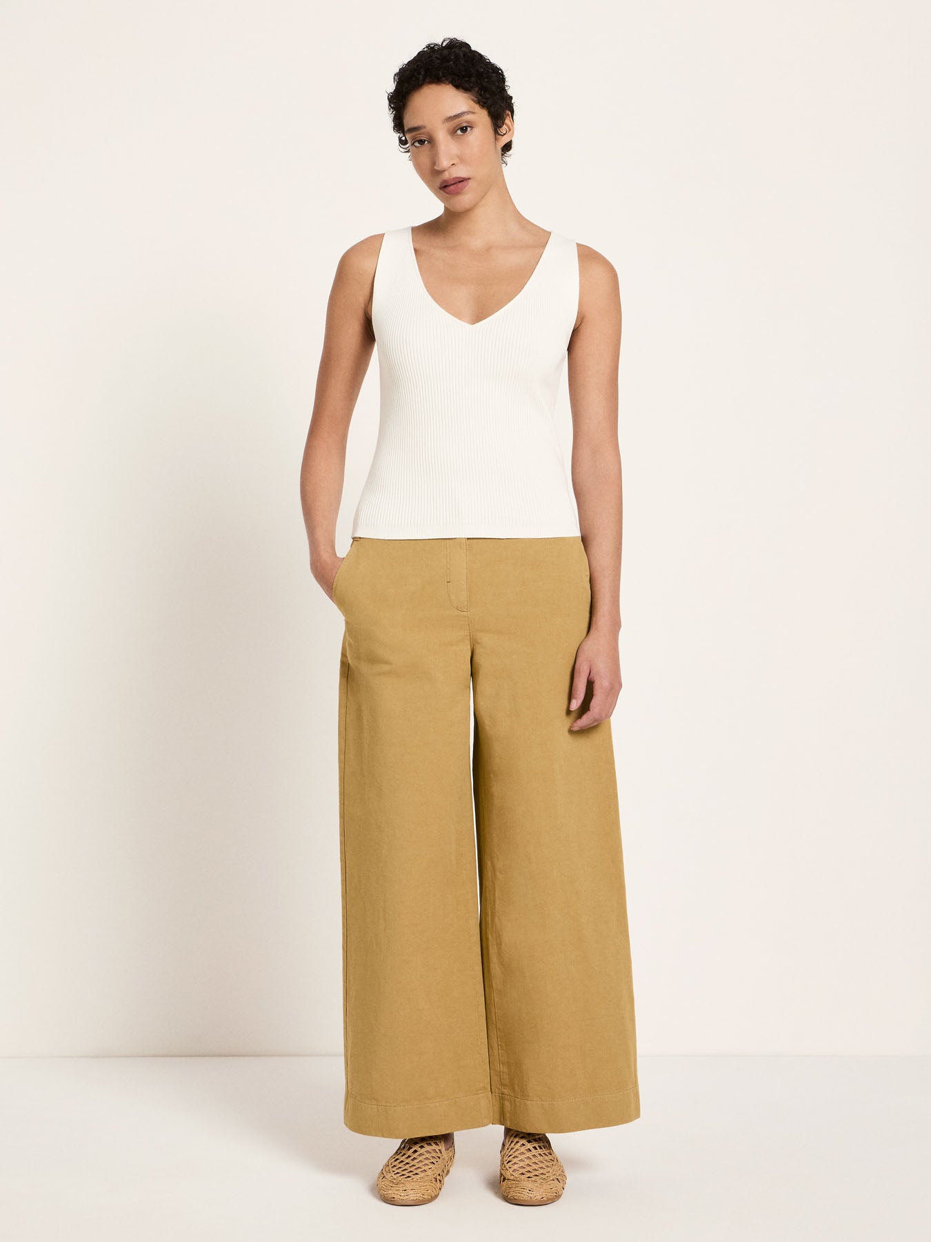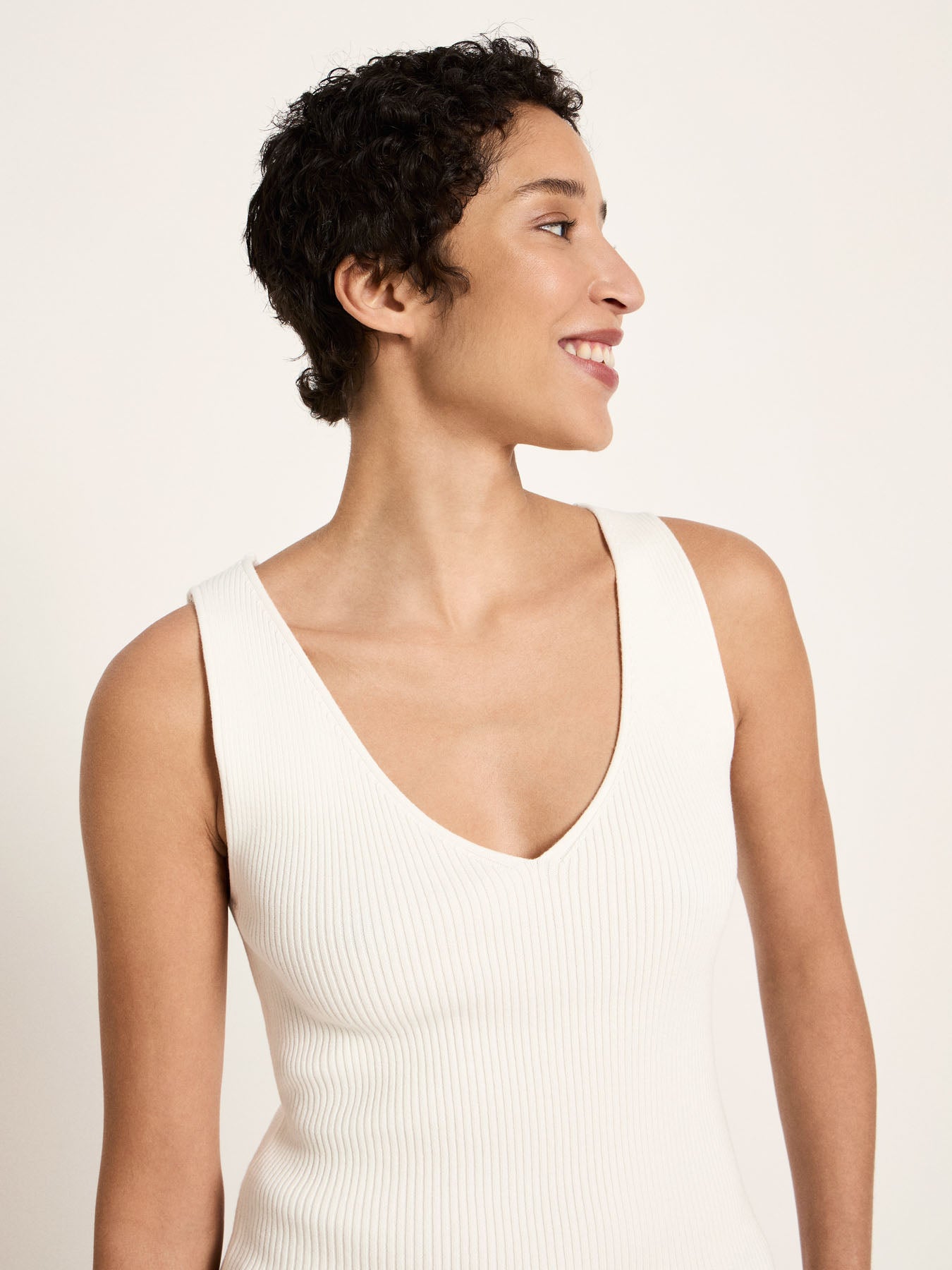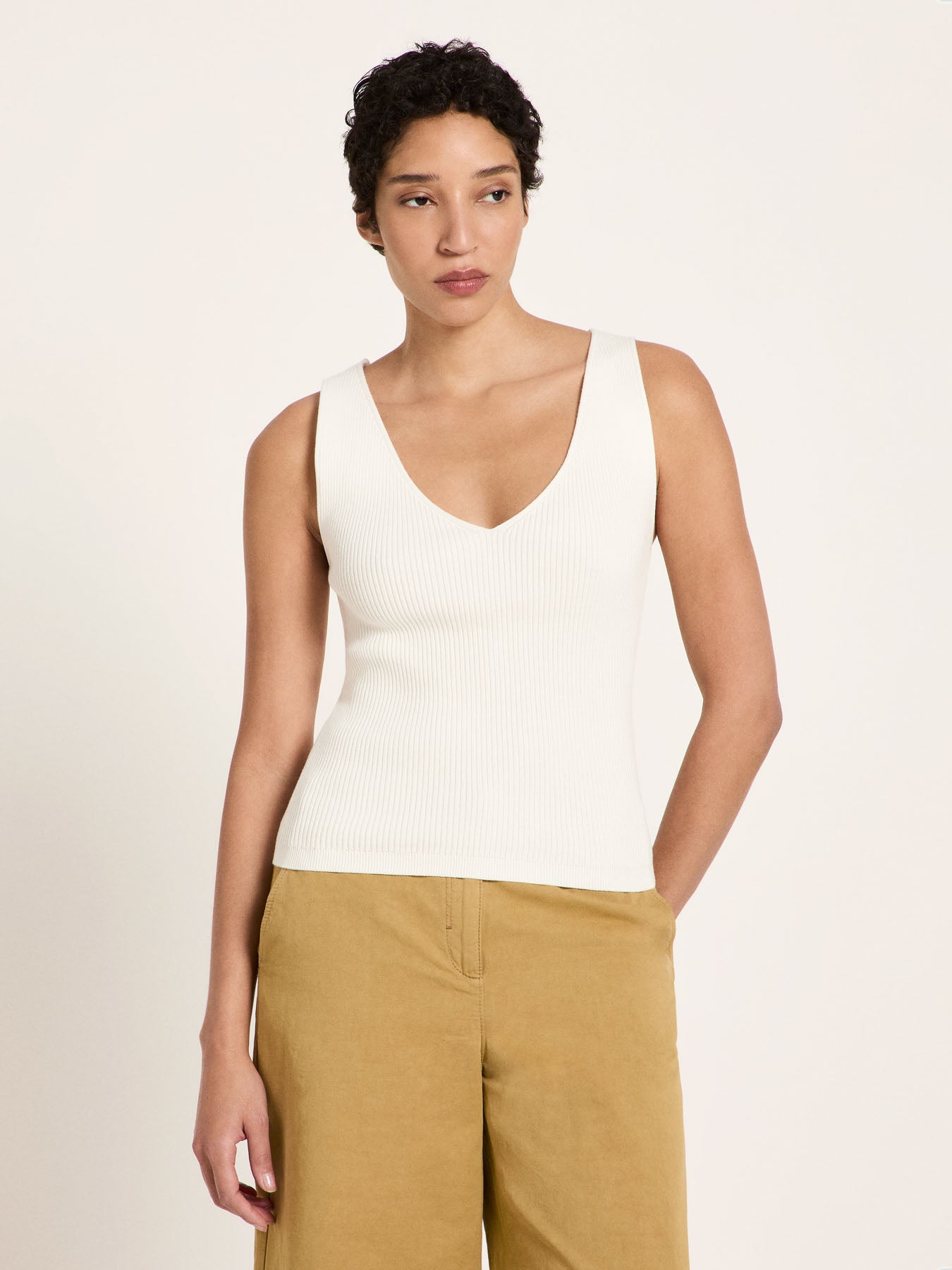Dieses Rippenstrick Top aus Bio-Baumwolle ist ein echtes Essential für jeden Tag. Der feine, elastische Rippenstrick liegt angenehm auf der Haut, während der feminine V-Ausschnitt eine klare, moderne Silhouette schafft. Ob pur getragen an warmen Tagen oder als unkompliziertes Layering-Piece unter Blazer, Cardigan oder Hemd: Das Top ist vielseitig kombinierbar und überzeugt mit zeitloser Eleganz – minimalistisch im Look, maximal im Komfort.