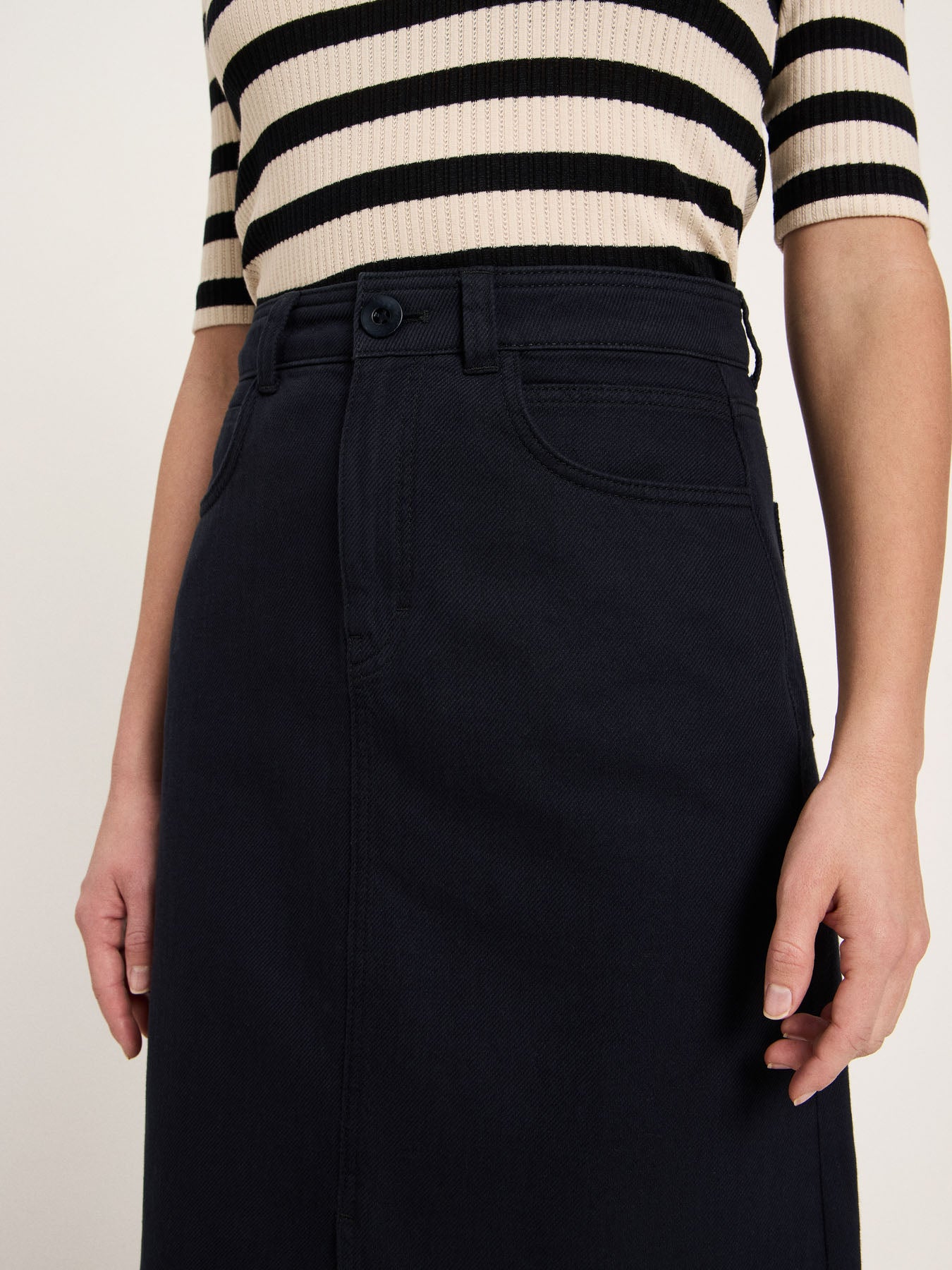 Dieser Rock mit Schlitz aus Bio-Baumwolle verbindet feminine Eleganz mit moderner Lässigkeit. Der cleane Schnitt sorgt für eine zeitlose Silhouette, während der Schlitz dem Look eine subtile Leichtigkeit und Bewegungsfreiheit verleiht – perfekt für warme Tage und stilvolle Übergangs-Outfits. Die hochwertige Bio-Baumwolle fühlt sich angenehm weich an und bietet ein natürliches Tragegefühl. Der Rock lässt sich vielseitig kombinieren: mit einem schlichten Top und Sandalen für einen minimalistischen Sommerlook oder mit Bluse, Strick und Blazer für ein modernes Office-Styling.