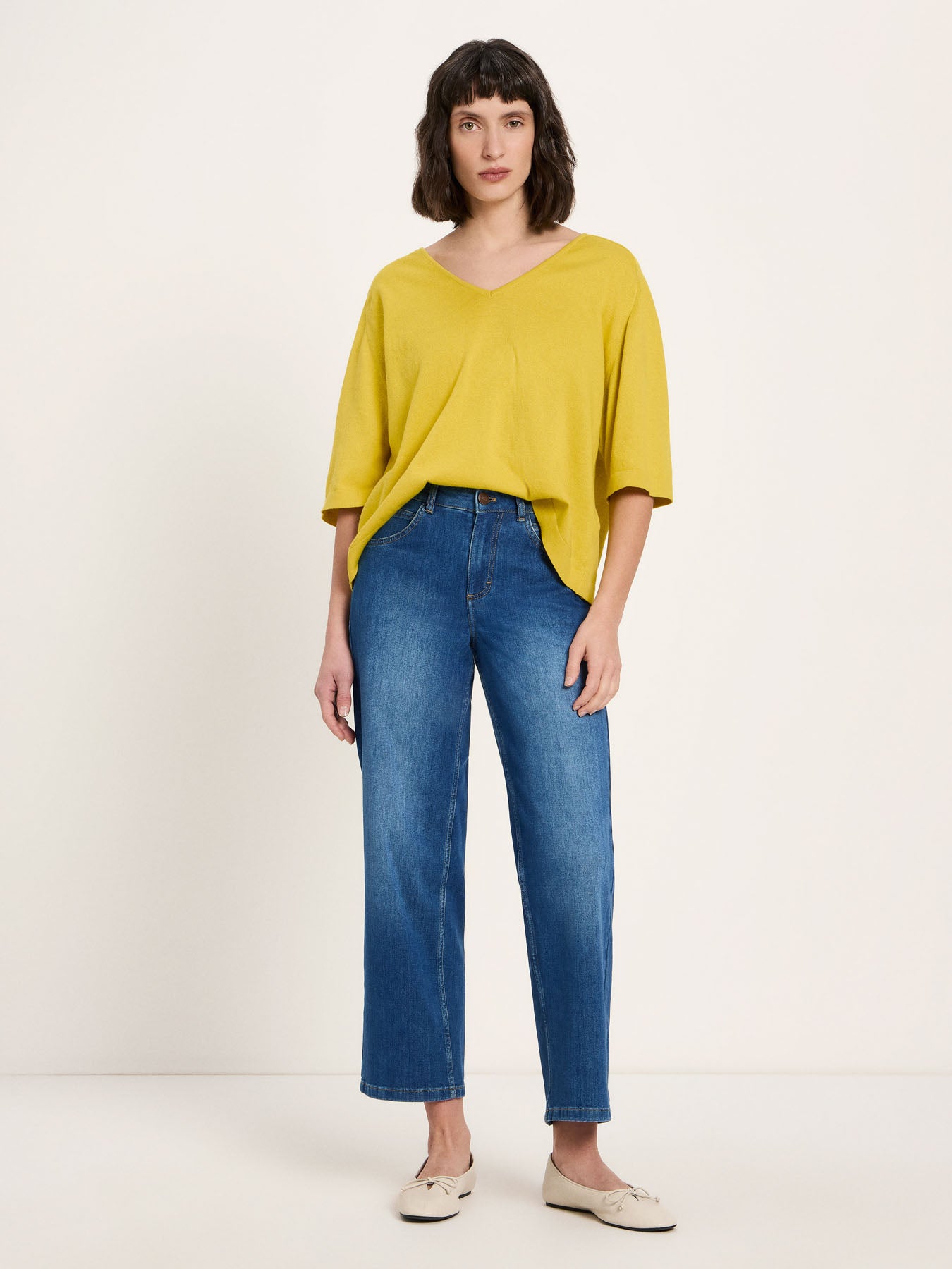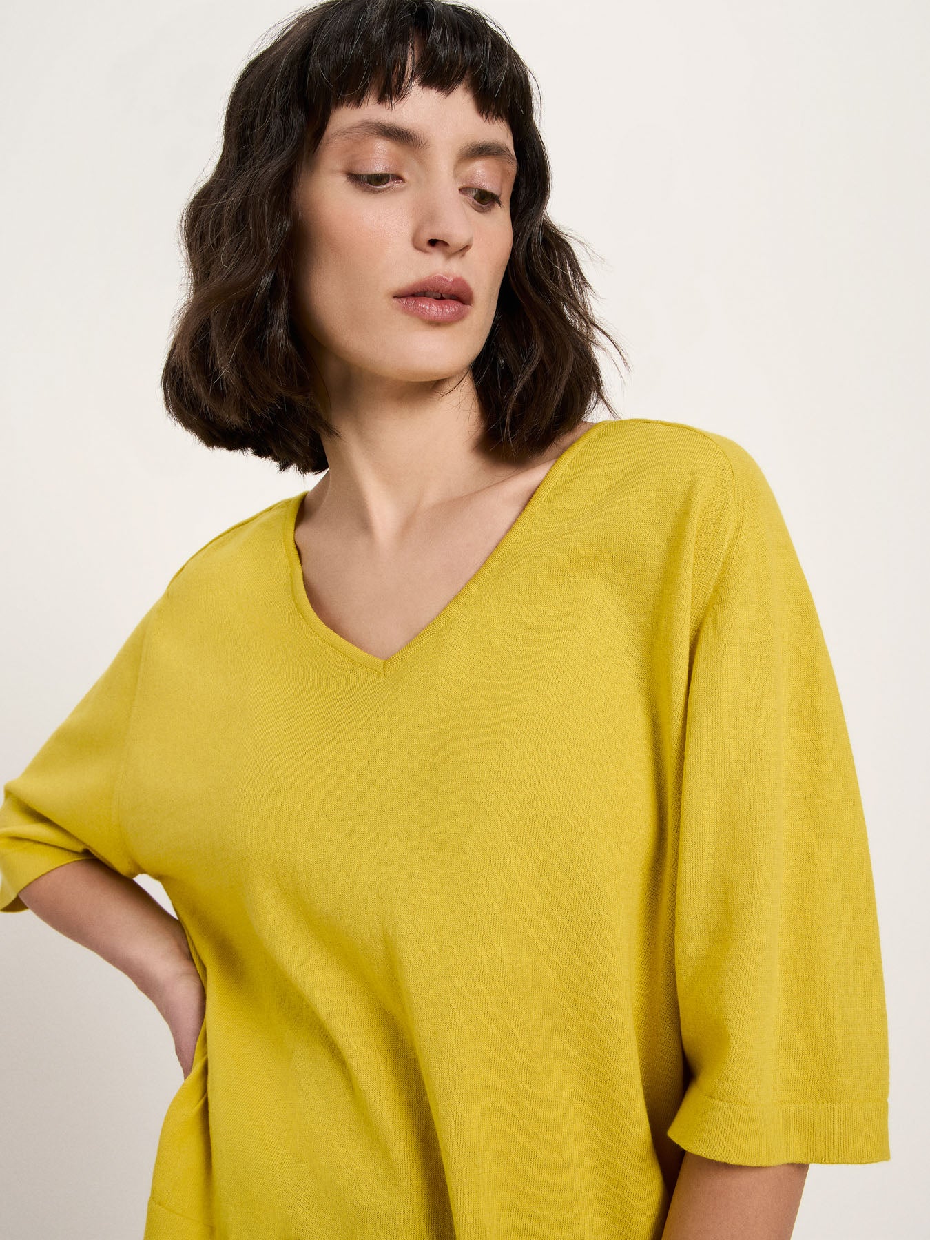 Clean, modern und vielseitig: Unser Strickshirt aus Bio-Baumwolle ist ein zeitloses Essential mit besonderem Twist. Der V-Ausschnitt sorgt für eine feminine Linie, während der lockere Schnitt und die überschnittene Schulter eine entspannte Silhouette schaffen – perfekt für unkomplizierte Looks, die trotzdem hochwertig wirken. Die Bio-Baumwolle fühlt sich angenehm weich an, ist atmungsaktiv und damit ideal für jede Saison: im Frühling solo, im Sommer als leichtes Knit-Top und bei kühleren Temperaturen als Layering-Piece unter Blazer oder Cardigan.