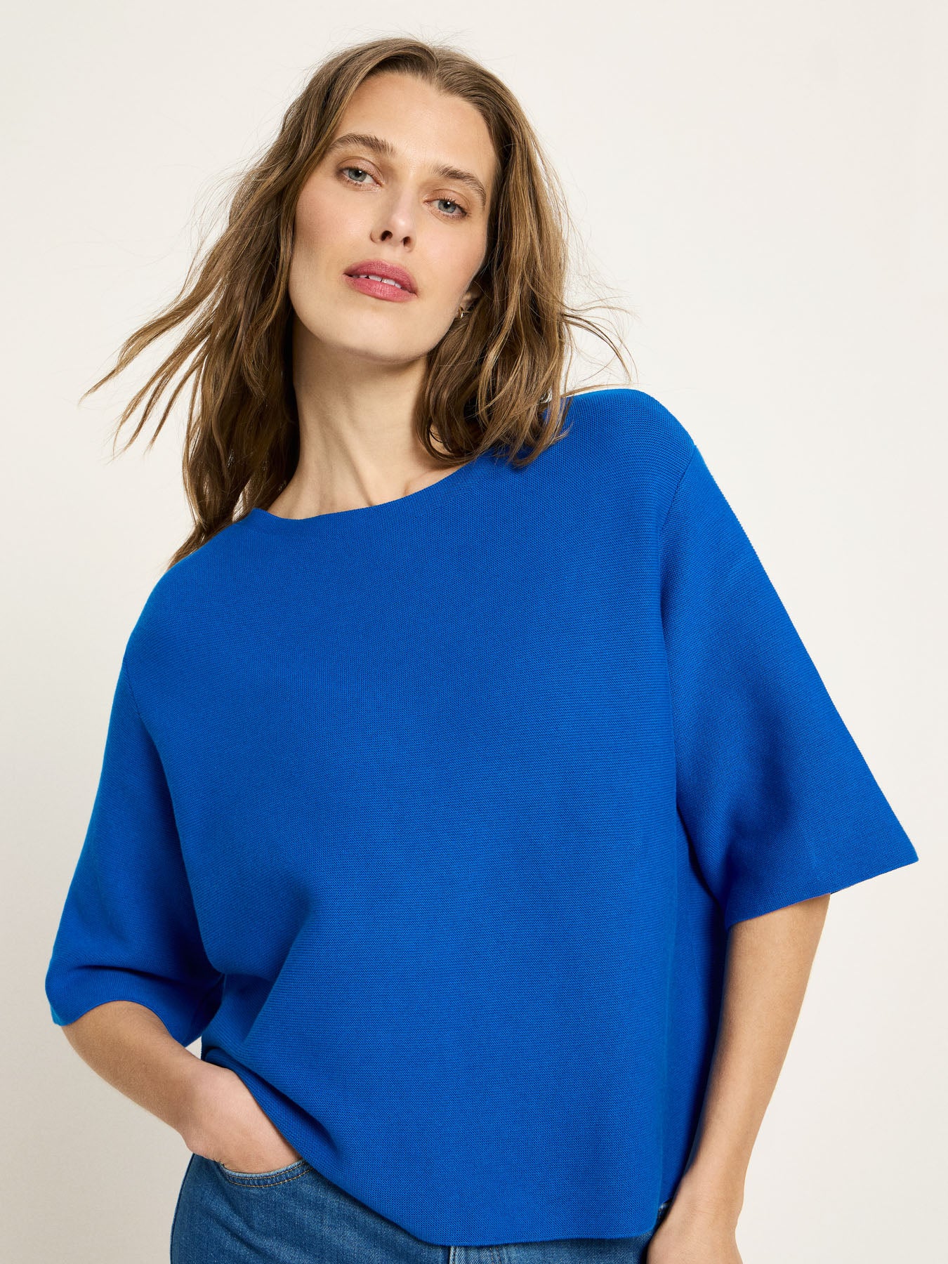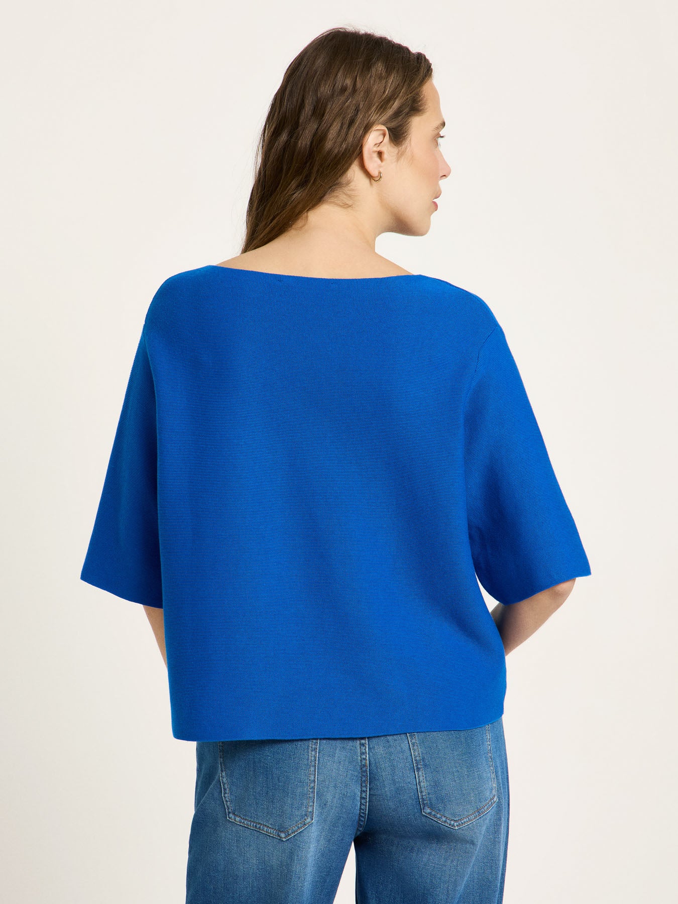 Ein Knit-Piece, das Minimalismus und Komfort perfekt verbindet: Der U-Boot Pullover aus Bio-Baumwolle überzeugt mit einem weiten Ausschnitt, der die Schulterpartie sanft betont und dem Look eine feminine Leichtigkeit verleiht. Der halblange Schnitt wirkt modern und lässt sich ideal zu High-Waist Silhouetten kombinieren. Weite Ärmel und ein angenehm weicher Griff machen den Pullover zum unkomplizierten Begleiter – vom entspannten Alltag bis zum stilvollen Office-Outfit.