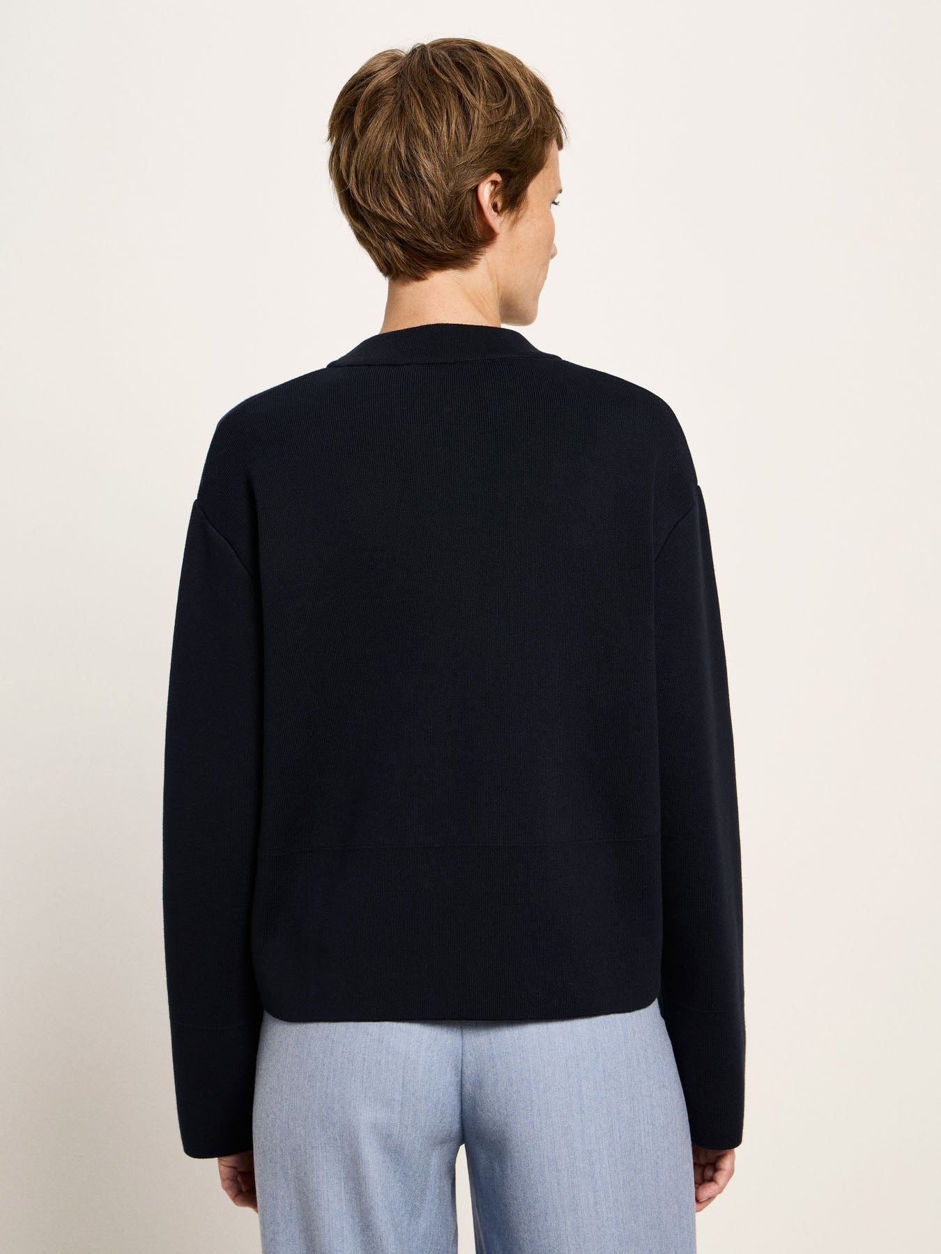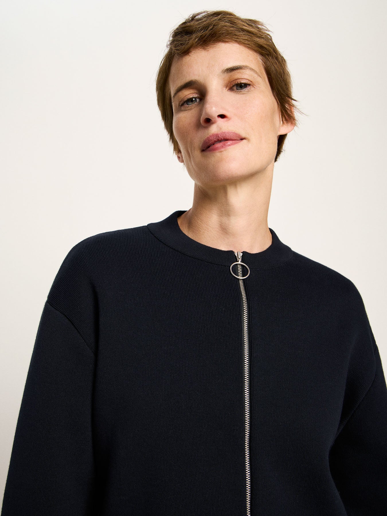 Minimalistisch, modern und komfortabel: Die Strickjacke mit Reißverschluss überzeugt mit klarer Linienführung und zeitloser Schlichtheit. Der Rundhalsausschnitt, der gerade Schnitt und die weiten Ärmel verleihen dem Design eine entspannte Silhouette. Ein sportives Detail bildet der durchgehende Reißverschluss mit Ring-Zipper, der dem Look einen modernen Twist gibt.