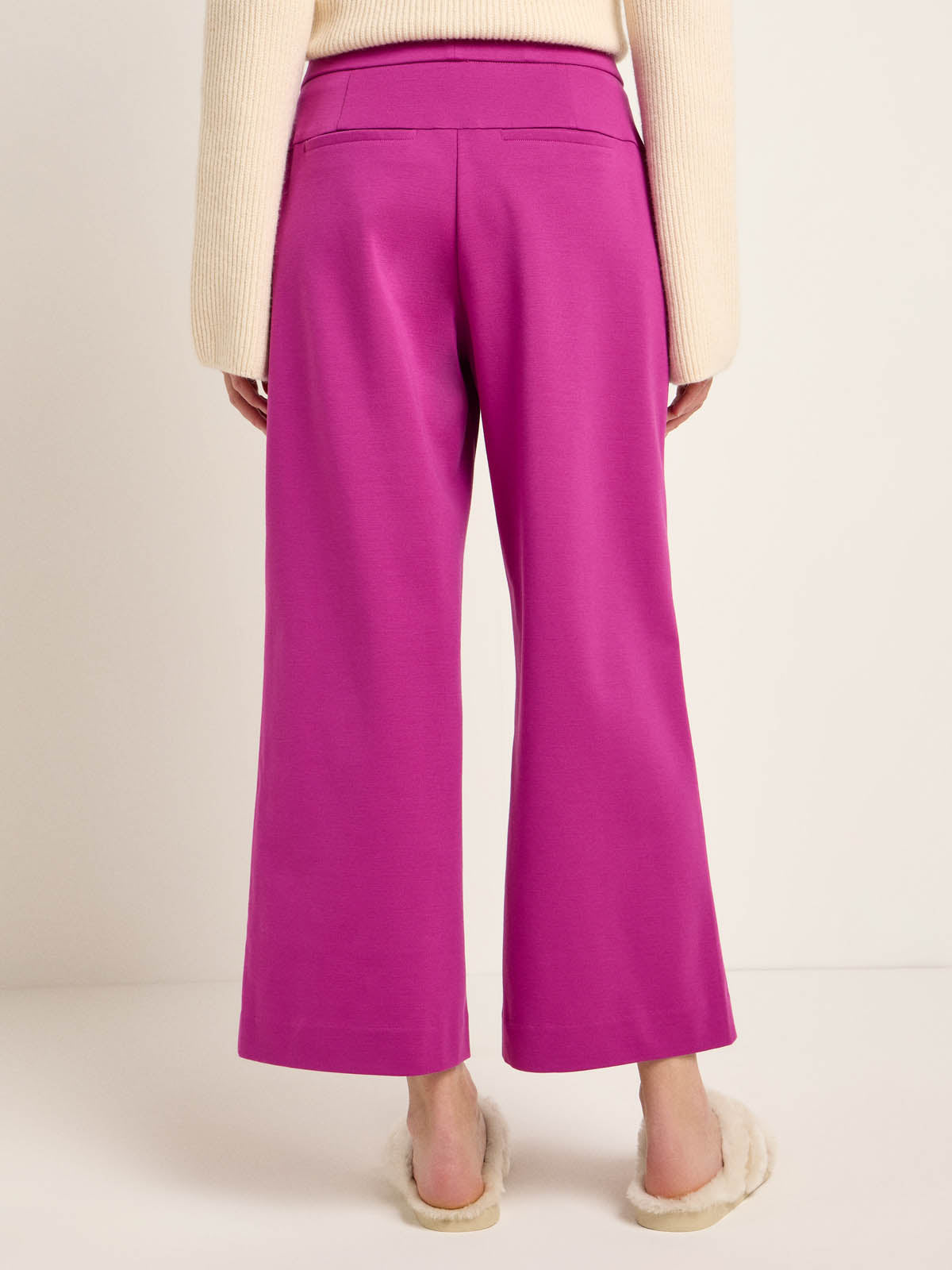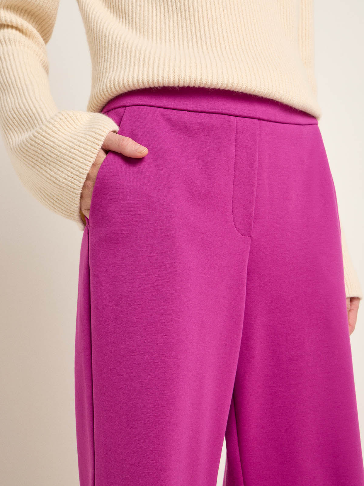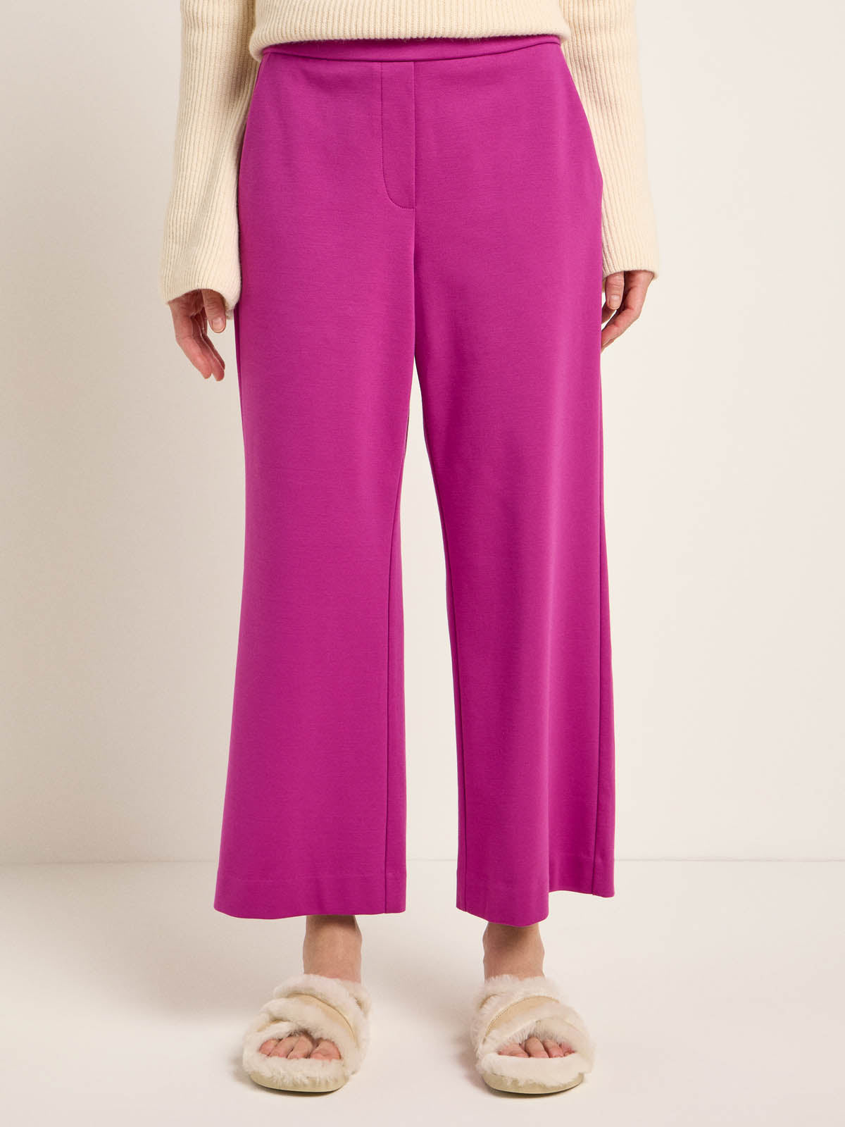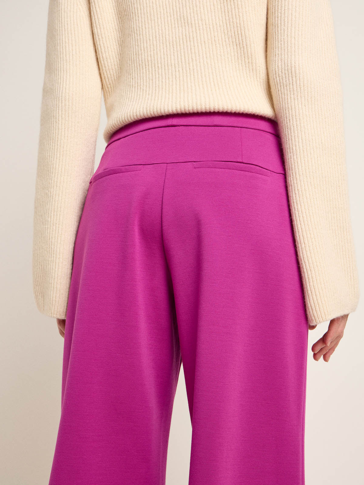 Culotte mit Wohlfühlcharakter: Die verkürzte Hose mit weitem Bein ist aus einem festen, natürlichen Materialmix aus Bio-Baumwolle und reiner Schurwolle, welcher sich leicht und angenehm auf der Haut trägt. Der flexible Bund ist hoch geschnitten ohne störende Reißverschlüsse und Knöpfe. Ein praktisches Detail: die seitlichen Eingrifftaschen. Kombiniert zum weißen Hemd oder zur Bluse wird der Look bürotauglich, zum Strickpullover und Boots hingegen winterlich-gemütlich.