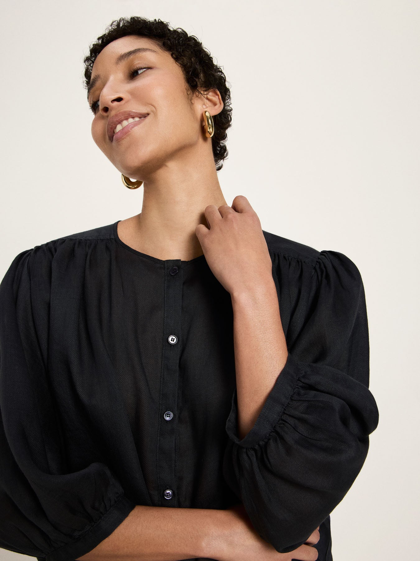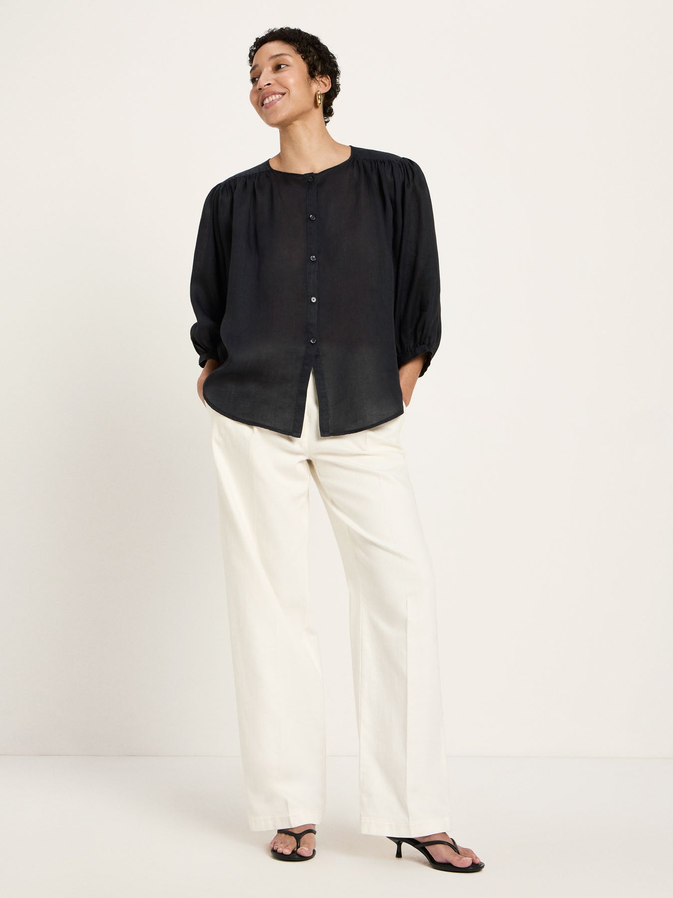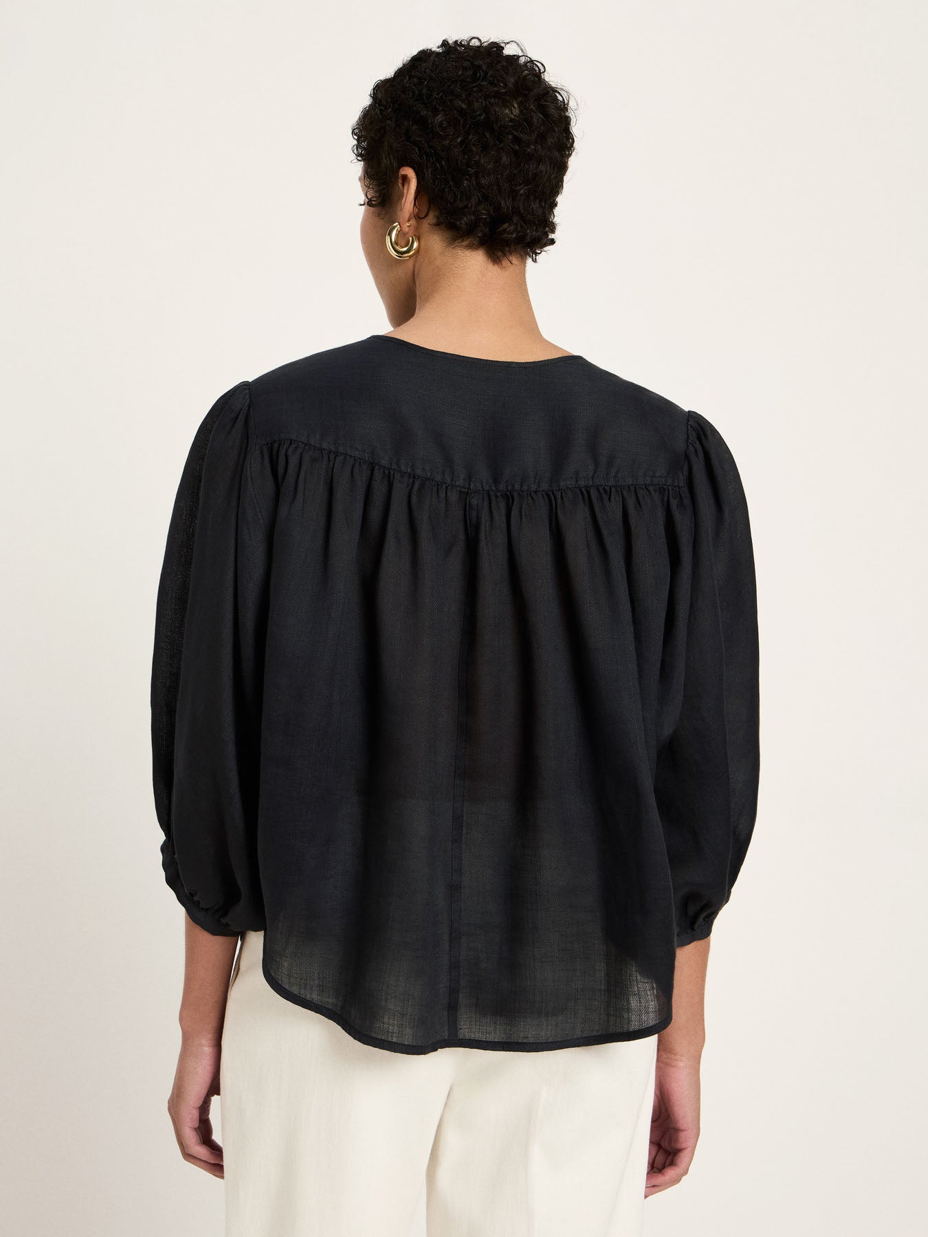 This ramie blouse impresses with its airy quality and delicate gathers, which lend the design a soft texture. The relaxed fit ensures a comfortable feel and versatile styling options. A natural essential for a relaxed, modern look.