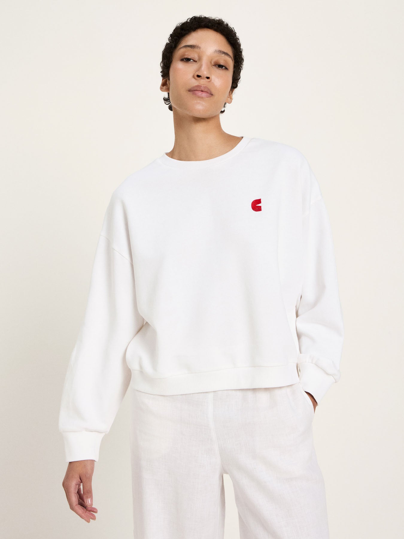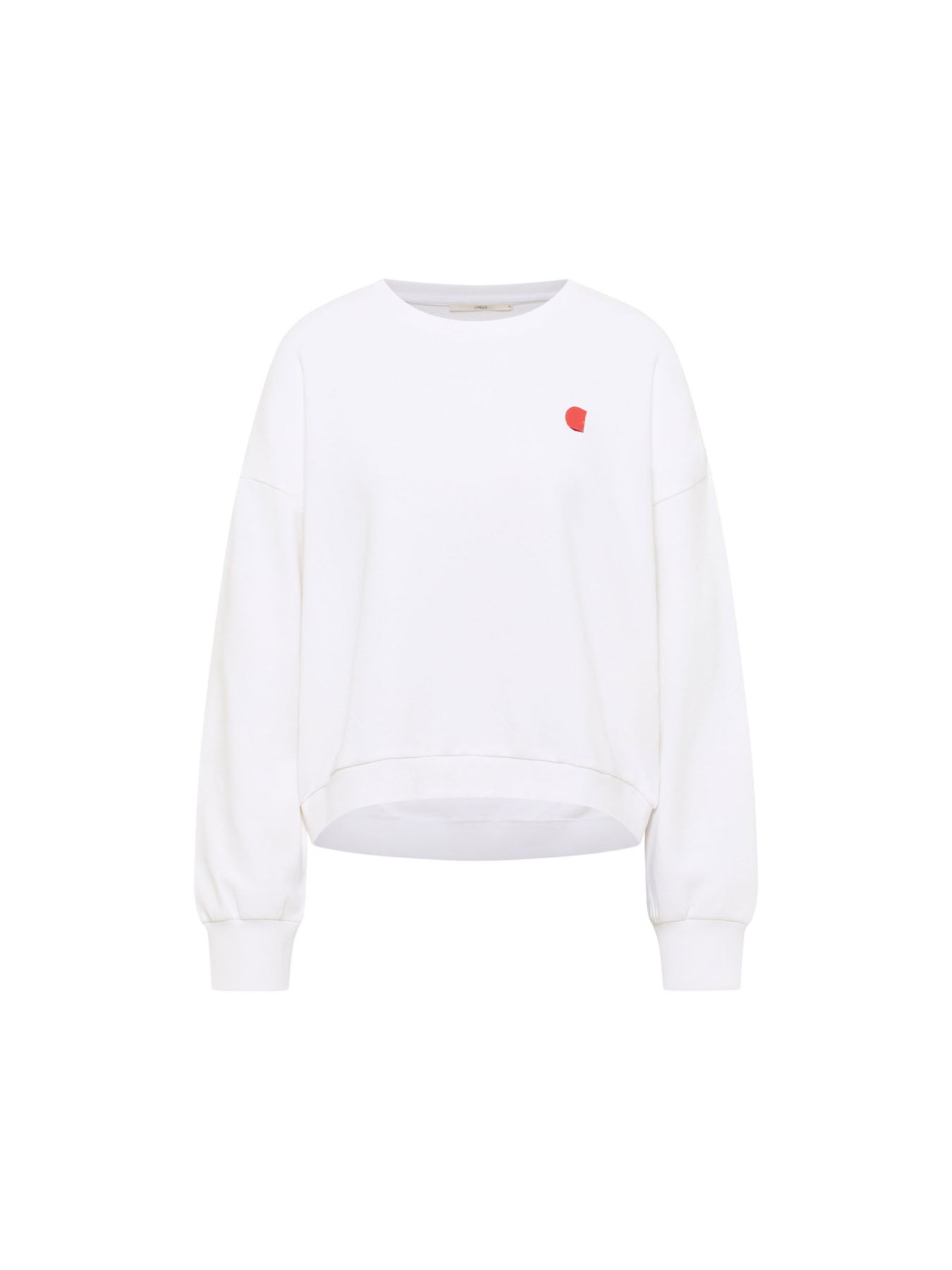 This sweatshirt combines a clean, modern silhouette with a striking graphic detail. The small heart print adds a unique touch to the design. The pleasantly soft fabric ensures exceptional comfort, while the relaxed fit with cuffs at the hem and sleeves creates a laid-back look. Versatile and easy to style – wear it casually with trousers or create a stylish contrast with more feminine pieces.