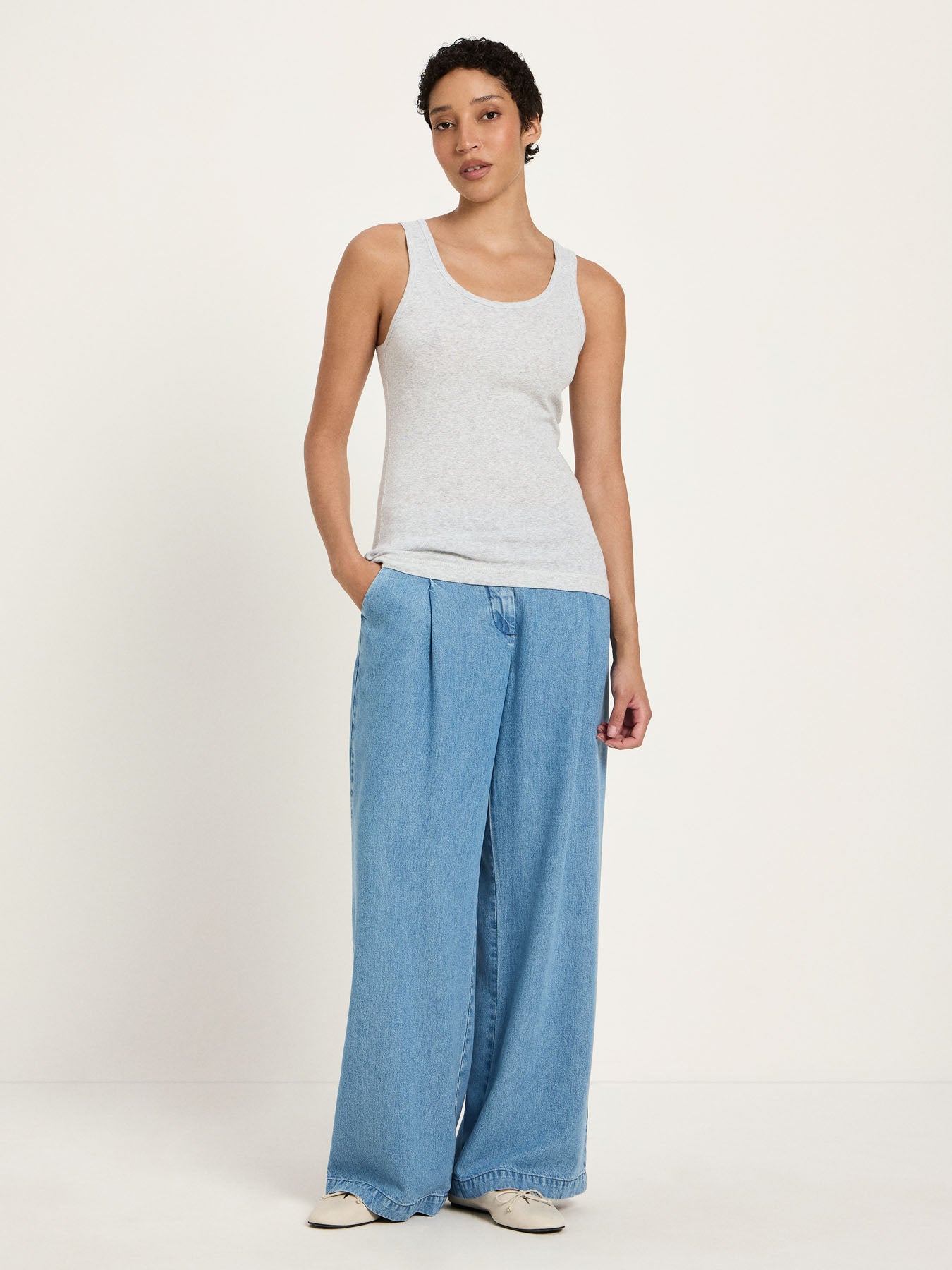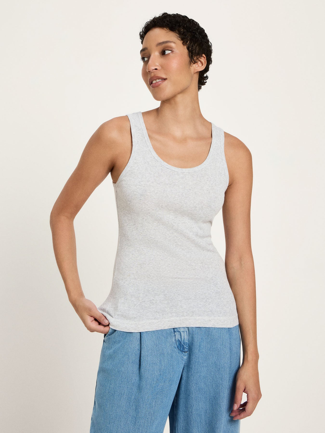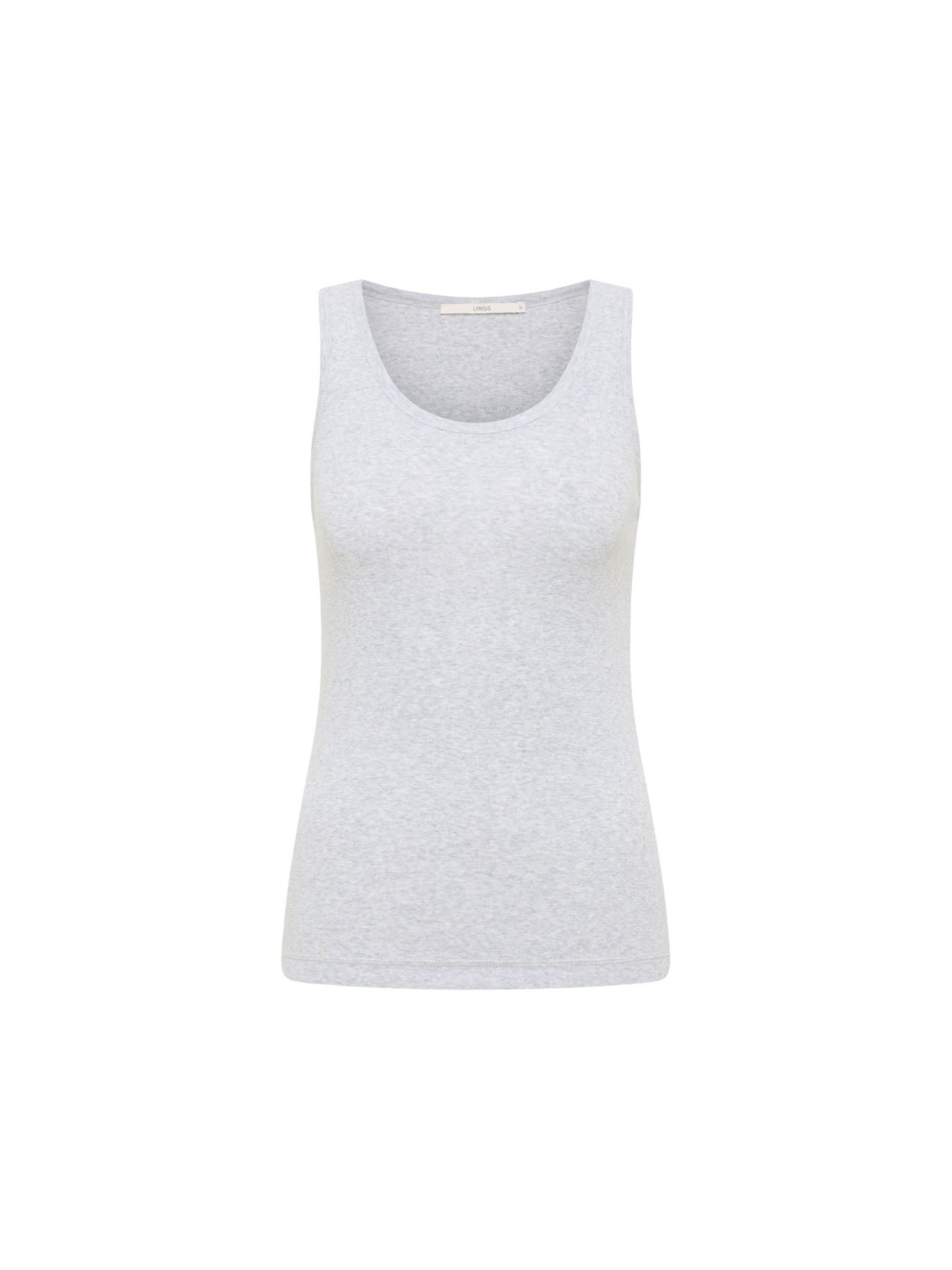 This top, made from high-quality organic cotton, impresses with its clean lines and understated elegance. The feminine round neckline and the close-fitting yet comfortable cut make it a timeless everyday essential. The soft, breathable fabric feels gentle against the skin and is ideal for warm days or as an easy layering piece under blouses, knits, or jackets.