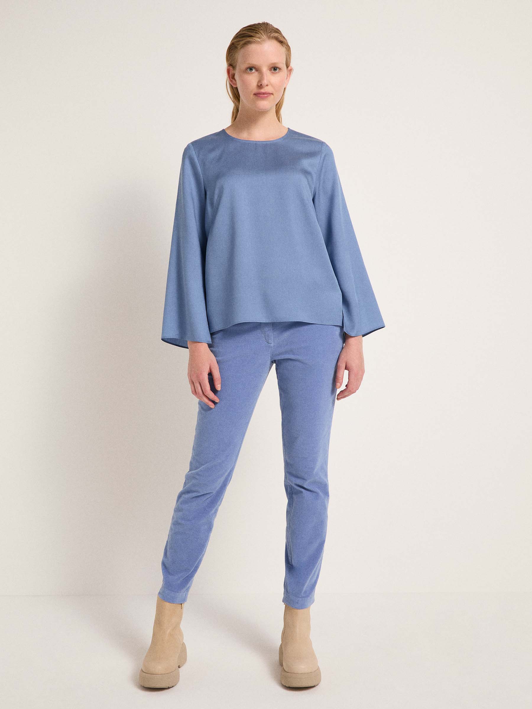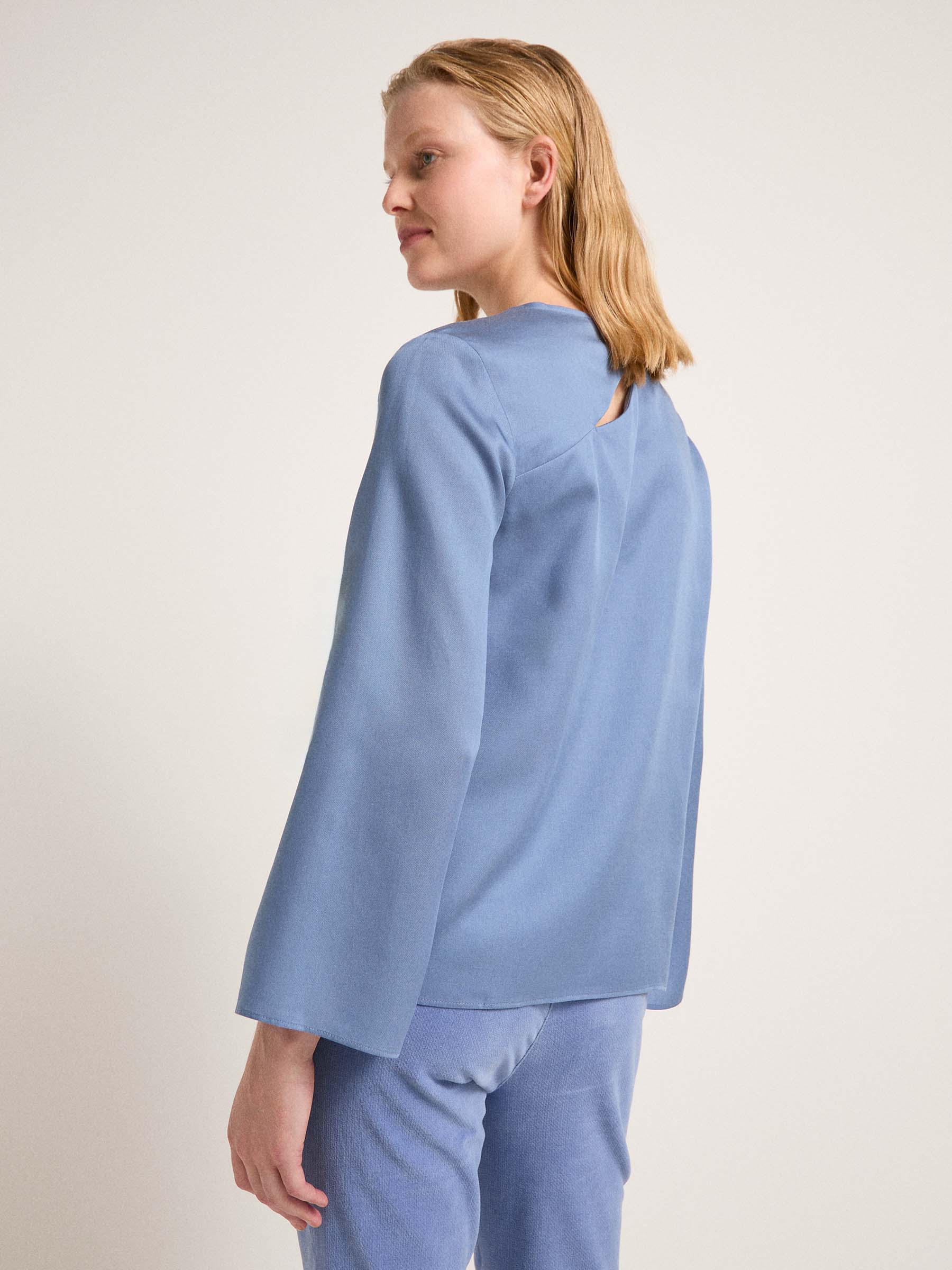 A highlight of our fall/winter collection: the blouse with slits made of TENCEL™! The blouse is loose-fitting and comfortable on the skin. The slits on the long, flared sleeves and a cut-out on the back give it feminine and special details. The slightly shiny fabric and elegant cut make the blouse an eye-catcher!