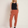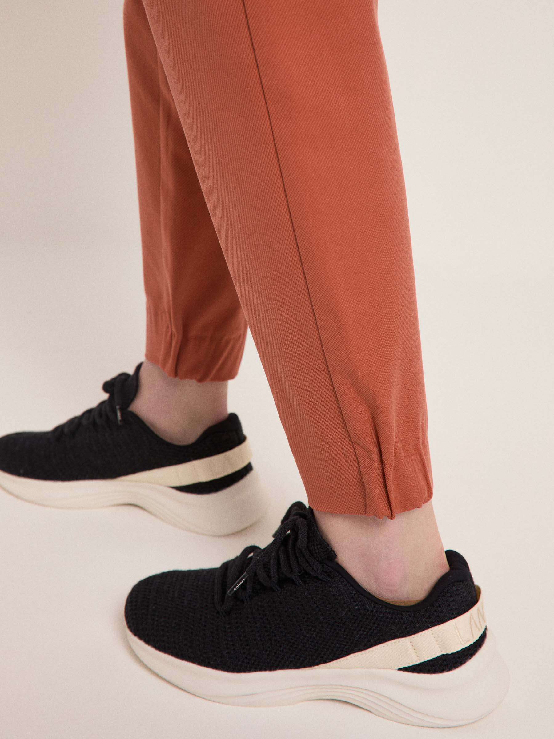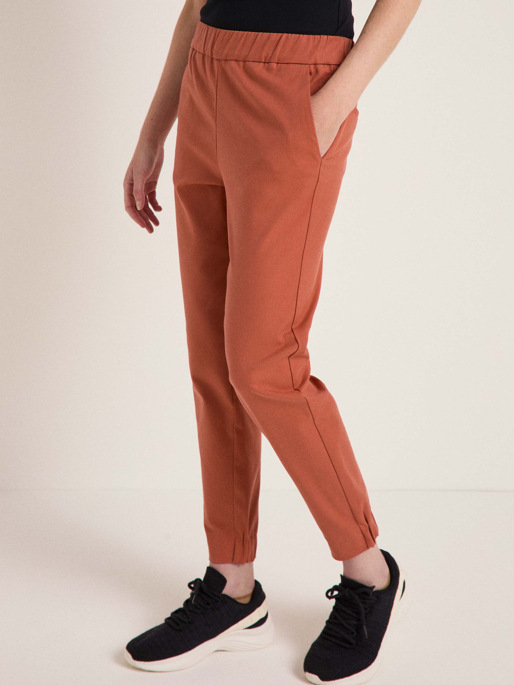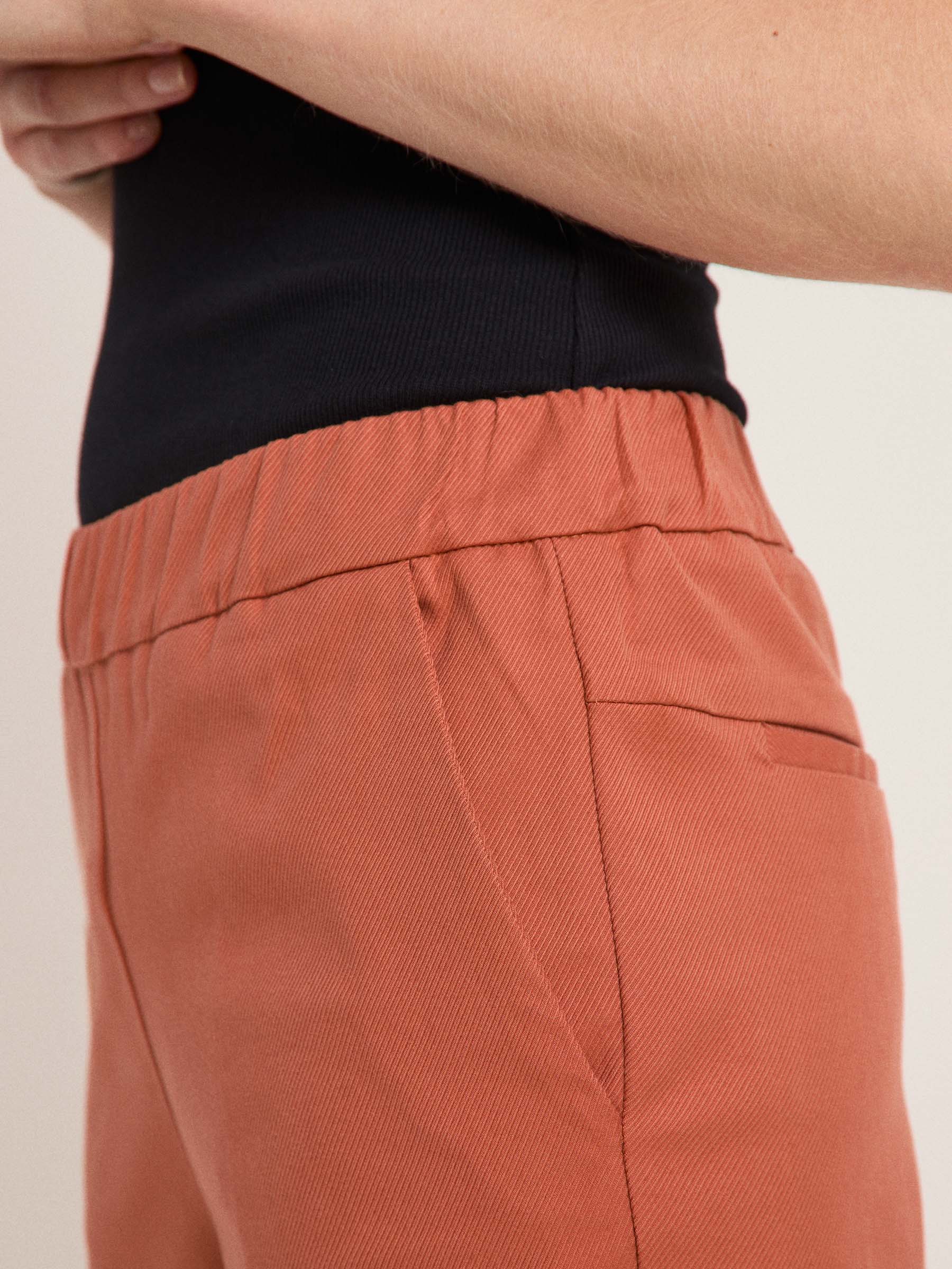 A classic and a must-have at the same time: our trousers with tapered legs made of TENCEL™ and organic cotton! The long trousers with an elastic, high waistband, loose fit and side pockets impress with their simple design. An elastic band at the back of the legs, a patch pocket at the back and a striking seam on the sides of the legs are fashionable details. Thanks to the pleasantly firm and durable material mix, the vegan pencil trousers are comfortable to wear even on cooler days. With a matching shirt and blazer, the all-over look is chic - with a knitted sweater and boots it is suitable for everyday use!