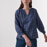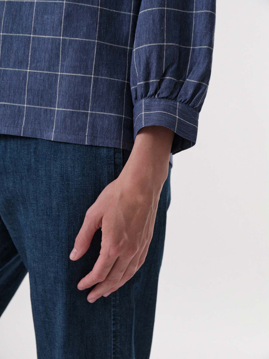 The check blouse is particularly comfortable to wear thanks to its material mix of hemp and TENCEL™ and has a light, natural structure. It is boxy, slightly shortened, has 3/4 sleeves with metal buttons at the cuffs, and a playful, slightly pleated neckline with a slit. The shape and material of the blouse make it a great transitional piece, and the classic design makes it versatile and can be worn and styled over many seasons.