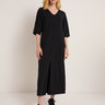 Elegant dress with slit: Our dress with slit and shortened, wide sleeves is made of organic cotton and TENCEL™. It is an opaque and stretchy material, comfortable and cuddly to wear on the skin. The feminine, light V-neck, the front slit and the flowing midi length make the vegan dress quickly a favorite part of your capsule wardrobe.