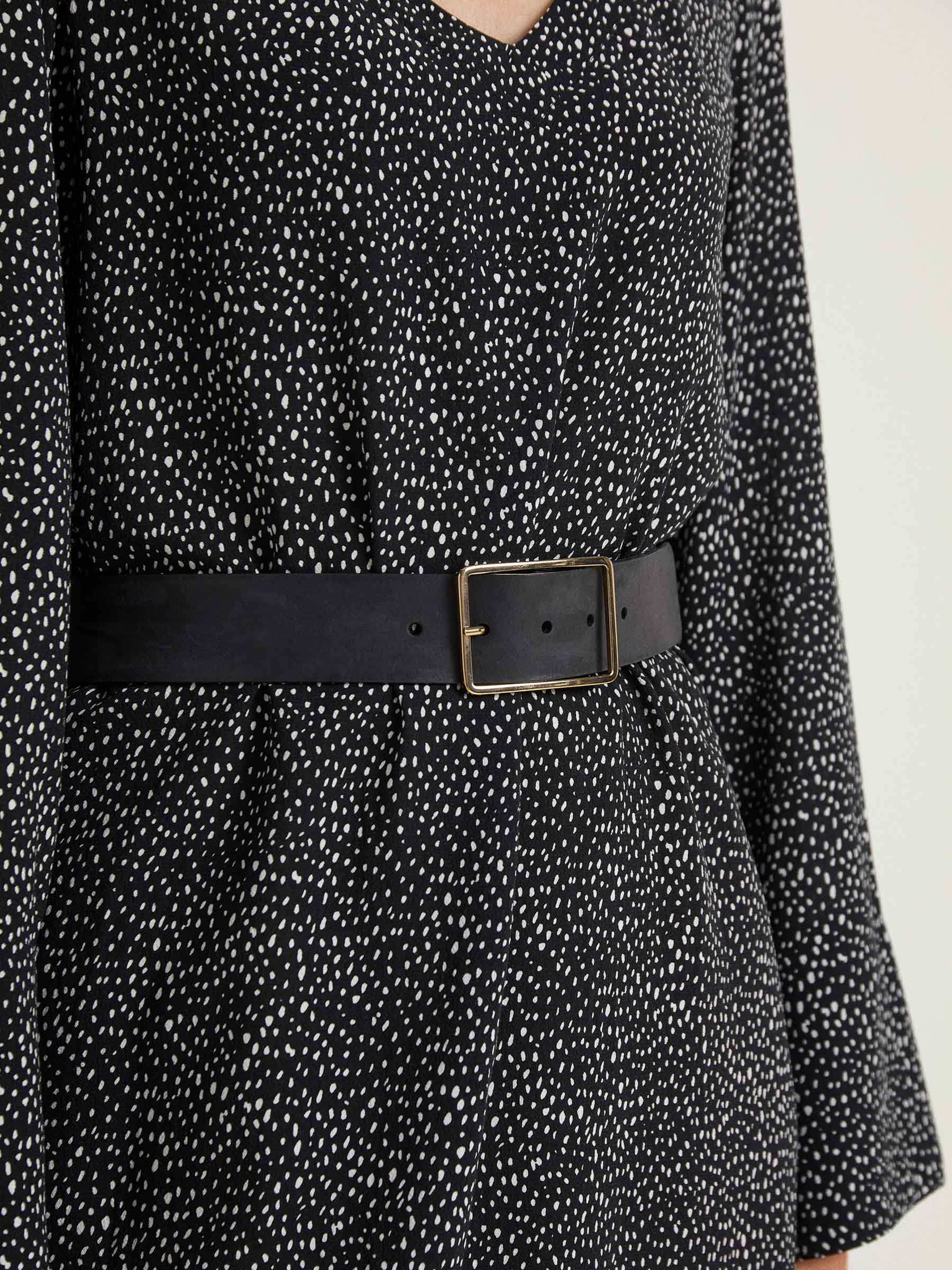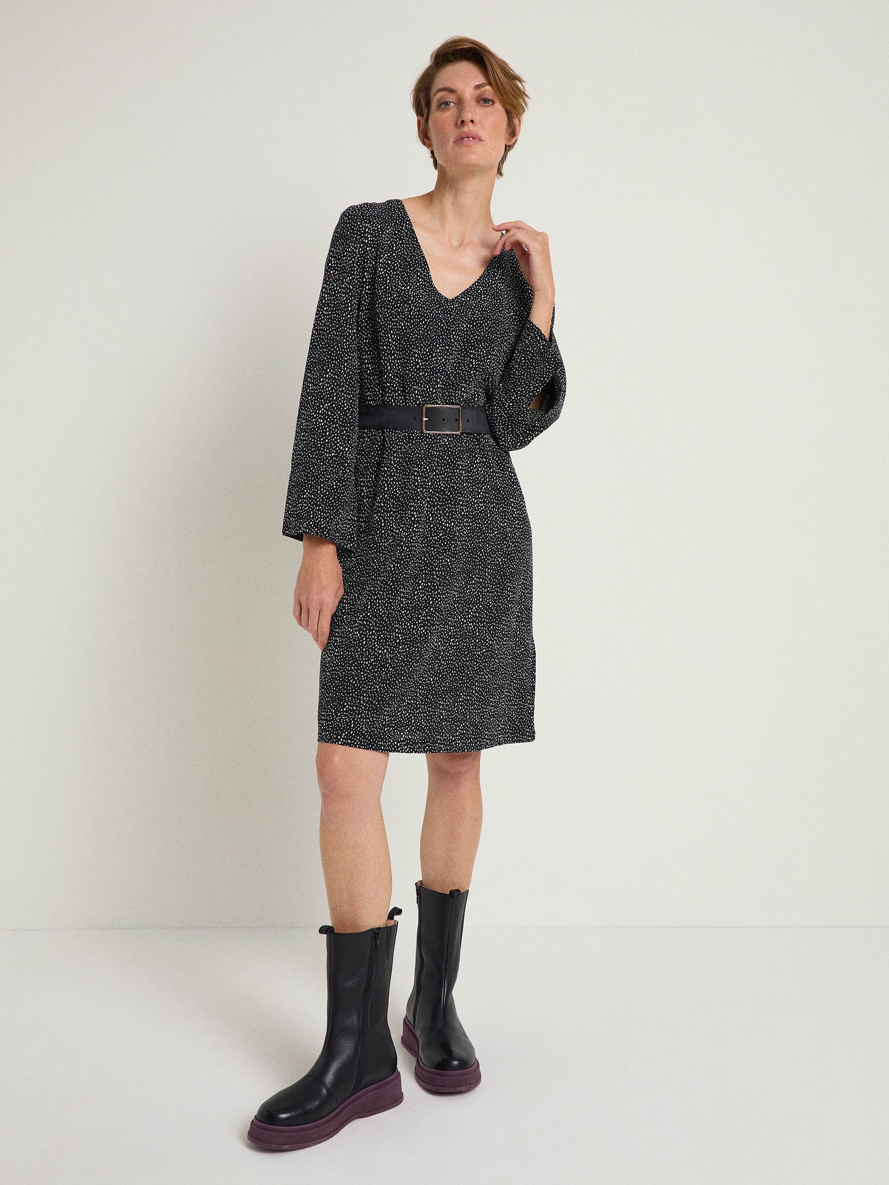 "Dots" is our seasonal print that is both classic and fashionable and will easily blend into your wardrobe. The cut of the dress is casual with slightly flared sleeves. The feminine V-neck picks up on the playfulness of the dotted print and gives the dress a modern look. Perfect for sunny autumn days or winter layering.