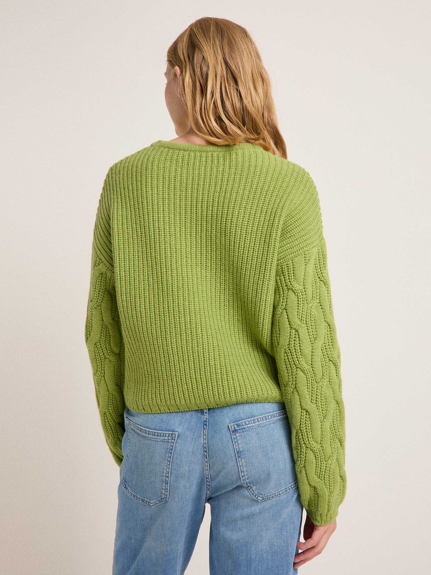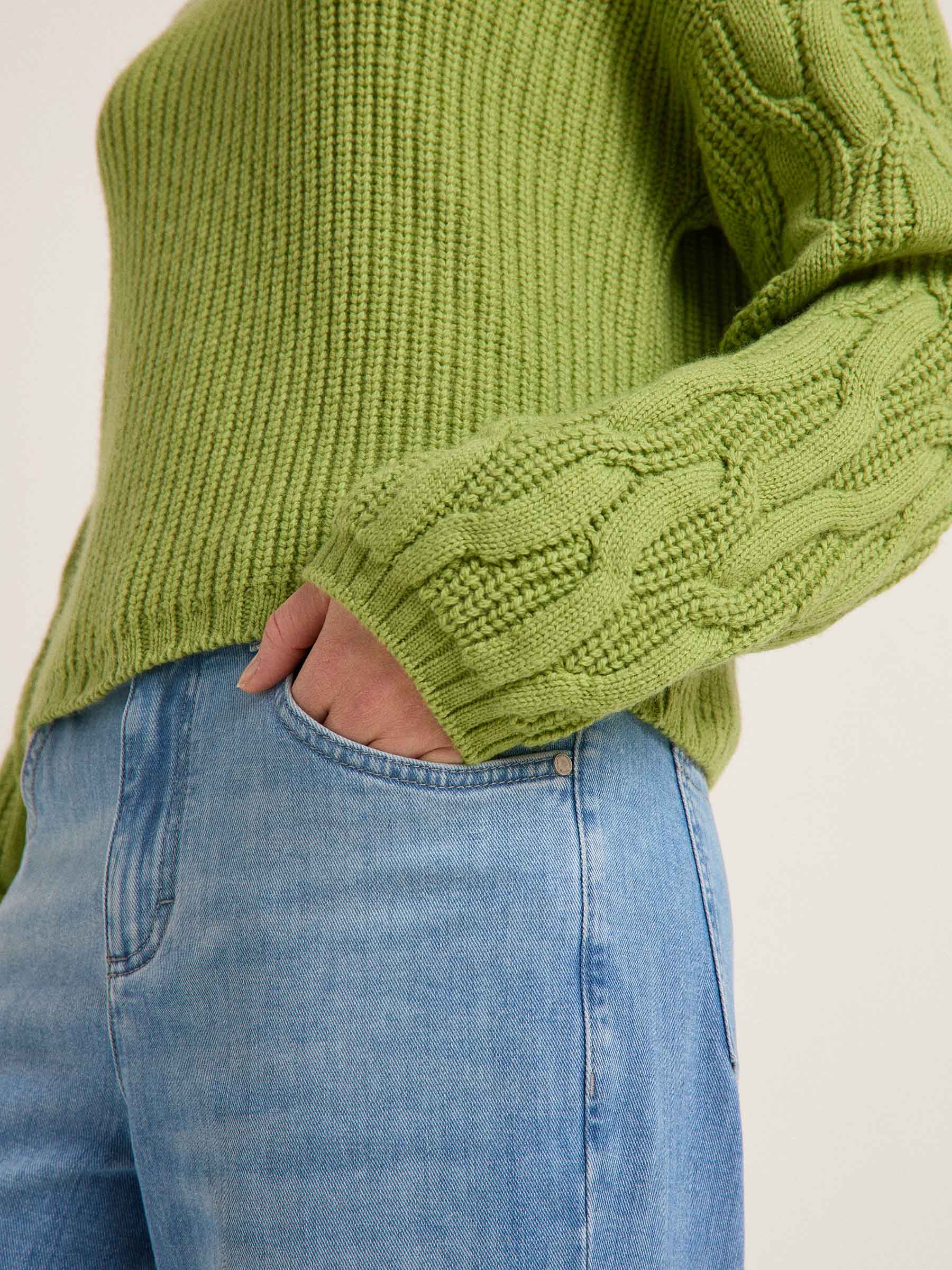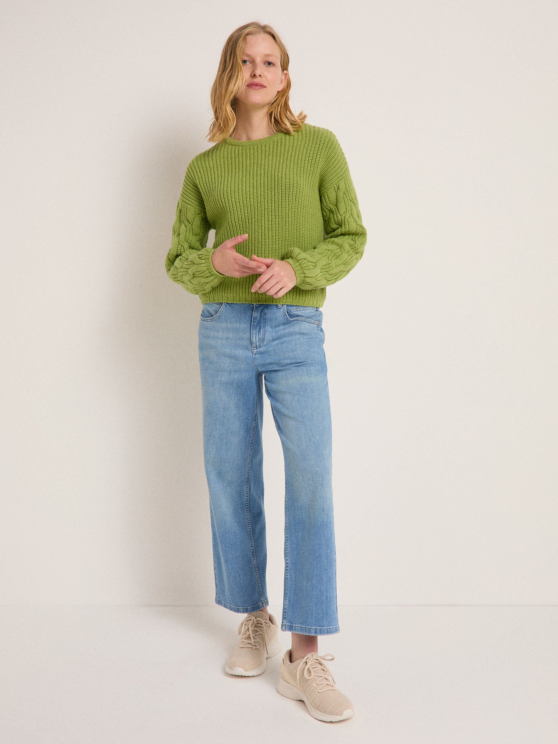 A classic reissued: The cable knit sweater has a classic round neckline and a straight, slightly cropped fit. The cable knit on the wide sleeves is timeless and fashionable at the same time, and the material mix of organic cotton and organic new wool is pleasantly soft and natural on the skin. A real favorite for your sustainable fall/winter wardrobe.