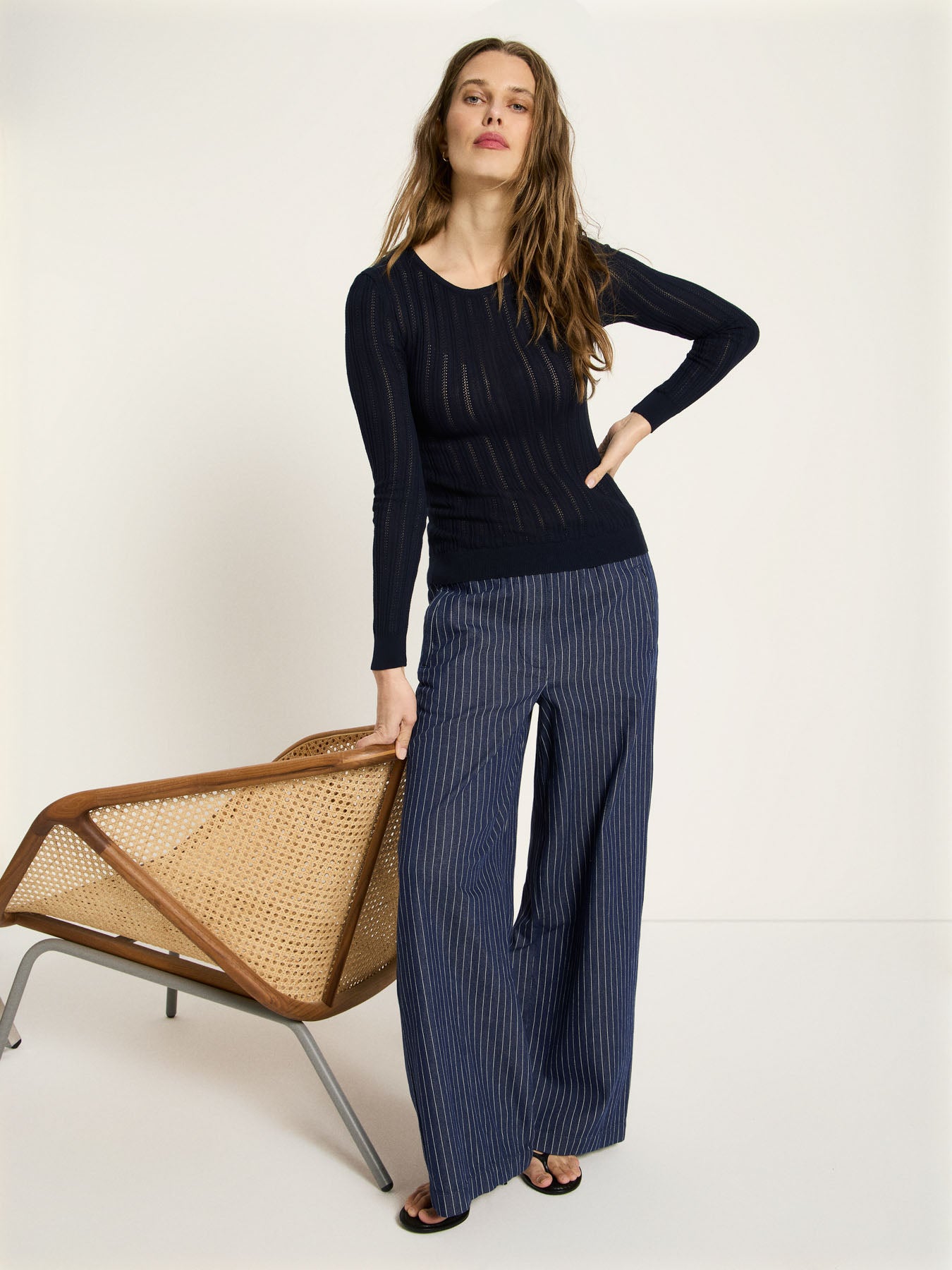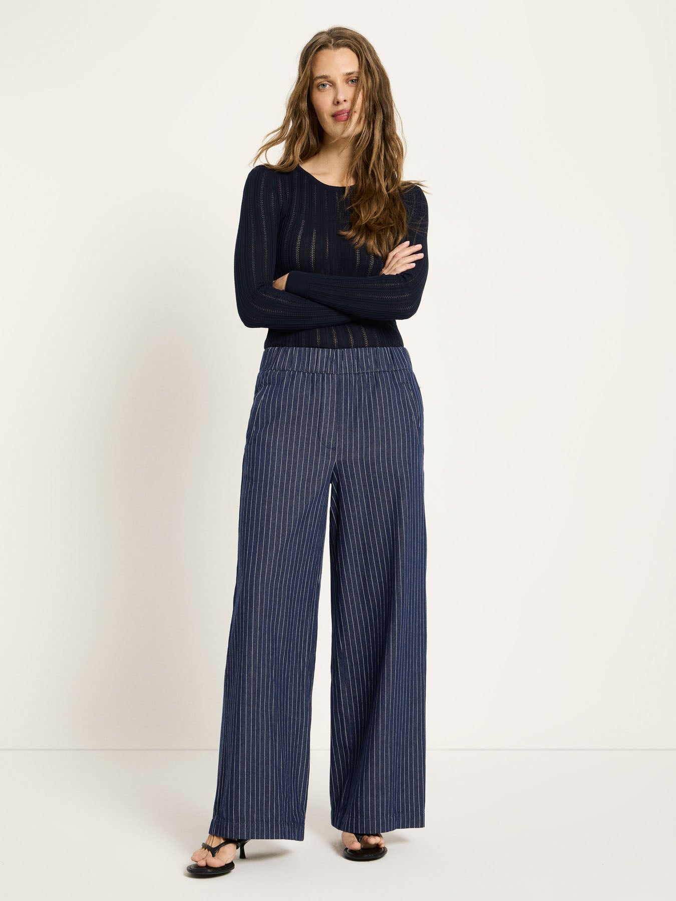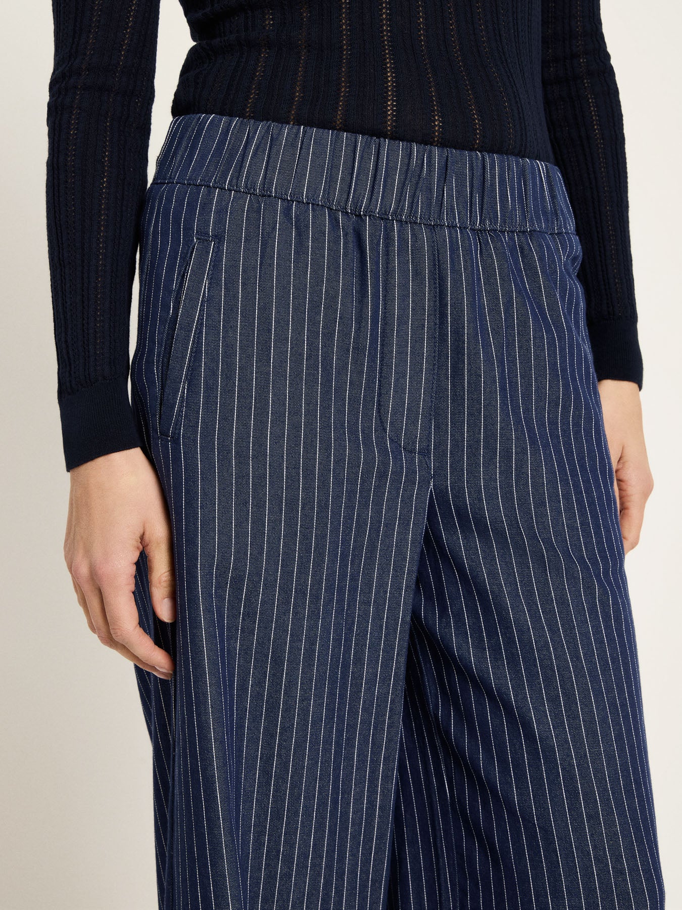 Diese Streifenhose aus Bio-Baumwolle verbindet entspannten Komfort mit modernem Design. Das feine Streifenmuster verleiht der Hose eine klare, zeitlose Optik, während der Gummibund für ein besonders angenehmes Tragegefühl sorgt – ideal für lange Tage, Reisen oder unkomplizierte Alltagslooks. Die hochwertige Bio-Baumwolle fühlt sich natürlich weich an und macht die Hose zum perfekten Begleiter für jede Saison. Kombinierbar mit einem schlichten Shirt und Sneakern für einen minimalistischen Look oder mit Bluse und Strick für ein modernes, entspanntes Office-Styling.