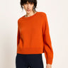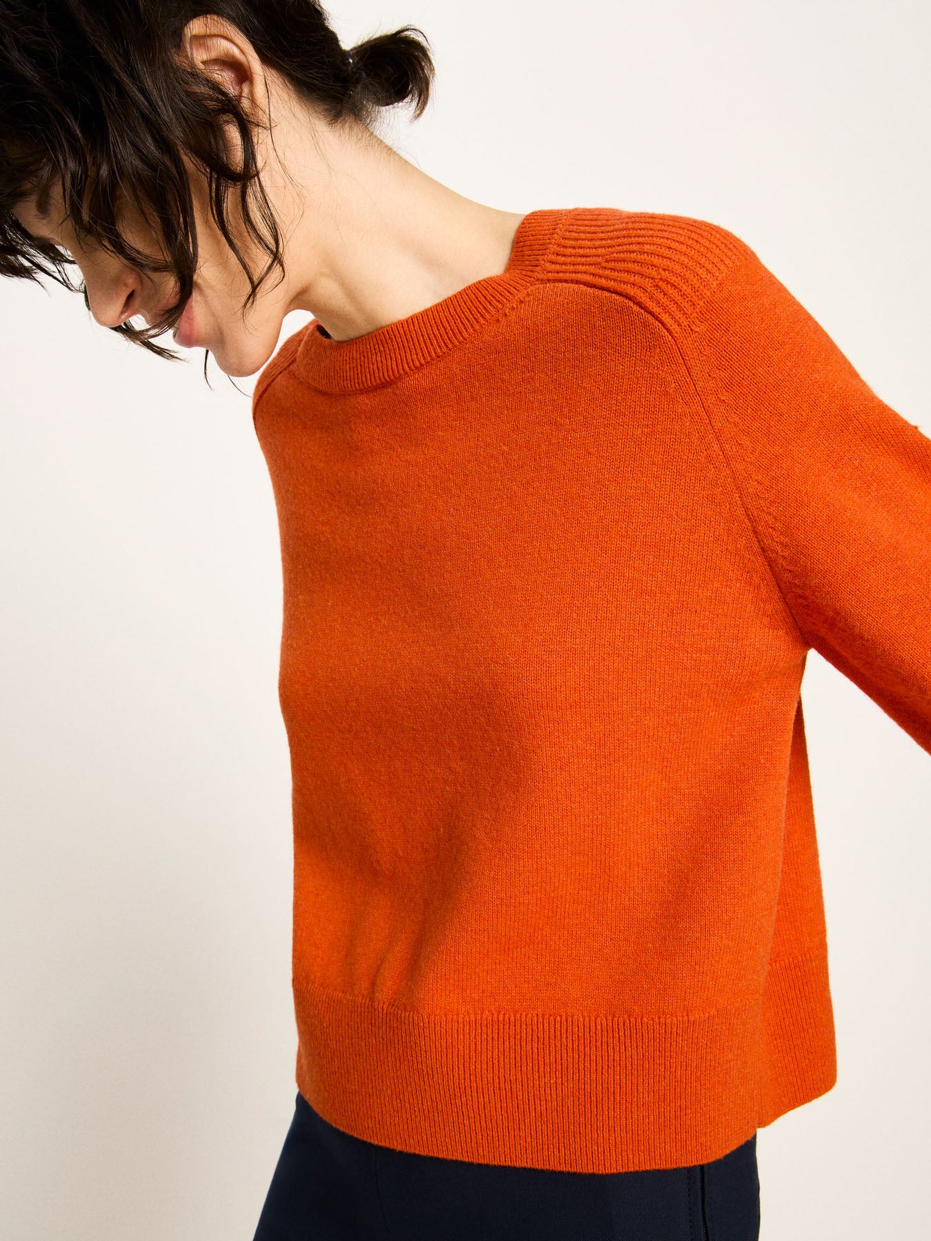Der Cropped Pullover aus 100% hochwertiger Merino Schurwolle vereint zeitlose Eleganz mit modernem Komfort. Der verkürzte, gerade Schnitt sorgt für eine schmeichelnde Silhouette, während die leicht überschnittenen Schultern und der Rundhalsausschnitt den Look lässig und zugleich edel wirken lassen. Das intensive Orange verleiht jedem Outfit eine besondere Strahlkraft. Dank der feinen Strickstruktur ist der Pullover angenehm weich auf der Haut, temperaturausgleichend und ideal für die Übergangszeit wie auch kühlere Wintertage. Mit seiner GOTS-Zertifizierung garantiert er höchste Standards in ökologischer Herstellung und fairer Produktion.
