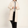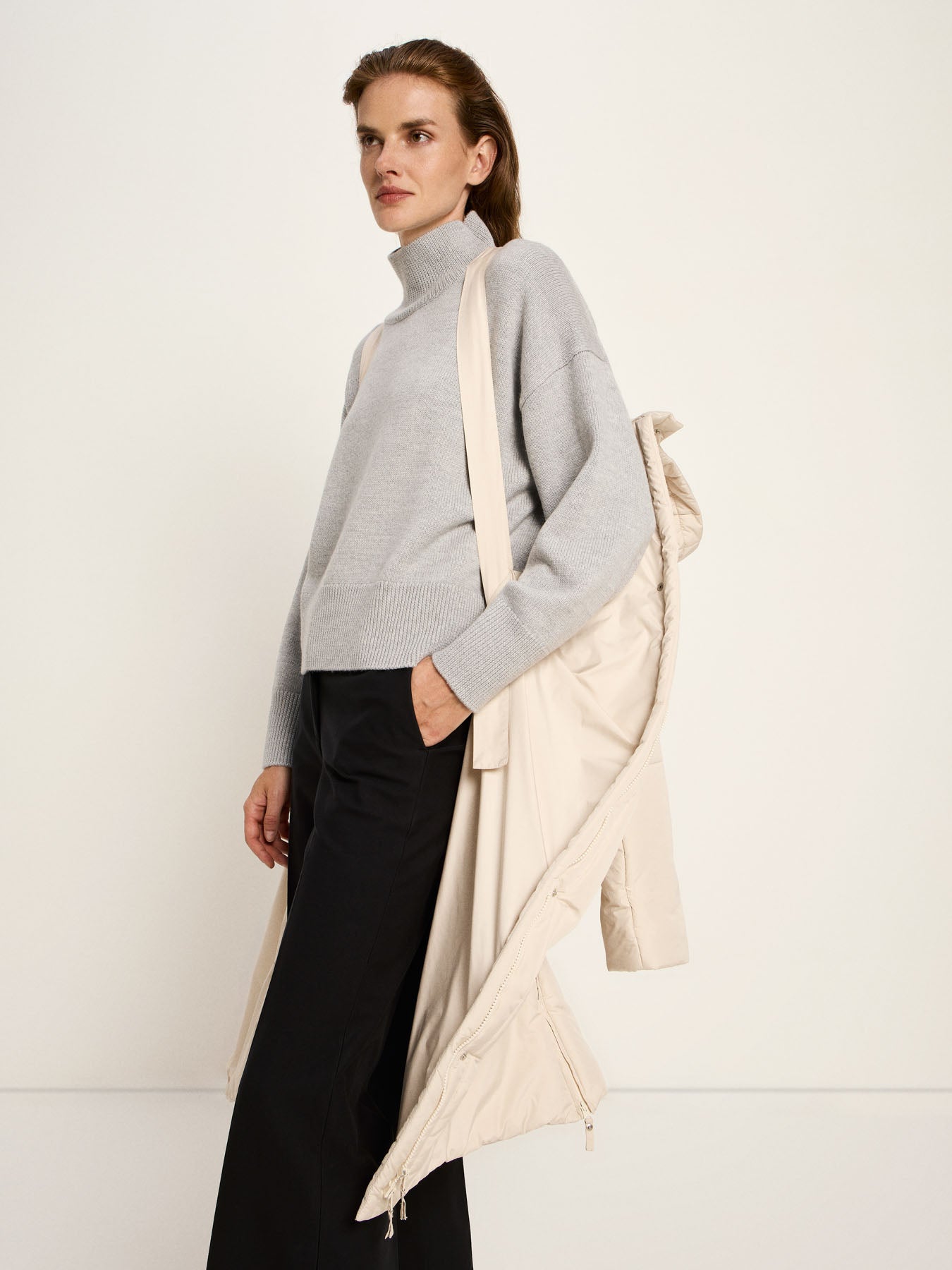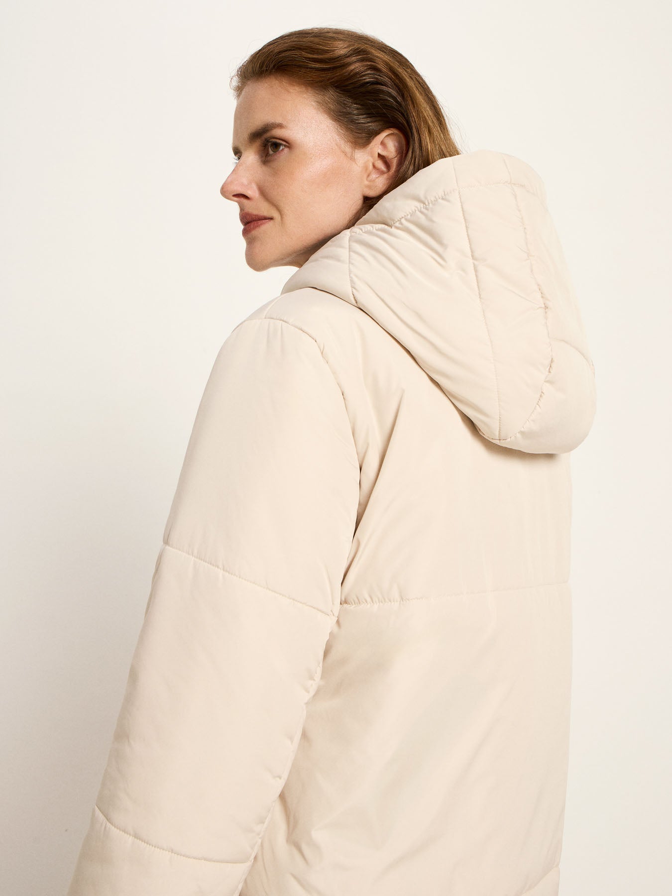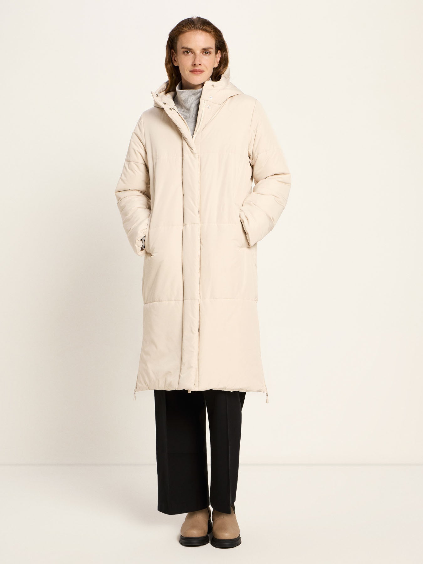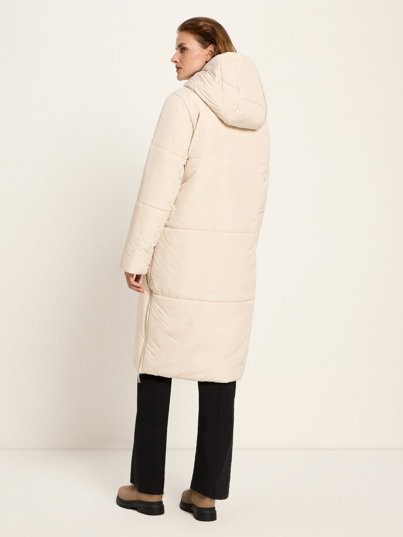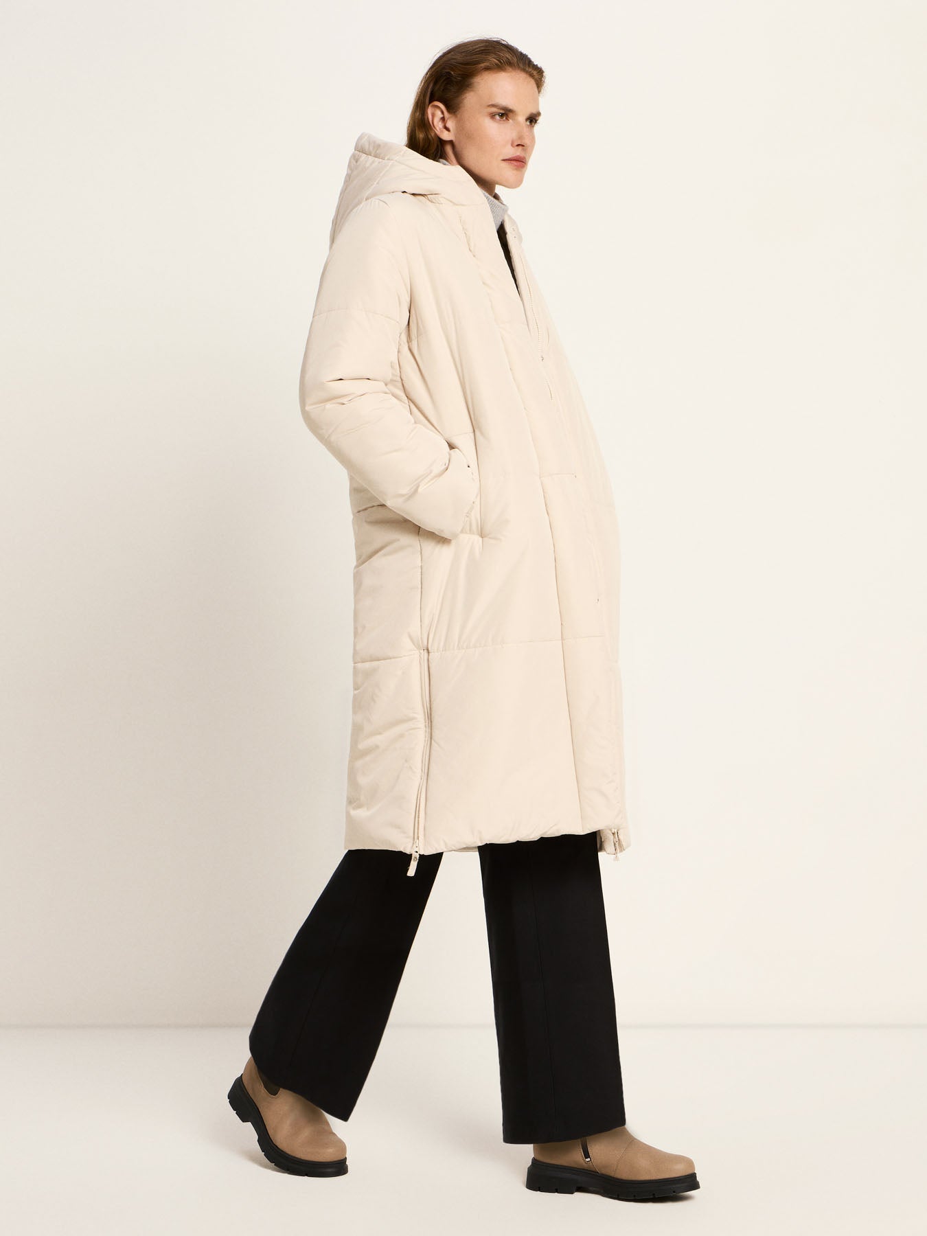 Dieser wattierte Mantel vereint zeitlose Eleganz, hohen Tragekomfort und Nachhaltigkeit. Der lange Schnitt mit Kapuze, verdecktem Reißverschluss und seitlichen Schlitzen mit Zipper sorgt für Bewegungsfreiheit und Funktionalität. Ein stilvoller Begleiter für kalte Tage, der sich sowohl lässig als auch elegant kombinieren lässt. Gefertigt aus recycelten Fasern (GRS-zertifiziert), steht der Mantel für verantwortungsbewusste Mode. Er hält angenehm warm, ohne zu beschweren, und überzeugt mit einem cleanen, minimalistischen Look, der vielseitig einsetzbar ist. LANIUS verbindet mit diesem Mantel Modebewusstsein, ökologische Verantwortung und faire Produktionsstandards.