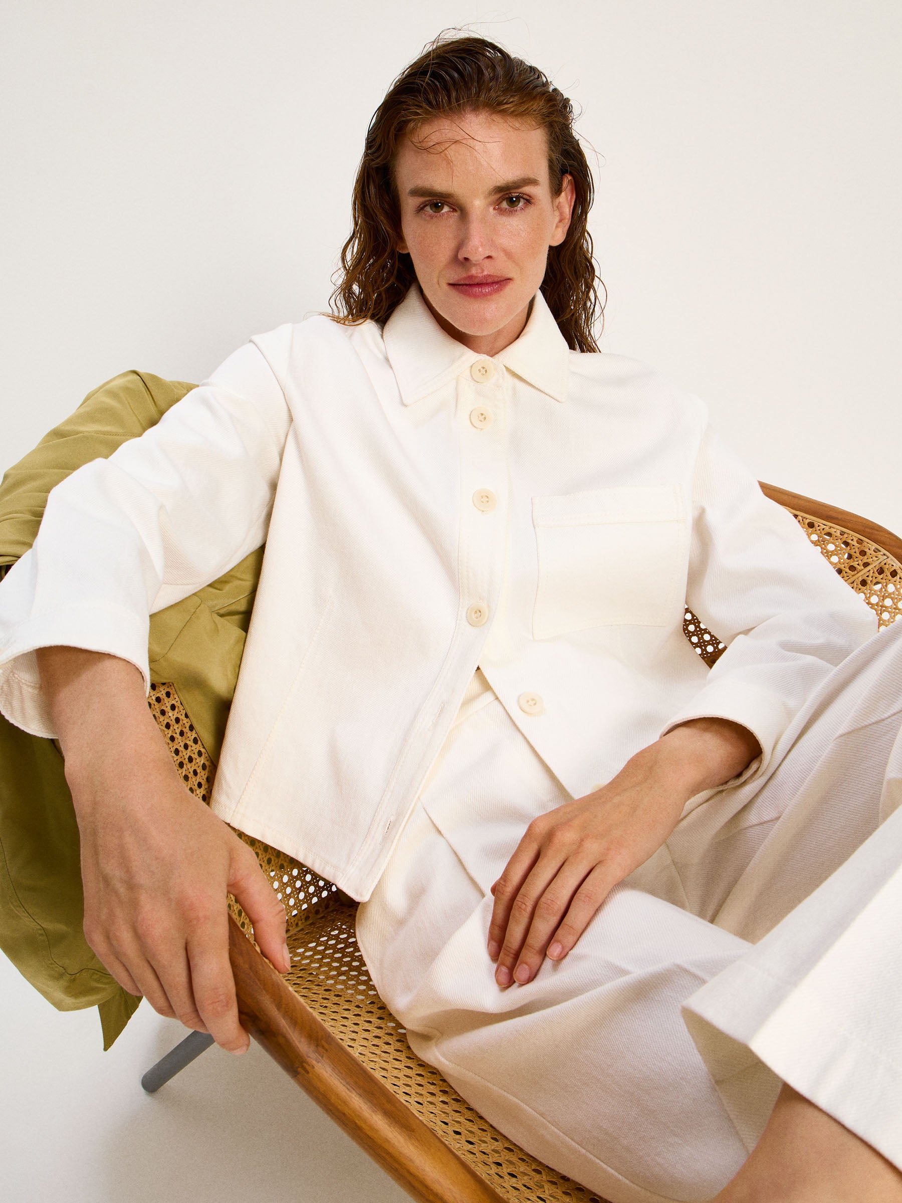 Diese Hemdjacke aus hochwertiger Bio-Baumwolle vereint minimalistisches Design mit verantwortungsvoller Materialwahl. Der gerade, leicht verkürzte Schnitt, der klassische Hemdkragen und die dezente Brusttasche verleihen dem Modell eine moderne, zeitlose Silhouette. Angenehm weich auf der Haut und zugleich puristisch im Design, funktioniert sie als leichte Übergangsjacke oder stilvolles Layering-Piece.