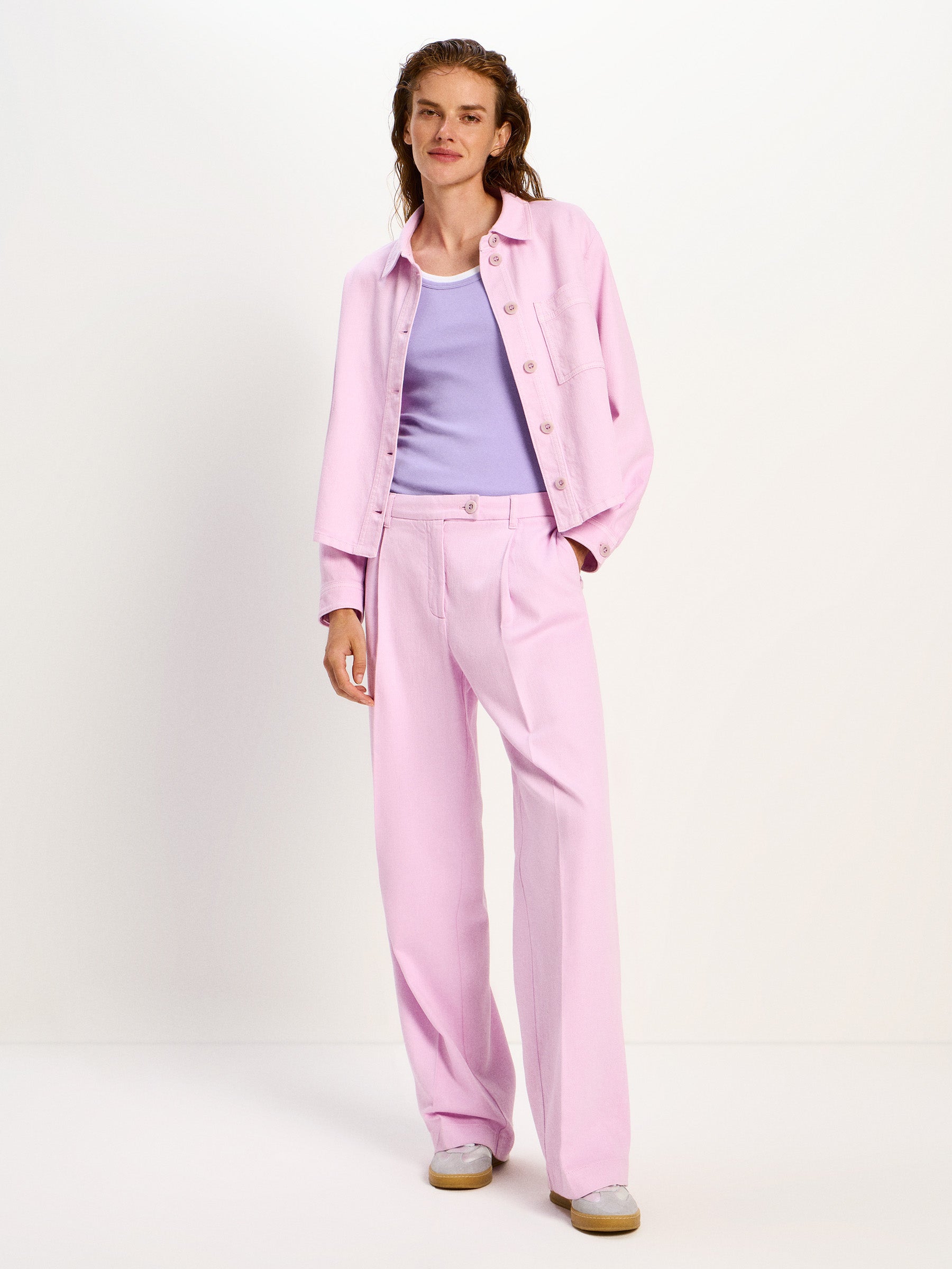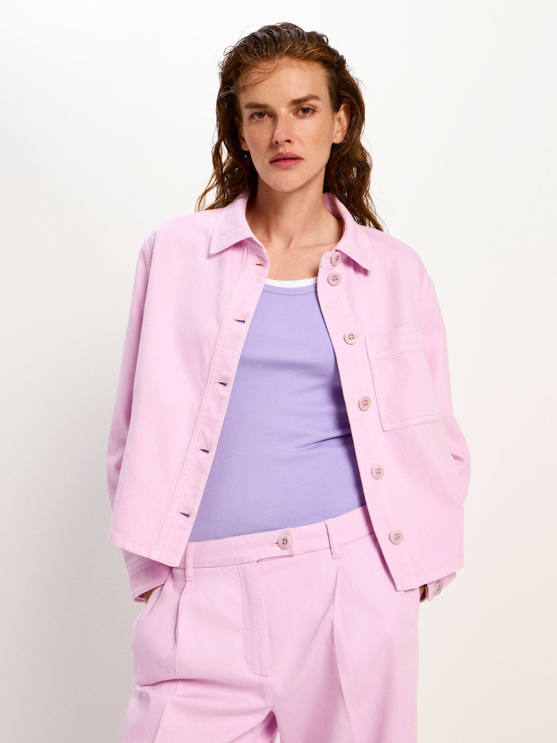 Diese Hemdjacke aus hochwertiger Bio-Baumwolle vereint minimalistisches Design mit verantwortungsvoller Materialwahl. Der gerade, leicht verkürzte Schnitt, der klassische Hemdkragen und die dezente Brusttasche verleihen dem Modell eine moderne, zeitlose Silhouette. Angenehm weich auf der Haut und zugleich puristisch im Design, funktioniert sie als leichte Übergangsjacke oder stilvolles Layering-Piece.