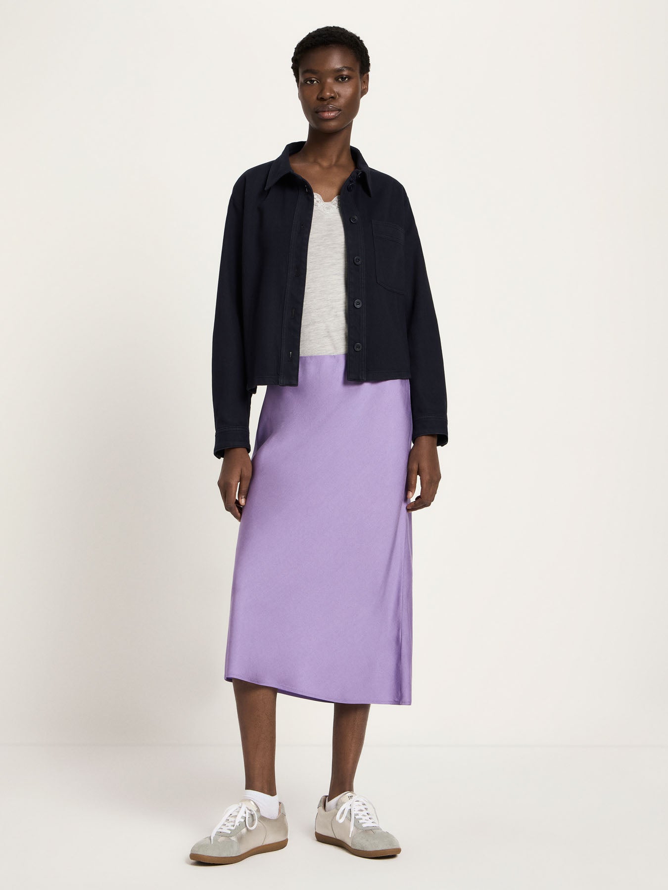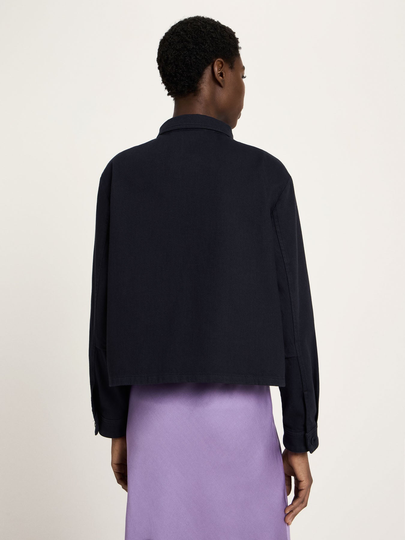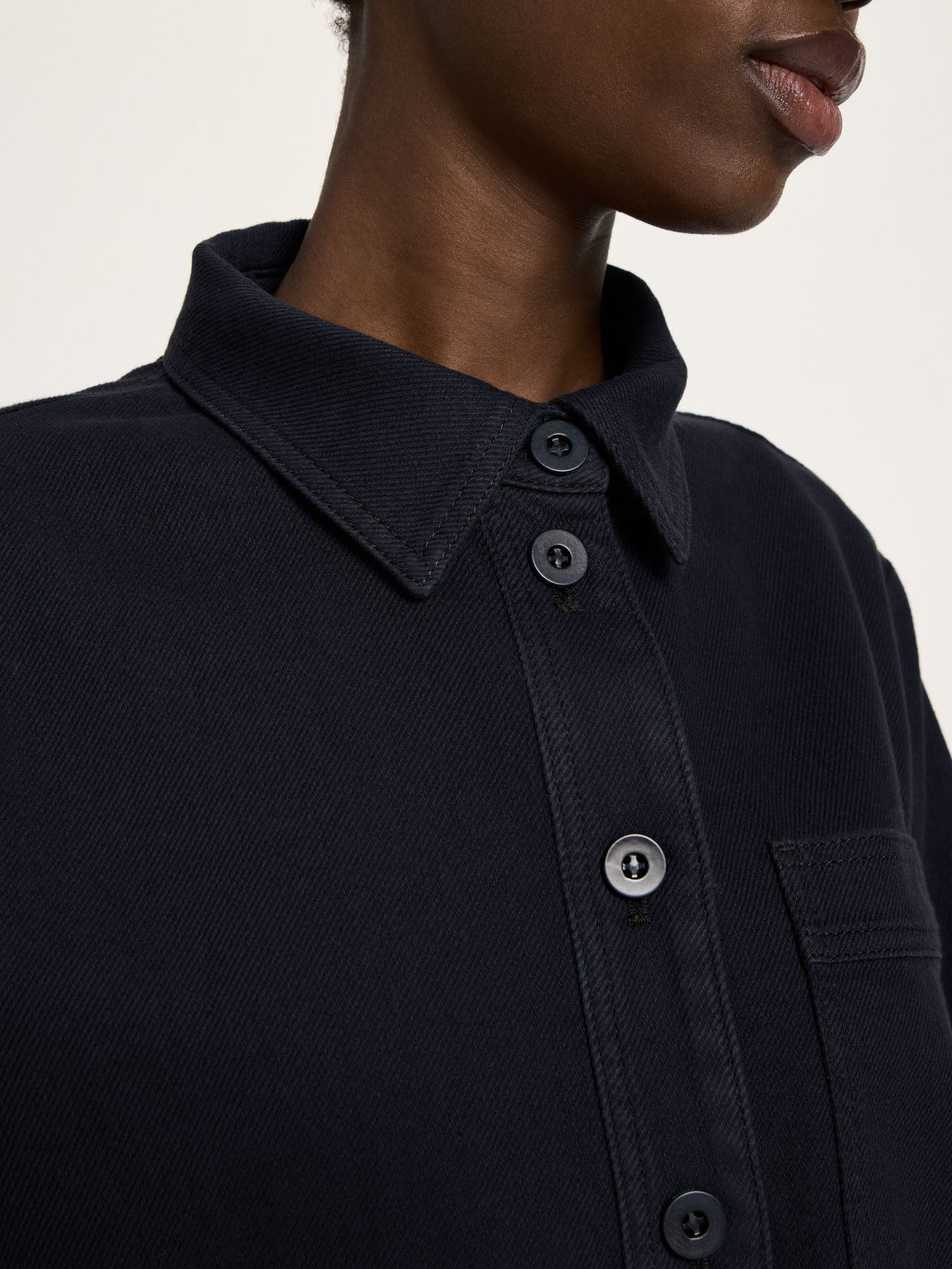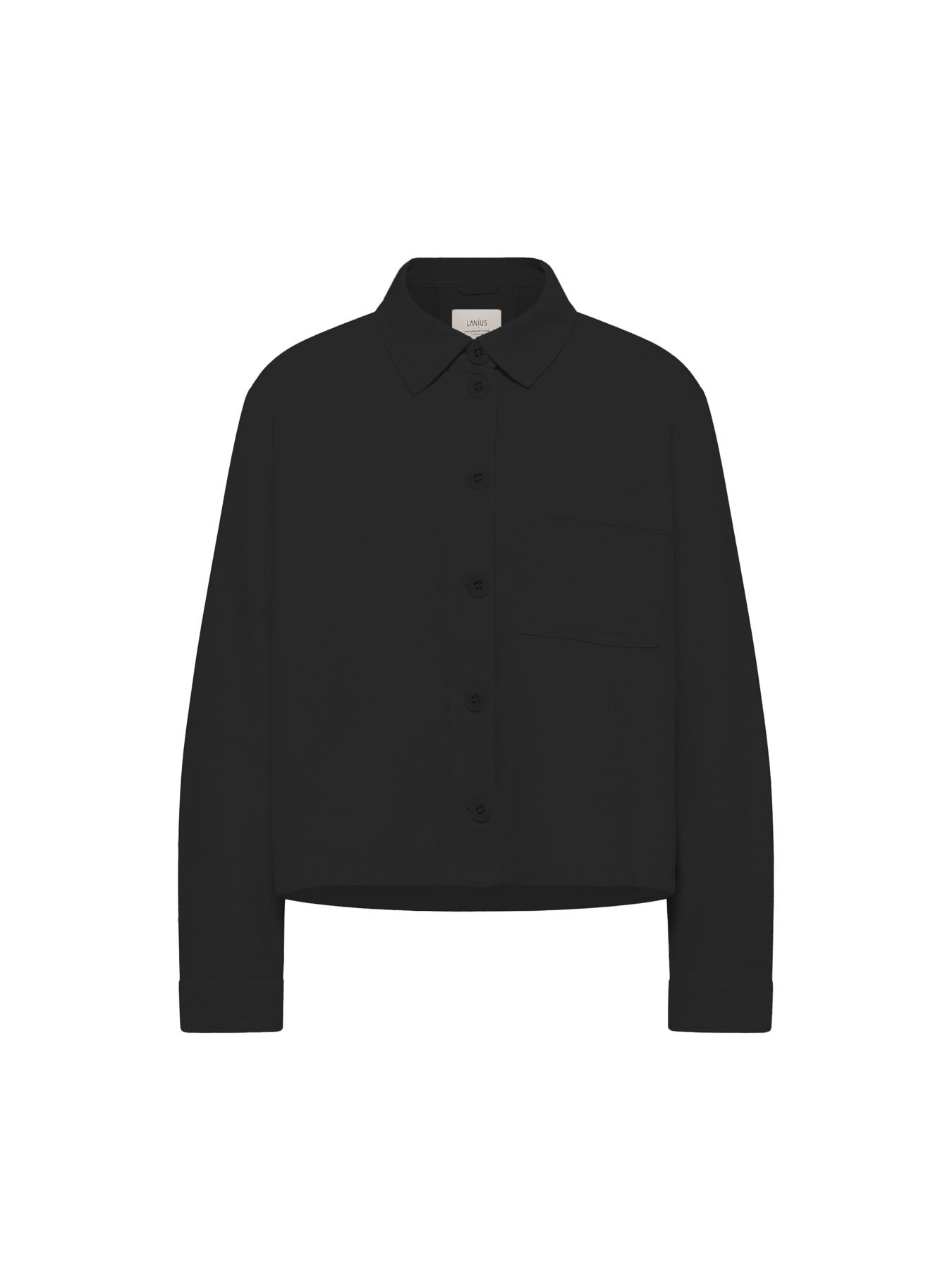 Diese Hemdjacke aus hochwertiger Bio-Baumwolle vereint minimalistisches Design mit verantwortungsvoller Materialwahl. Der gerade, leicht verkürzte Schnitt, der klassische Hemdkragen und die dezente Brusttasche verleihen dem Modell eine moderne, zeitlose Silhouette. Angenehm weich auf der Haut und zugleich puristisch im Design, funktioniert sie als leichte Übergangsjacke oder stilvolles Layering-Piece.