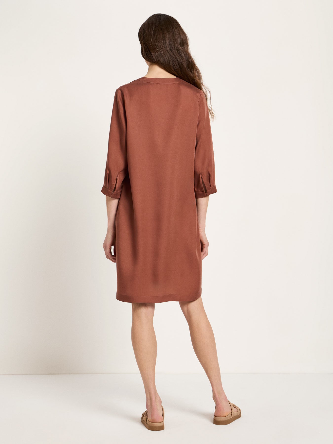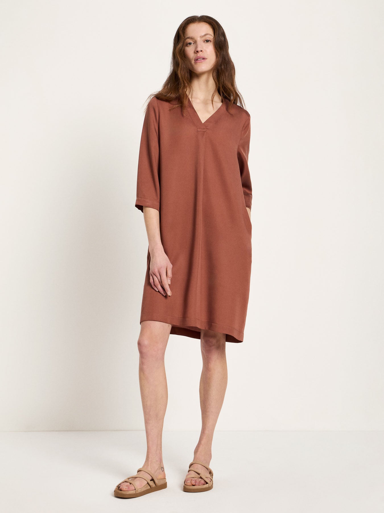 This dress made from TENCEL™ fabric impresses with its pure simplicity and maximum comfort. The material feels exceptionally soft, drapes beautifully, and offers pleasant temperature regulation – ideal for warm days and effortless looks year-round. The V-neck adds a subtle, feminine touch and creates a flattering silhouette. The clean lines make the dress incredibly versatile: wear it on its own with sandals and jewelry, casually with sneakers, or dressed up with a blazer and loafers. A timeless essential that can be styled from minimalist to elegant, depending on how you choose to wear it.