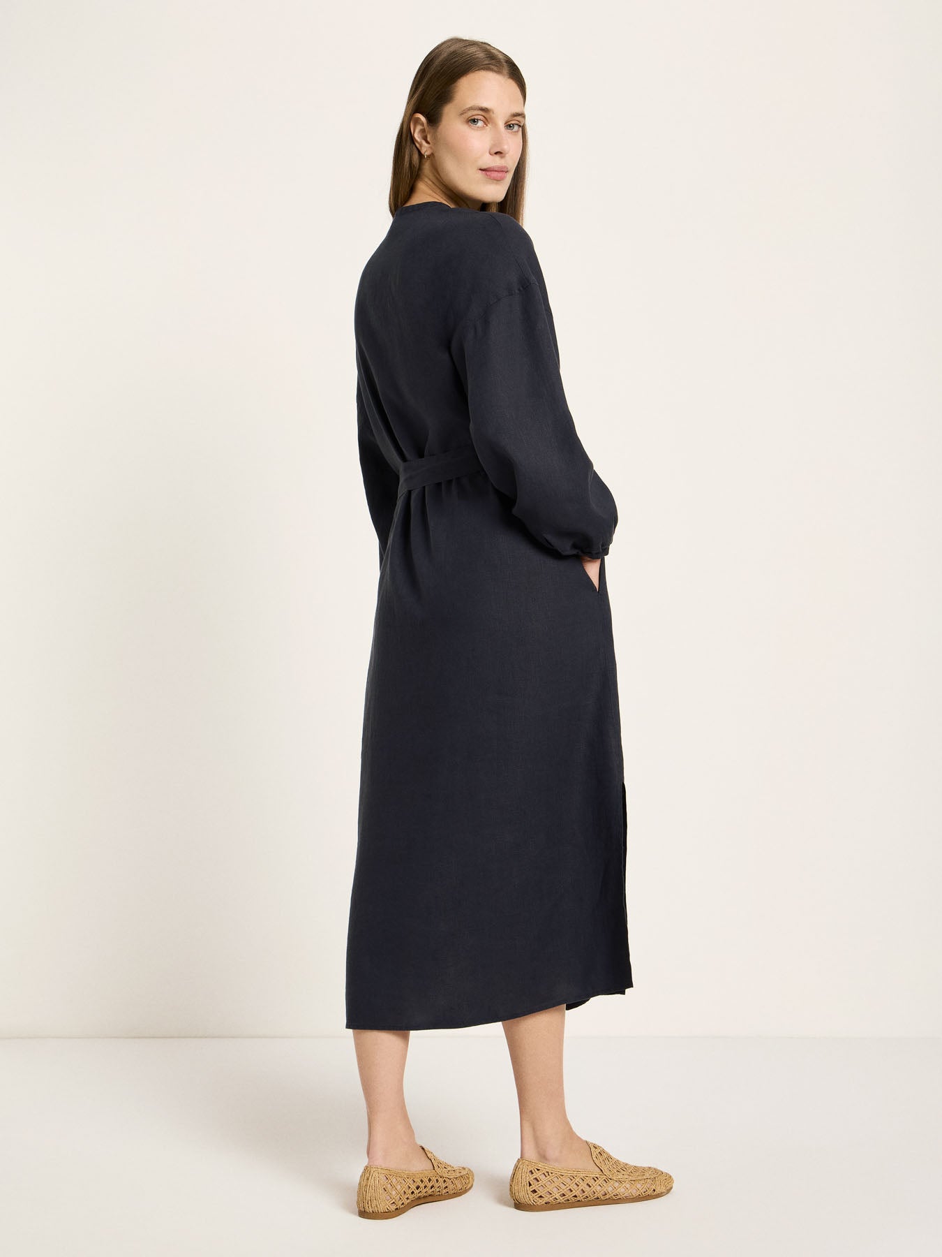 This midi dress in organic linen combines timeless elegance with exceptional comfort. The full button placket lends the design a classic touch, while the tailored cut creates a feminine silhouette. The long sleeves and flowing length make the dress a versatile companion – depending on how you style it, it can look casual, modern, or elegant. Organic linen is particularly comfortable to wear: the natural fiber is breathable, temperature-regulating, and boasts a high-quality, natural texture. This makes the midi dress ideal for warm days, but it can also be easily combined with other fabrics during transitional seasons.