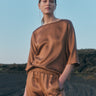 This 3/4-sleeve blouse impresses with its flowing silhouette, natural sheen, and pleasantly smooth surface. The slightly oversized cut, classic round neck, and shortened sleeves create a modern, minimalist design. Made from vegan-friendly materials, it's ideal for combining with the matching trousers or skirt for a feminine all-over look, or for a contrasting style, style it with high-waisted jeans in a dark wash.