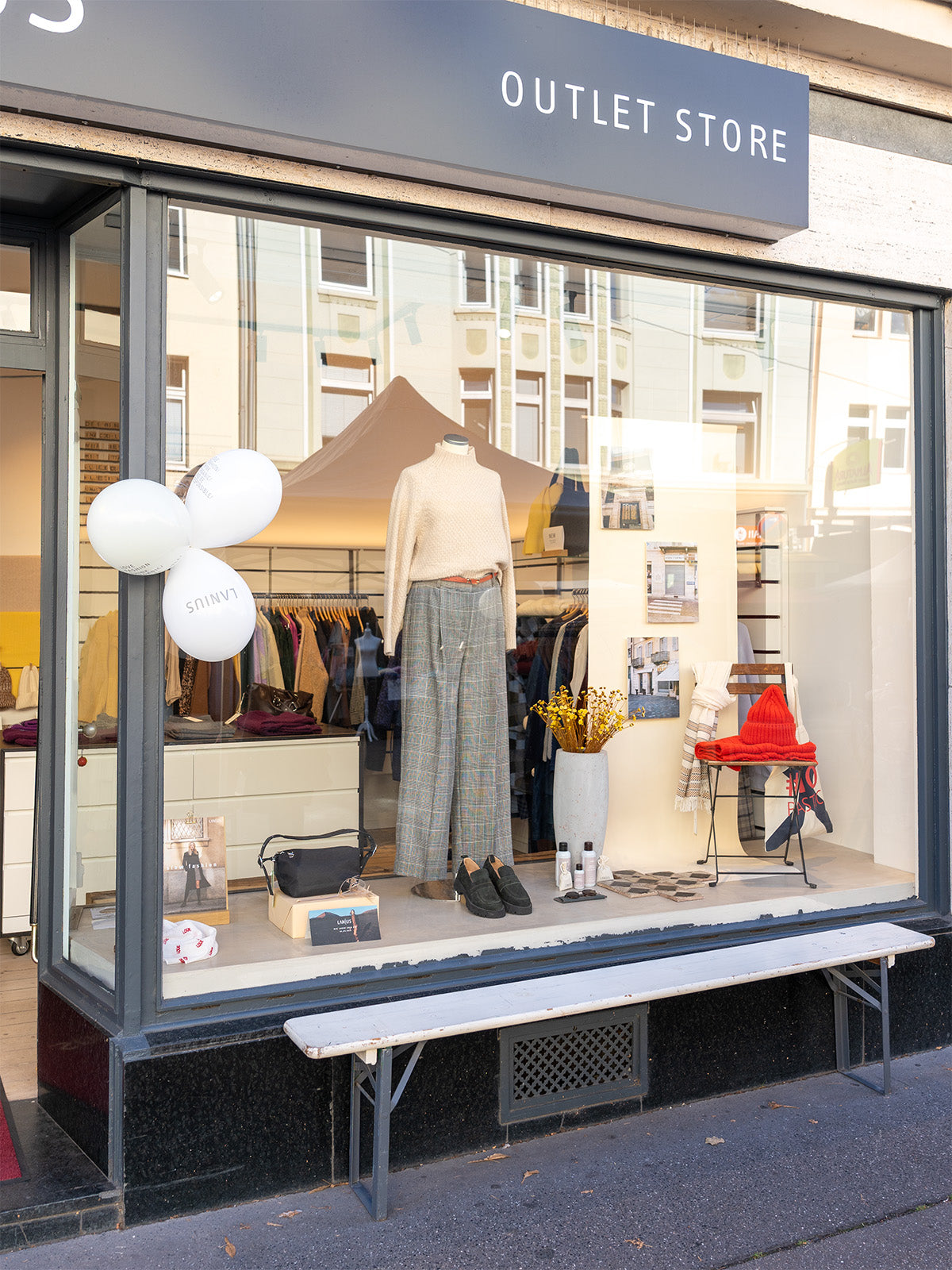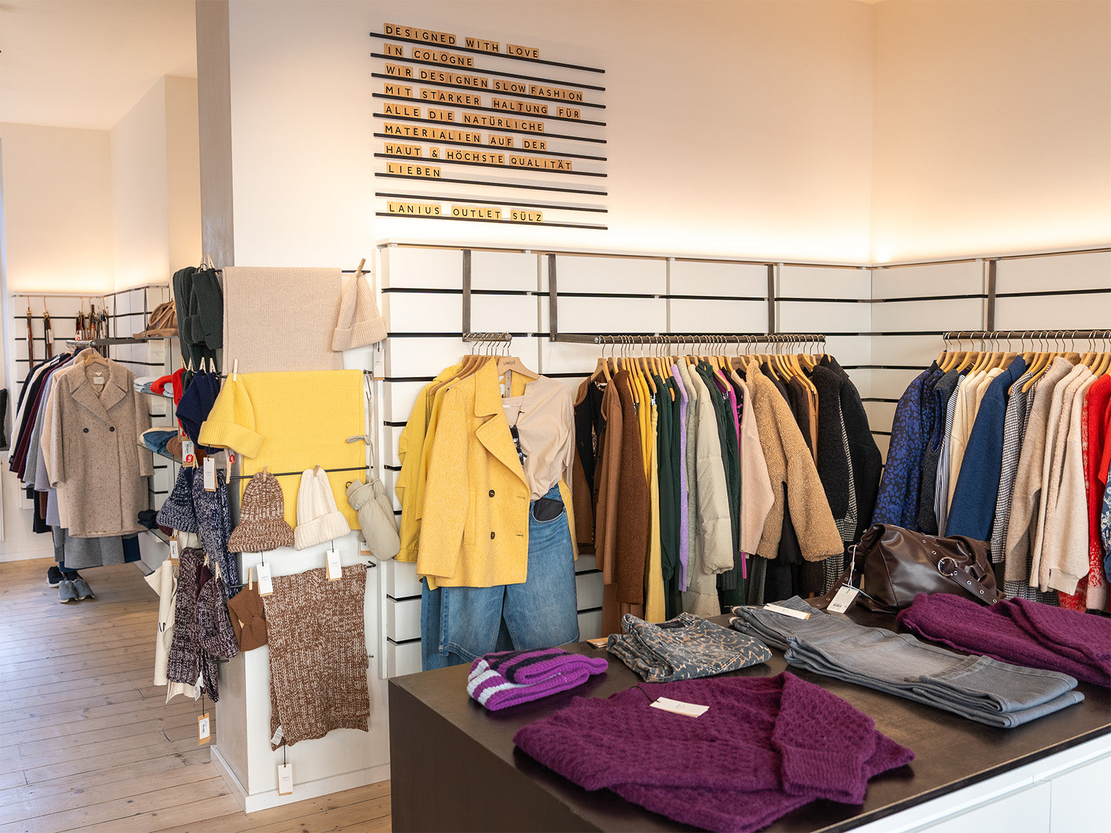 In the LANIUS Outlet Store on the busy Berrenrather Straße, we make bargain hunters' hearts beat a little faster. Here you can discover individual pieces and sample pieces from past and current seasons in a pleasant atmosphere. The so-called "samples" find their way to our outlet a few months after our trade fair appearances to bring you joy. Since the samples are usually produced in size 38, this is also the size that is mainly available in our outlet store.