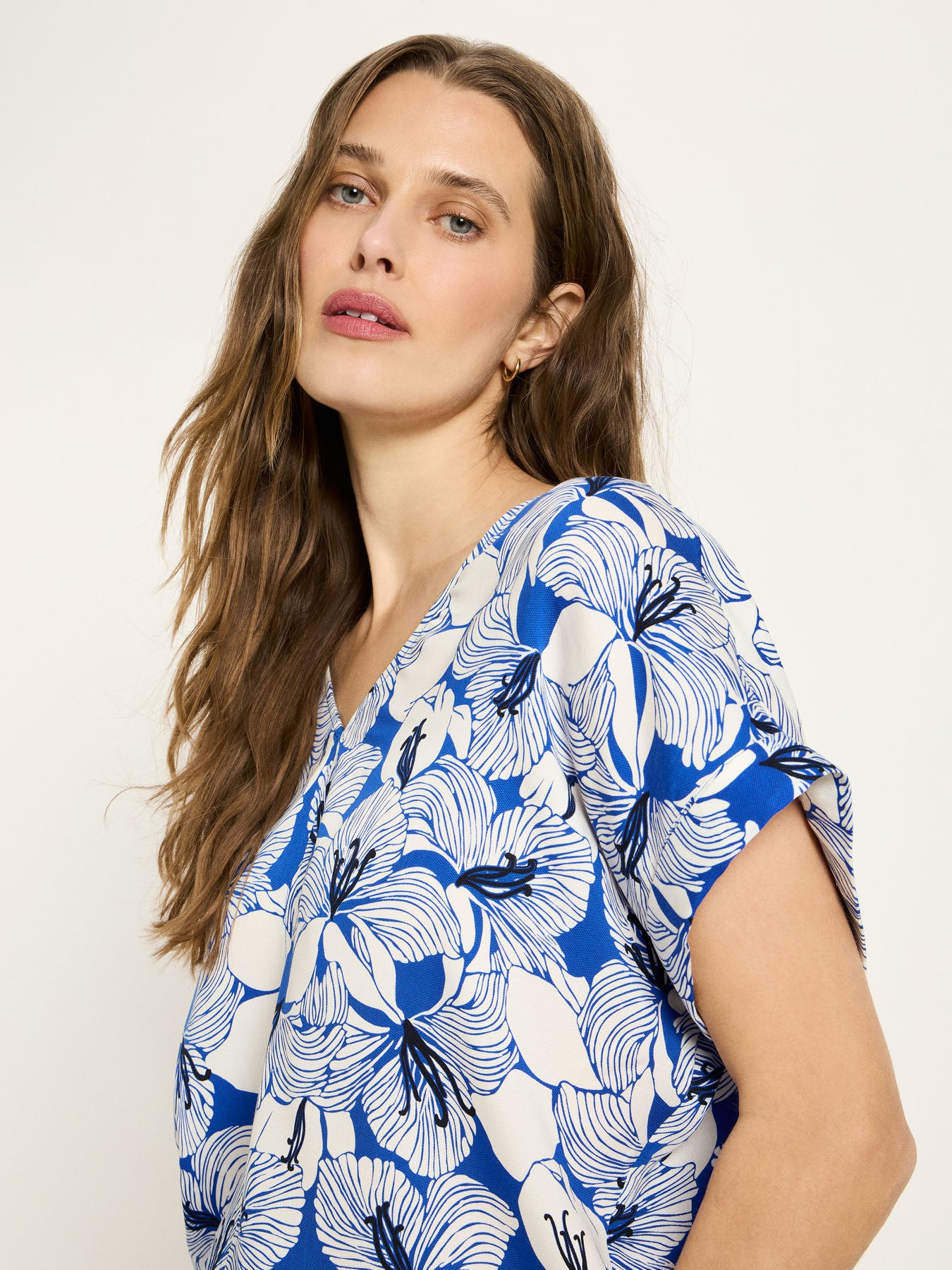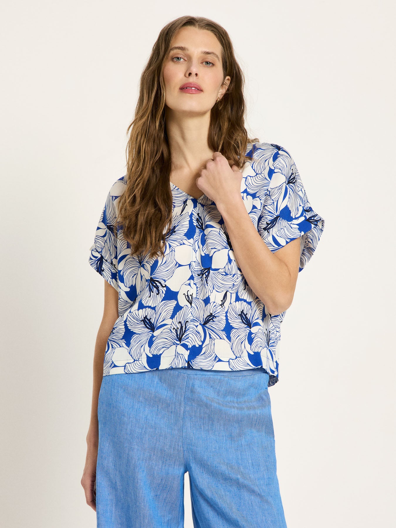 This blouse-style top, made from 100% TENCEL™ Lyocell, combines a modern print with a relaxed yet elegant silhouette. The flowing fabric drapes softly, feels pleasantly cool against the skin, and is ideal for warm days – or as an effortlessly stylish key piece for layering. With its loose fit and dropped shoulders, this blouse-style top brings a touch of laid-back elegance to any look: whether paired with denim, flowing trousers, or as a stylish contrast to clean basics.