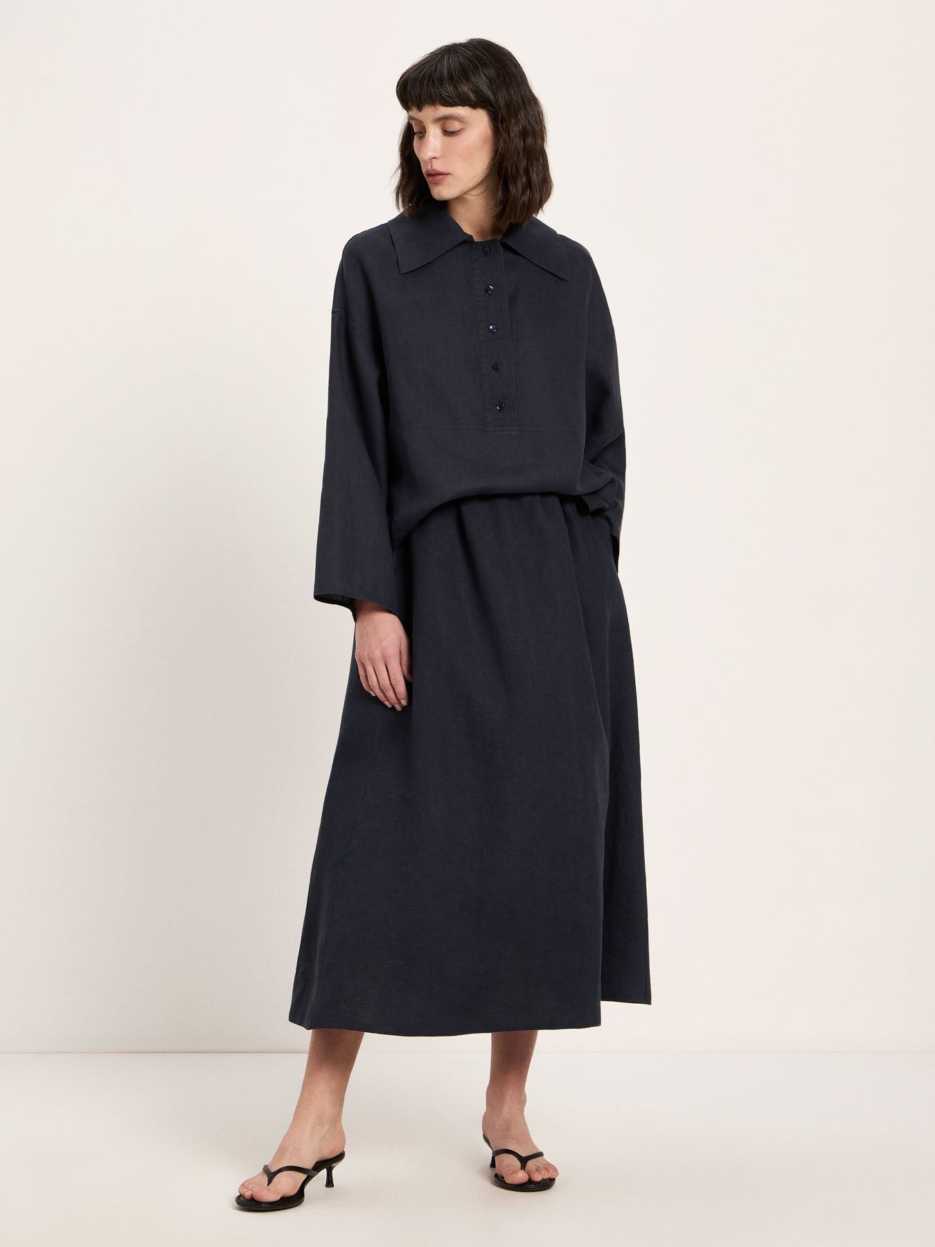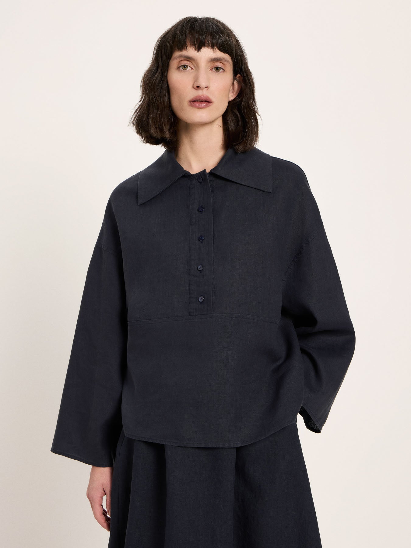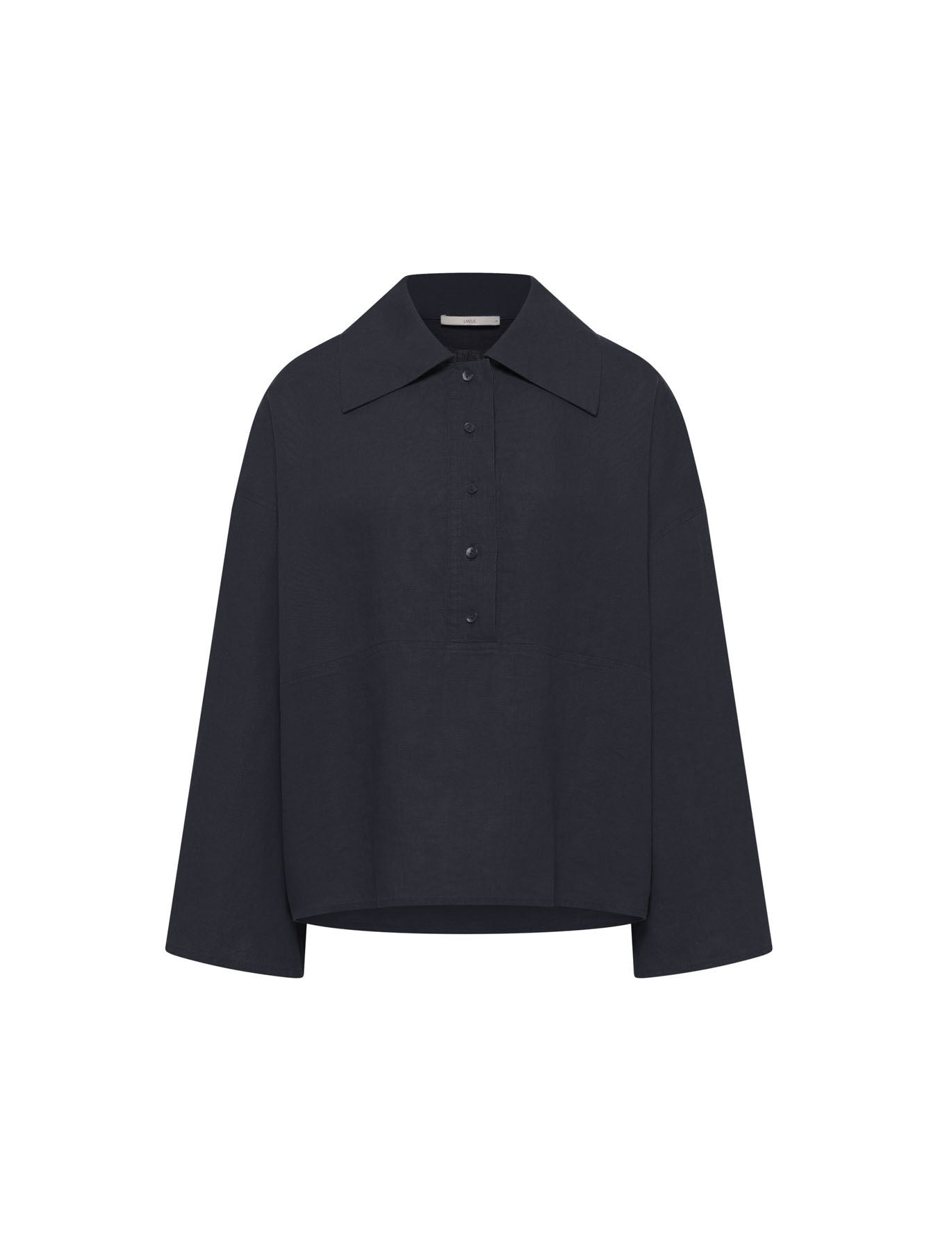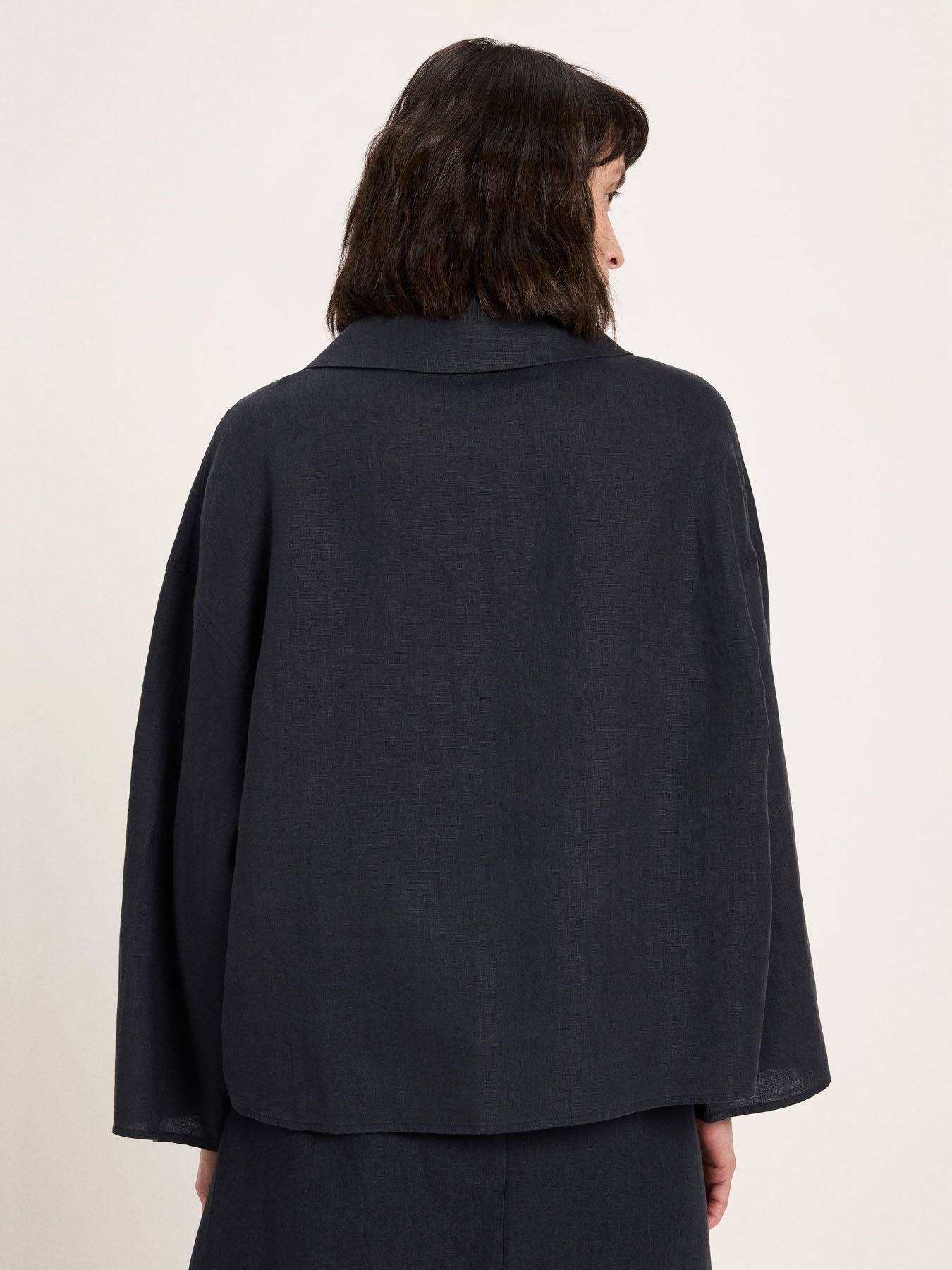 This oversized blouse in organic linen combines a modern silhouette with a comfortable feel. The relaxed fit allows for plenty of freedom of movement, while the classic collar and button placket lend the design a clean, timeless touch. The slightly cropped length is effortlessly stylish and can be paired with high-waisted trousers, skirts, or shorts. Organic linen is especially popular for warm days: the natural fiber is breathable, temperature-regulating, and feels pleasantly light against the skin. At the same time, the material impresses with its characteristic texture and high-quality look – ideal for sophisticated yet casual styles.