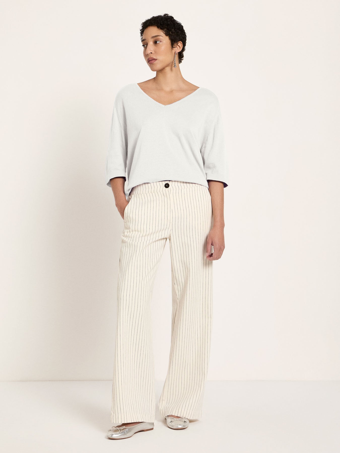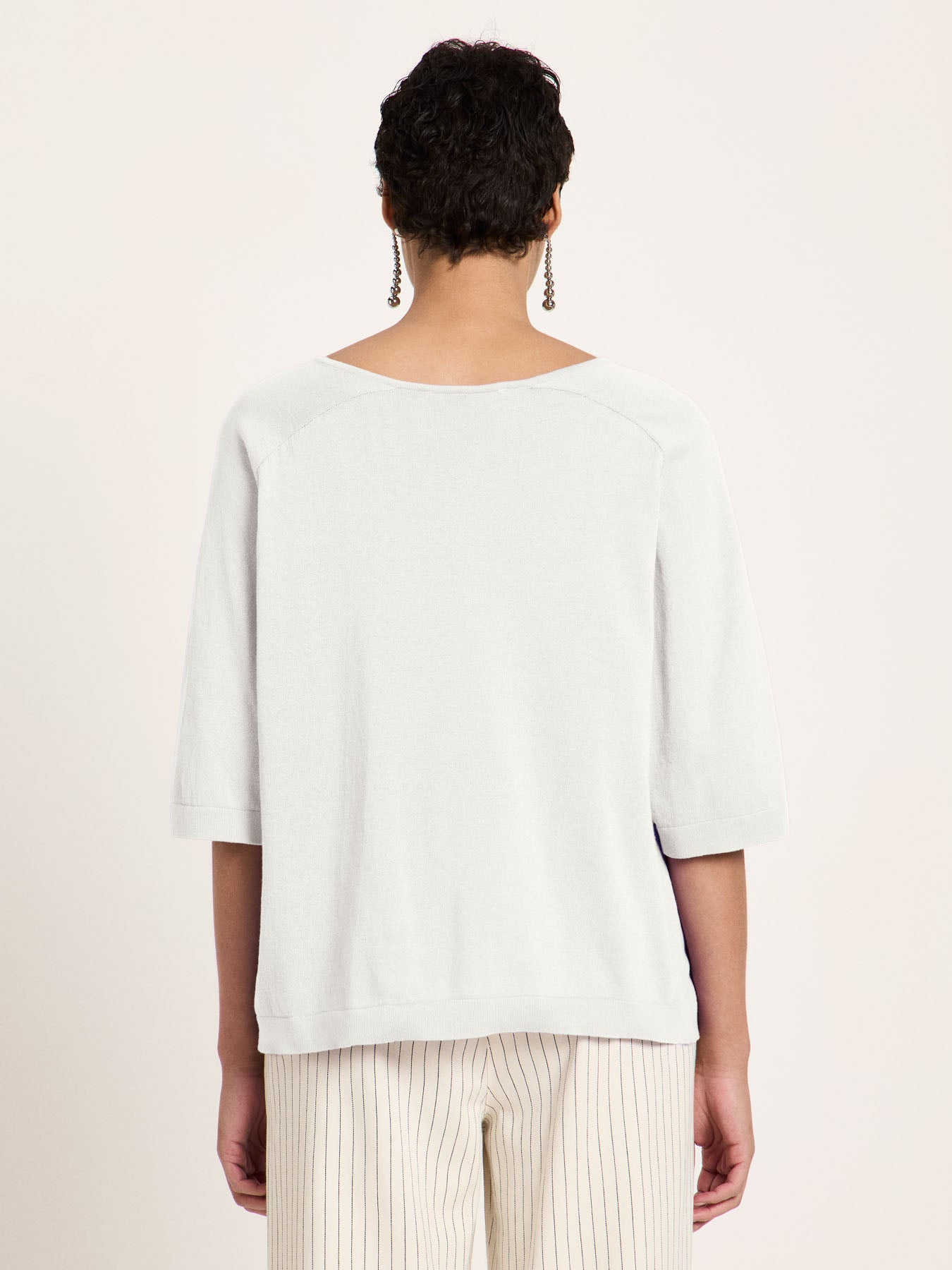 Clean, modern, and versatile: Our organic cotton knit top is a timeless essential with a special twist. The V-neck creates a feminine silhouette, while the relaxed fit and dropped shoulders offer a comfortable, flattering look – perfect for effortlessly stylish outfits. The organic cotton feels wonderfully soft and is breathable, making it ideal for every season: wear it on its own in spring, as a light knit top in summer, and layered under a blazer or cardigan in cooler weather.