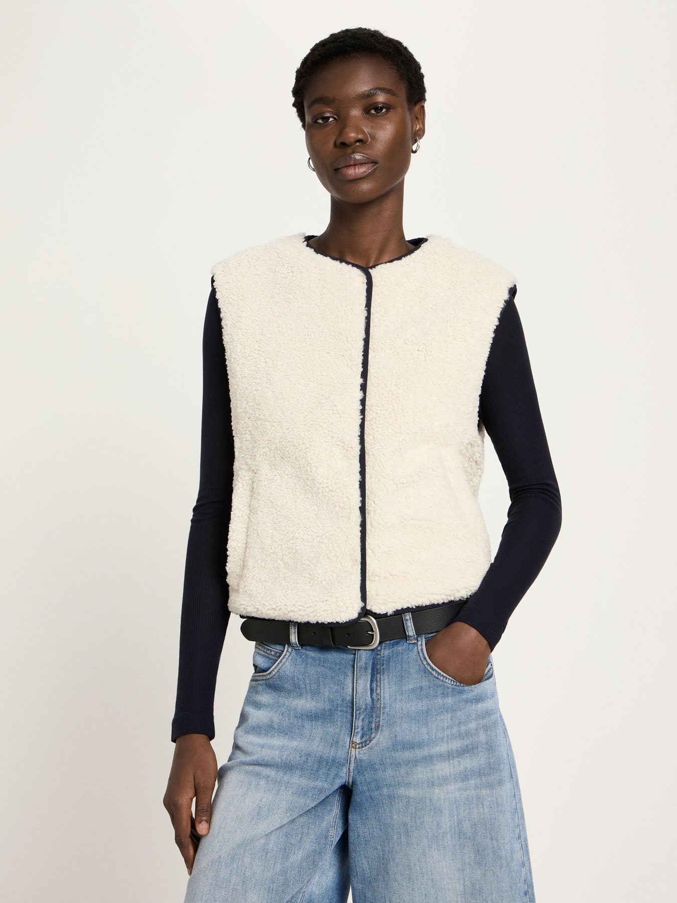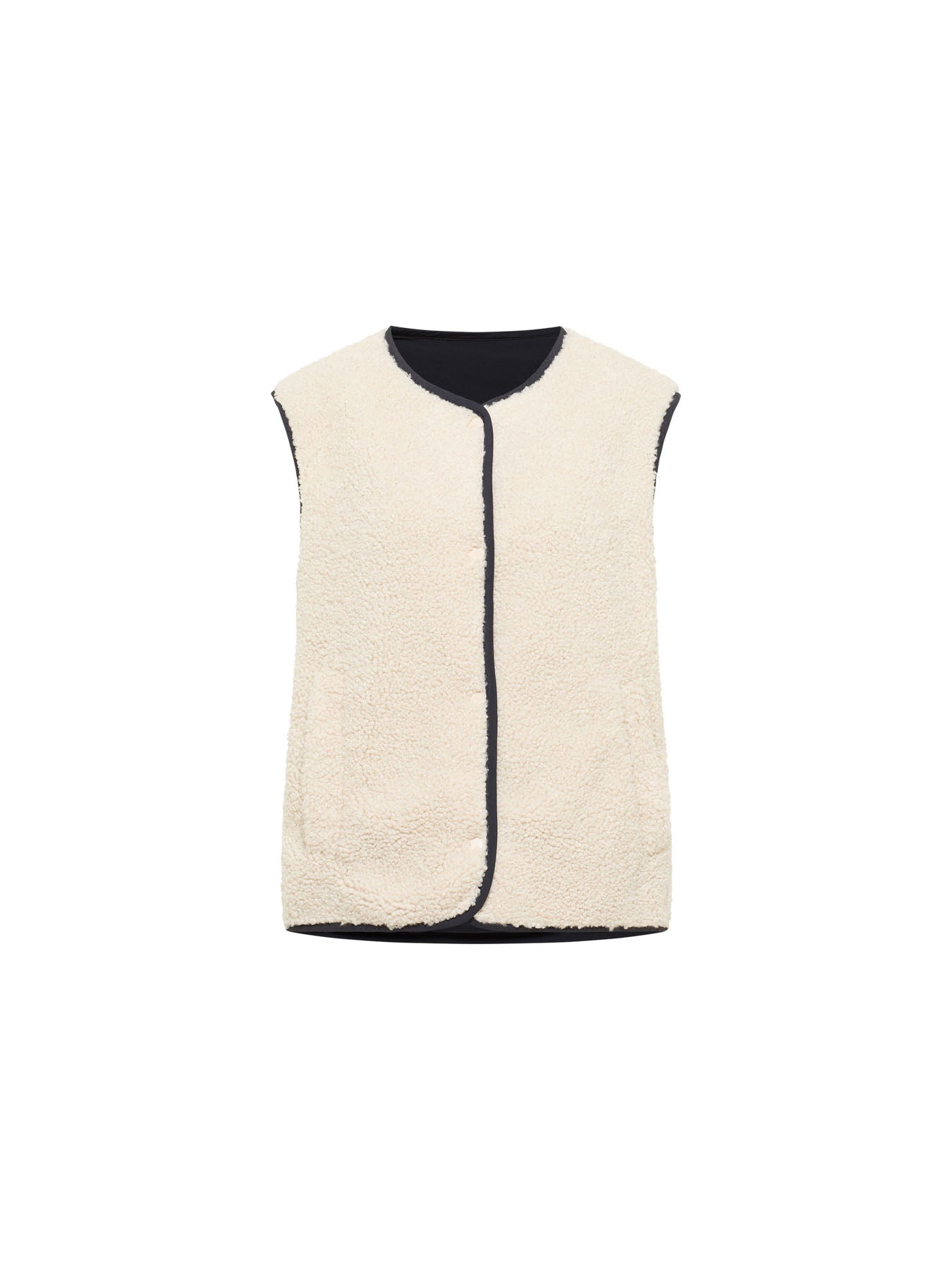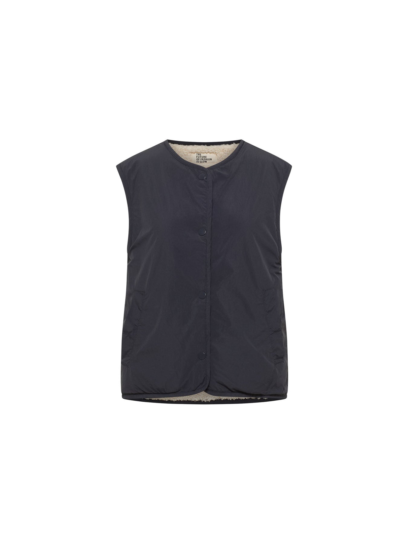 Unsere wendbare Weste verbindet durchdachte Funktionalität mit stilvollem Design. Gefertigt aus recyceltem Polyamid ist sie wasserabweisend, weich und angenehm wärmend – ideal für wechselhafte Tage. Zwei unterschiedlich gestaltete Seiten ermöglichen flexible Looks: eine glatte Oberfläche mit Steppung trifft auf eine weiche Teddyseite für mehr Struktur und Komfort. Der gerade, etwas kürzere Schnitt, praktische Eingrifftaschen und der Druckknopfverschluss machen die Weste zum vielseitigen Lieblingsstück für Übergangszeiten oder entspannte Layering-Outfits.
