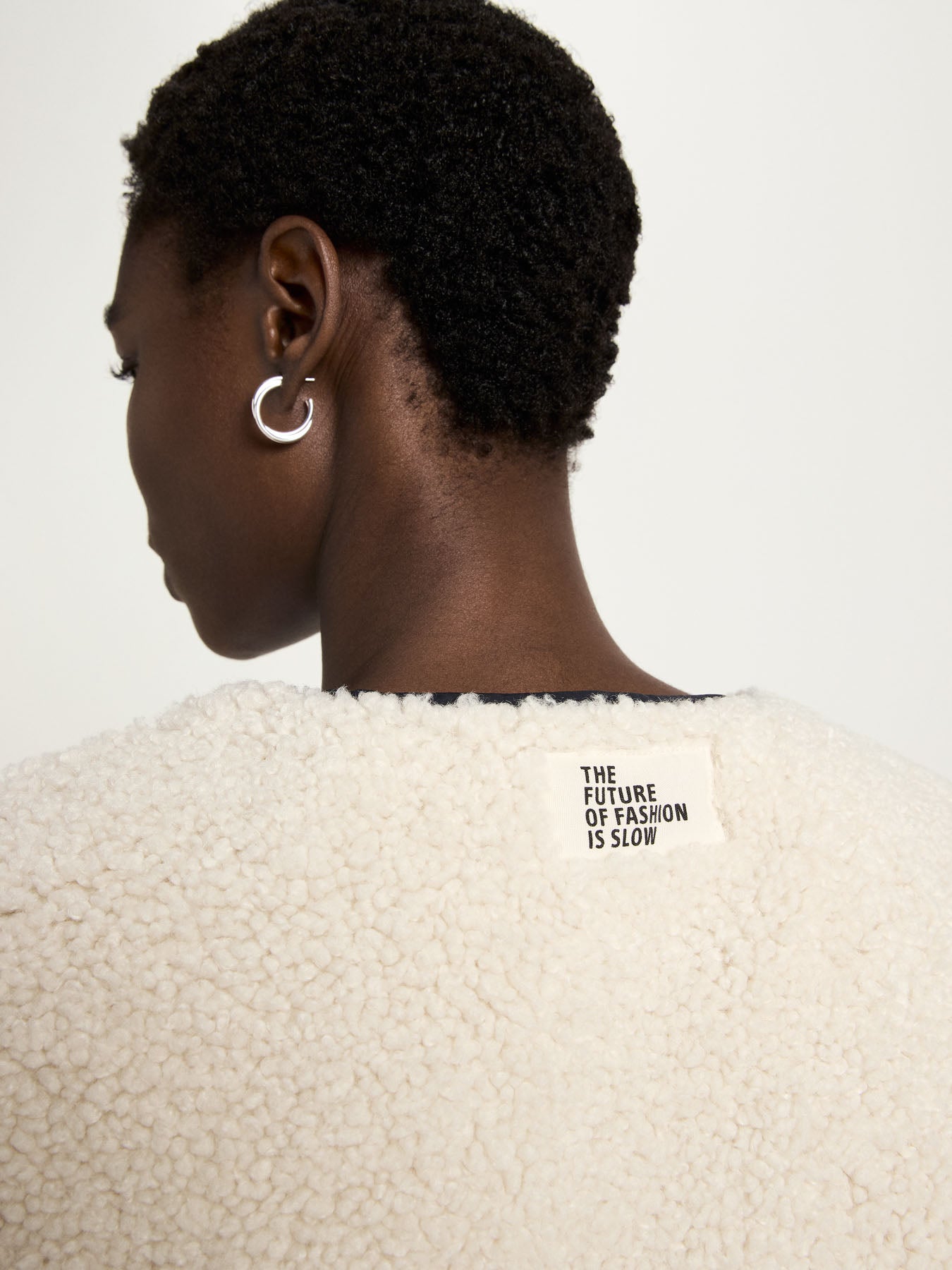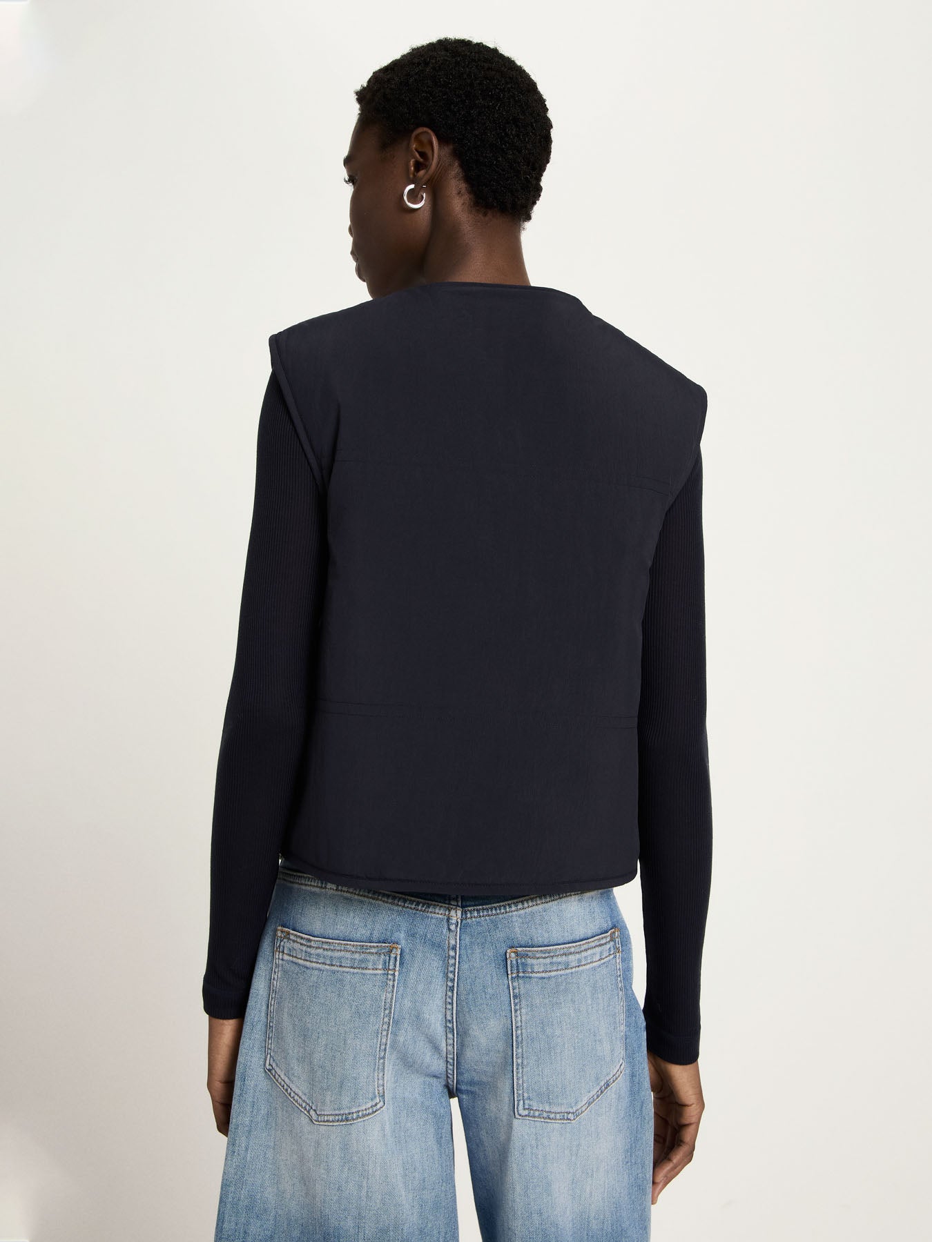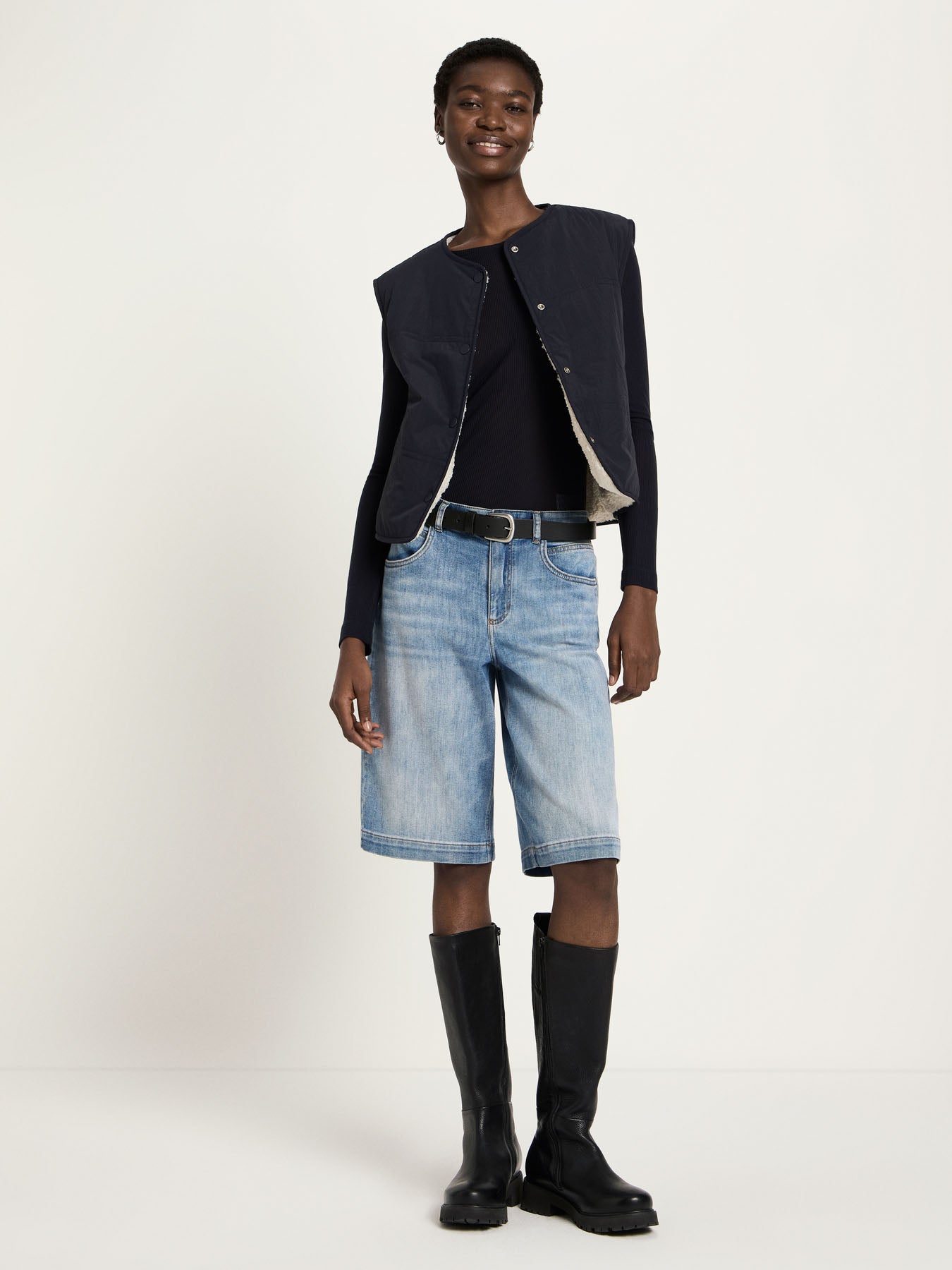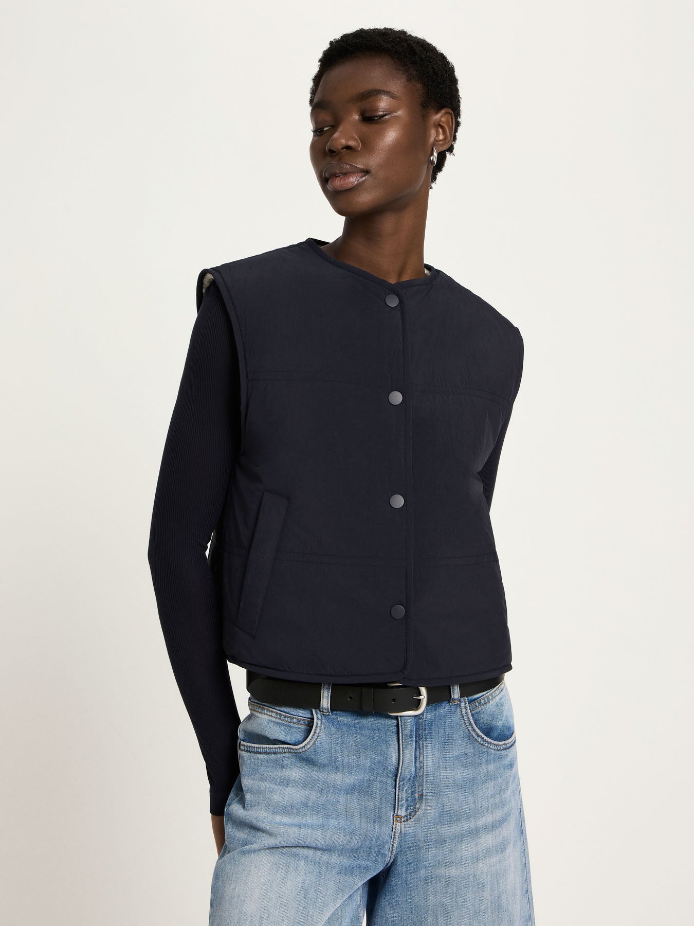 Unsere wendbare Weste verbindet durchdachte Funktionalität mit stilvollem Design. Gefertigt aus recyceltem Polyamid ist sie wasserabweisend, weich und angenehm wärmend – ideal für wechselhafte Tage. Zwei unterschiedlich gestaltete Seiten ermöglichen flexible Looks: eine glatte Oberfläche mit Steppung trifft auf eine weiche Teddyseite für mehr Struktur und Komfort. Der gerade, etwas kürzere Schnitt, praktische Eingrifftaschen und der Druckknopfverschluss machen die Weste zum vielseitigen Lieblingsstück für Übergangszeiten oder entspannte Layering-Outfits.