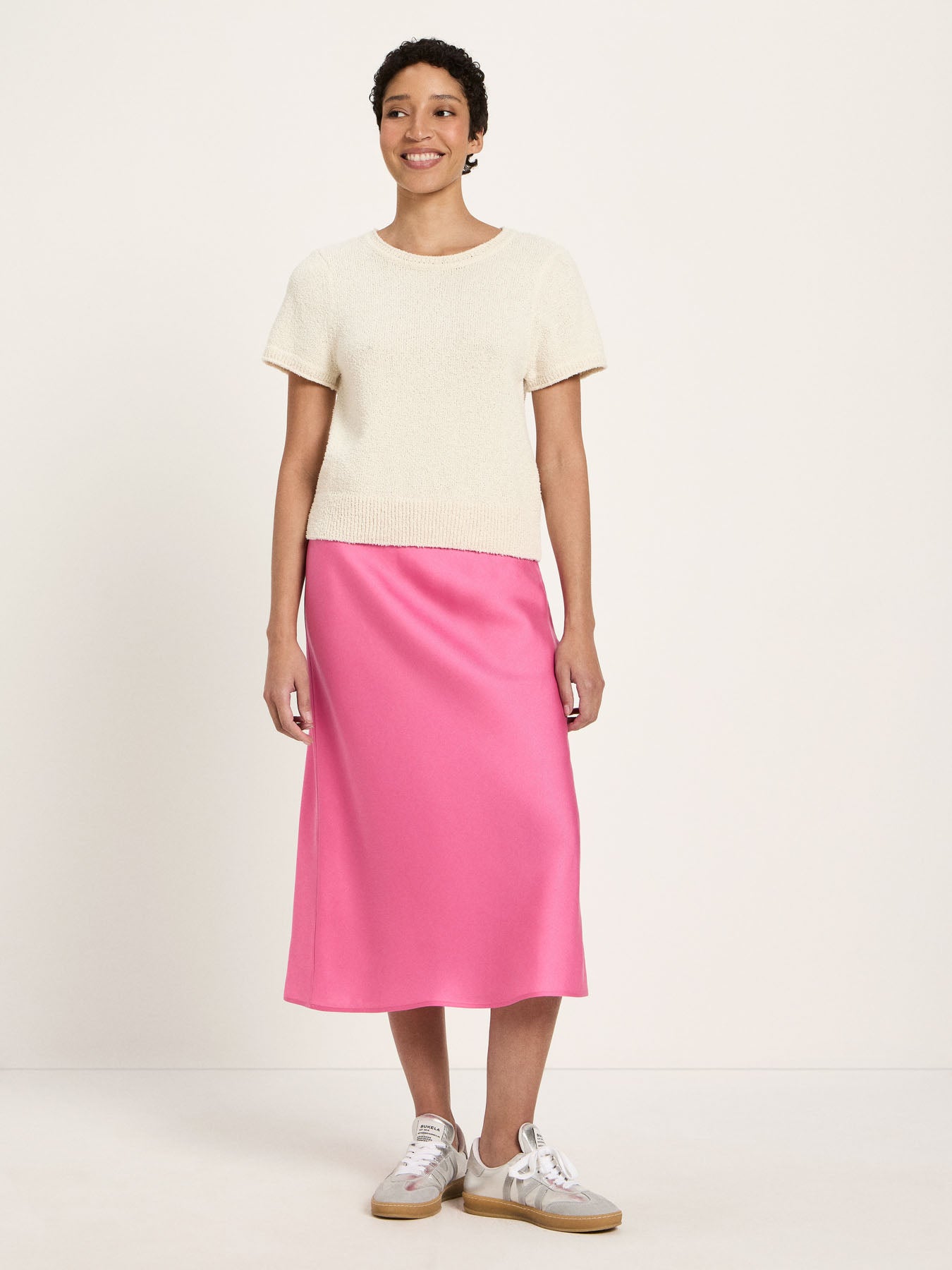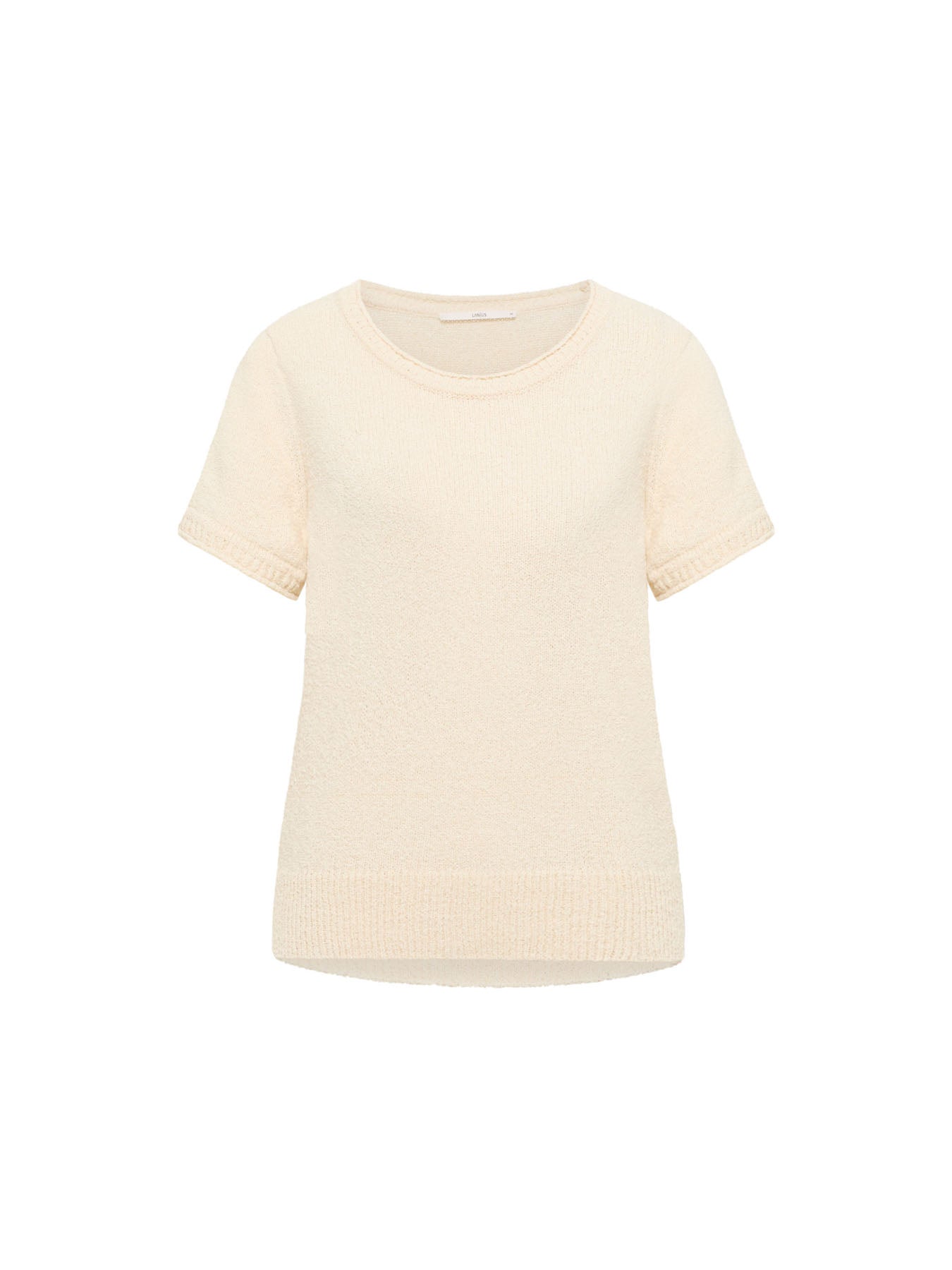 Dieser Bouclé Kurzarm-Pullover setzt auf eine klare Silhouette und eine besondere Oberfläche. Die charakteristische Bouclé-Struktur sorgt für einen hochwertigen Look und bringt subtile Spannung in jedes Outfit. Die Materialkombination aus Bio-Baumwolle und recyceltem Polyester fühlt sich angenehm weich an und gibt dem Strick gleichzeitig Stabilität. Dank des Kurzarm-Designs lässt sich der Pullover vielseitig stylen: solo getragen wirkt er clean und modern, über Bluse oder Longsleeve wird er zum unkomplizierten Layering-Piece für Übergangstage.