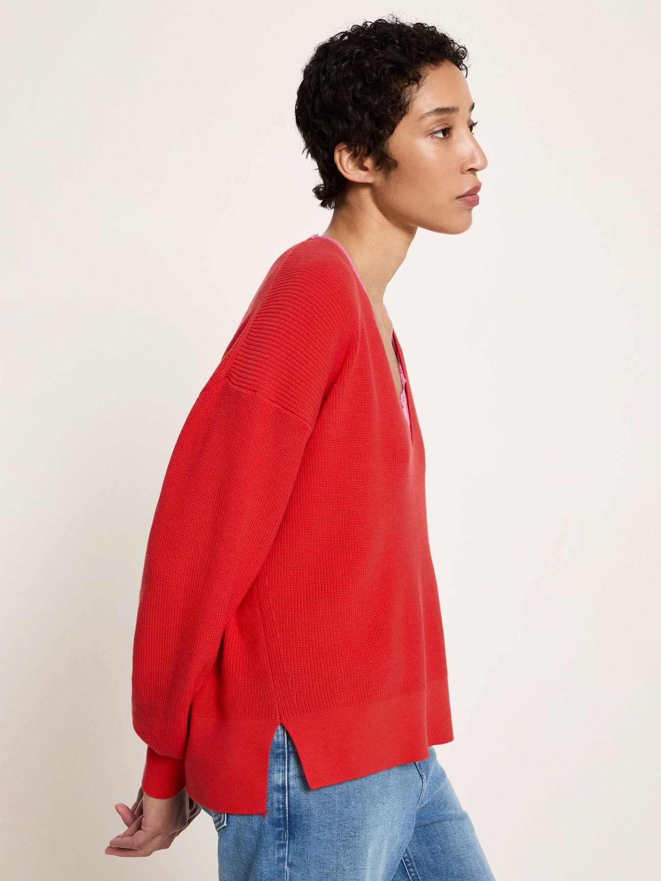 Ein echtes Essential für jede Garderobe: Unser Basic Pullover mit V-Ausschnitt aus Bio-Baumwolle ist ein zeitloser Klassiker, den man das ganze Jahr über tragen kann. Der V-Ausschnitt verleiht dem cleanen Design eine feminine Note, wirkt elegant und macht den Pullover vielseitig kombinierbar. Dank der atmungsaktiven Bio-Baumwolle fühlt sich das Material angenehm weich auf der Haut an und sorgt für ein ausgewogenes Tragegefühl – ideal für jede Saison.